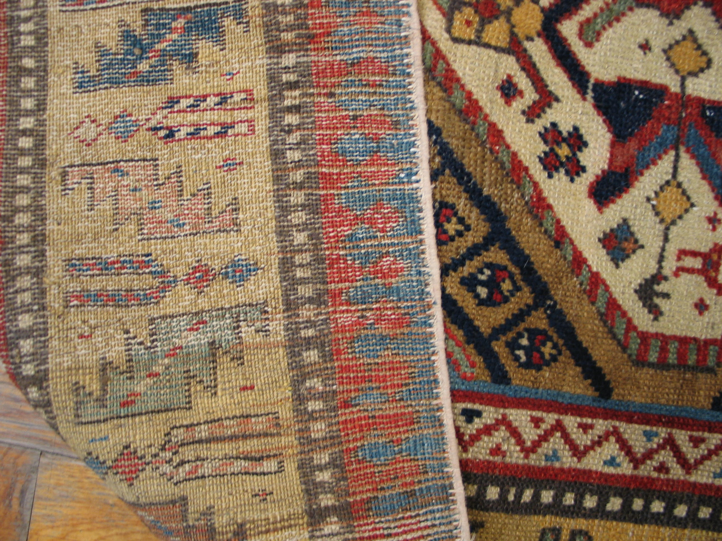 Woven entirely with hand-spun wool and natural dyes, the rug boasts a rich and varied palette. Deep madder reds, brilliant indigo blues, and striking saffron yellows combine to form the vibrant multicolor jewel tone rugs prized by collectors. The clarity of the colors speaks to the high quality of the dyes used during this specific period of antique rugs.
