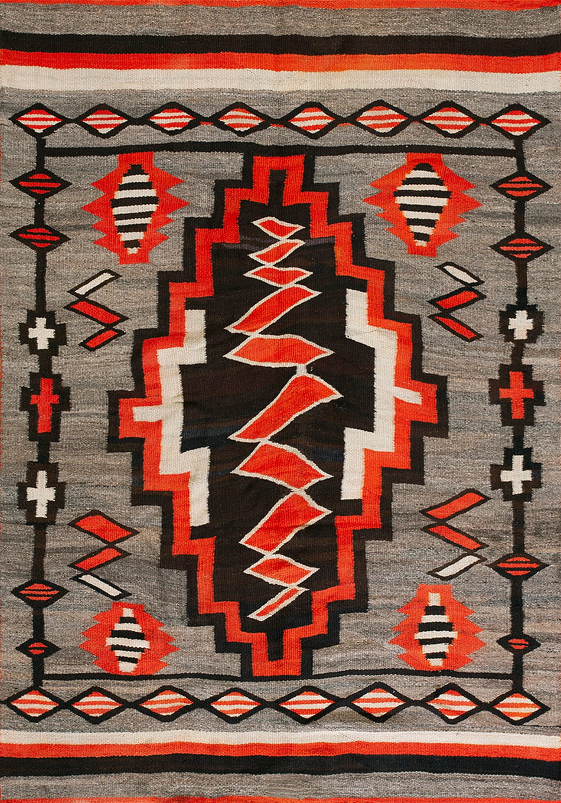 The central axis is defined by a powerful, stepped lozenge motif flanked by stylized crosses and zigzag elements, symbols deeply rooted in Southwestern iconography. As a genuine example of antique rugs from the American Southwest, this piece offers a tangible connection to the enduring artistry of the Navajo people.