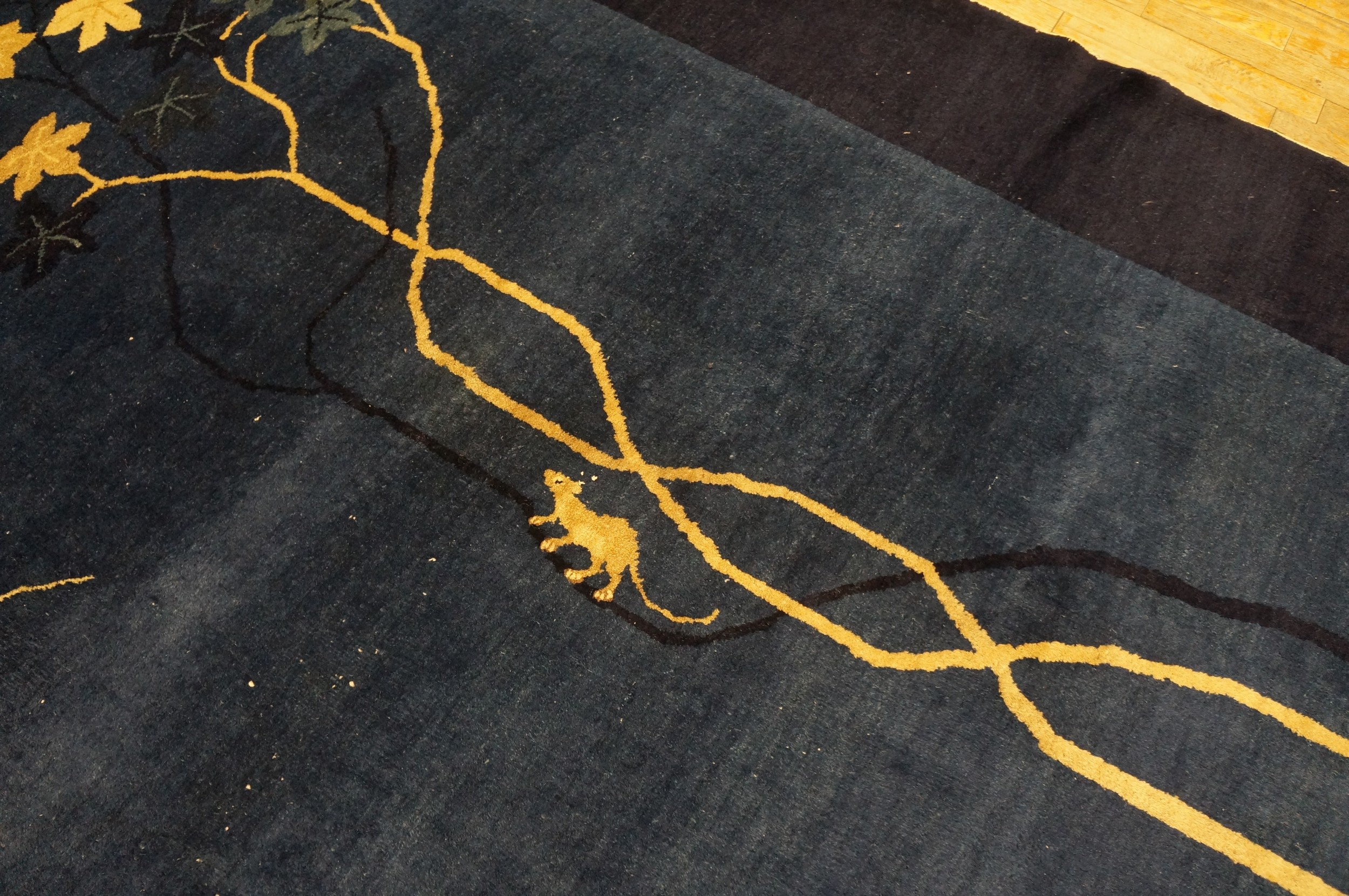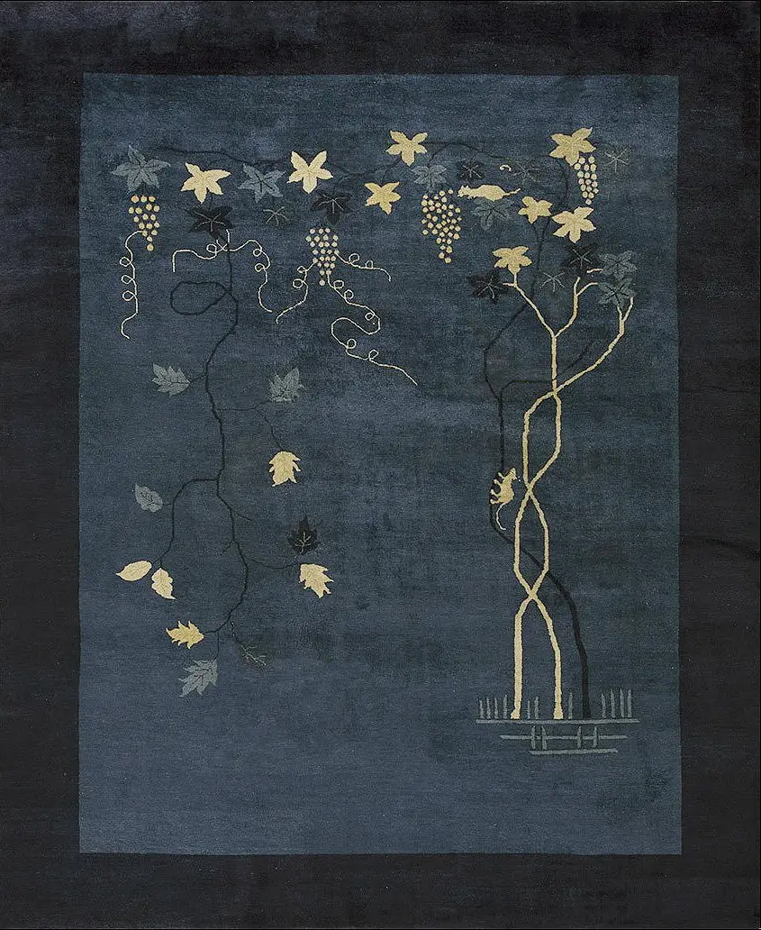 The design eschews traditional crowded patterns, instead presenting a striking, asymmetrical composition of climbing vines and grape clusters. This stylized naturalism is highly characteristic of the Peking style, merging traditional Chinese symbolism with the emerging modernism found in oriental rugs of the Art Deco movement.