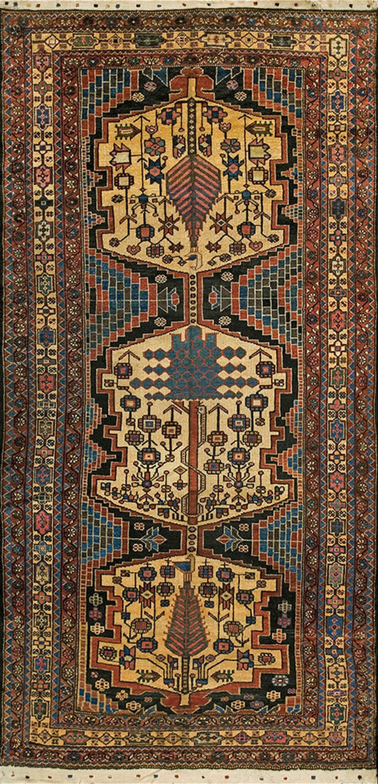 The structure of the design employs a series of stepped, geometric panels running the length of the runner. Within these panels, highly stylized interpretations of the Tree of Life motif are rendered in deep rust and blue, anchored by a warm, light brown field. This segmented approach, while visually distinct, maintains the continuous flow characteristic of allover rugs used effectively in long corridors and transitional spaces. Note: This item falls under the category of Small Scatter Size Rugs (5.0ft x 10.02ft) based on its dimensions.
