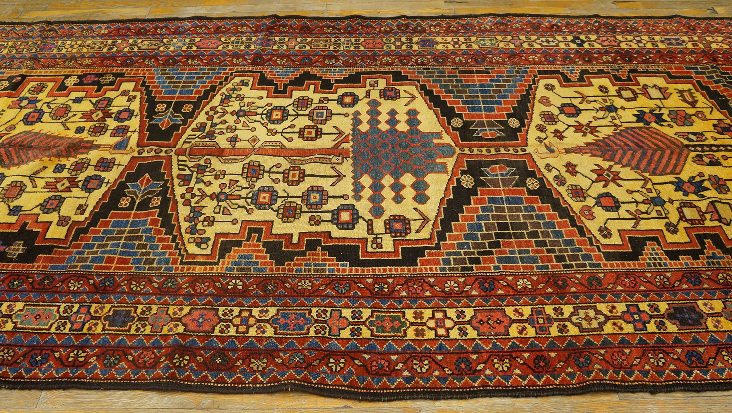 Antique Bakhtiari Hallway Runner Wool Brown Rug, Country of Origin: Iran / Persia, Circa Date: 1900s. This exceptional piece of textile art originates from the Bakhtiari tribes, renowned weavers within the tradition of Iranian Persian rugs. Characterized by robust construction and a highly geometric aesthetic, this runner exemplifies the durable and culturally rich textiles produced in the Zagros Mountains region during the early 20th century.