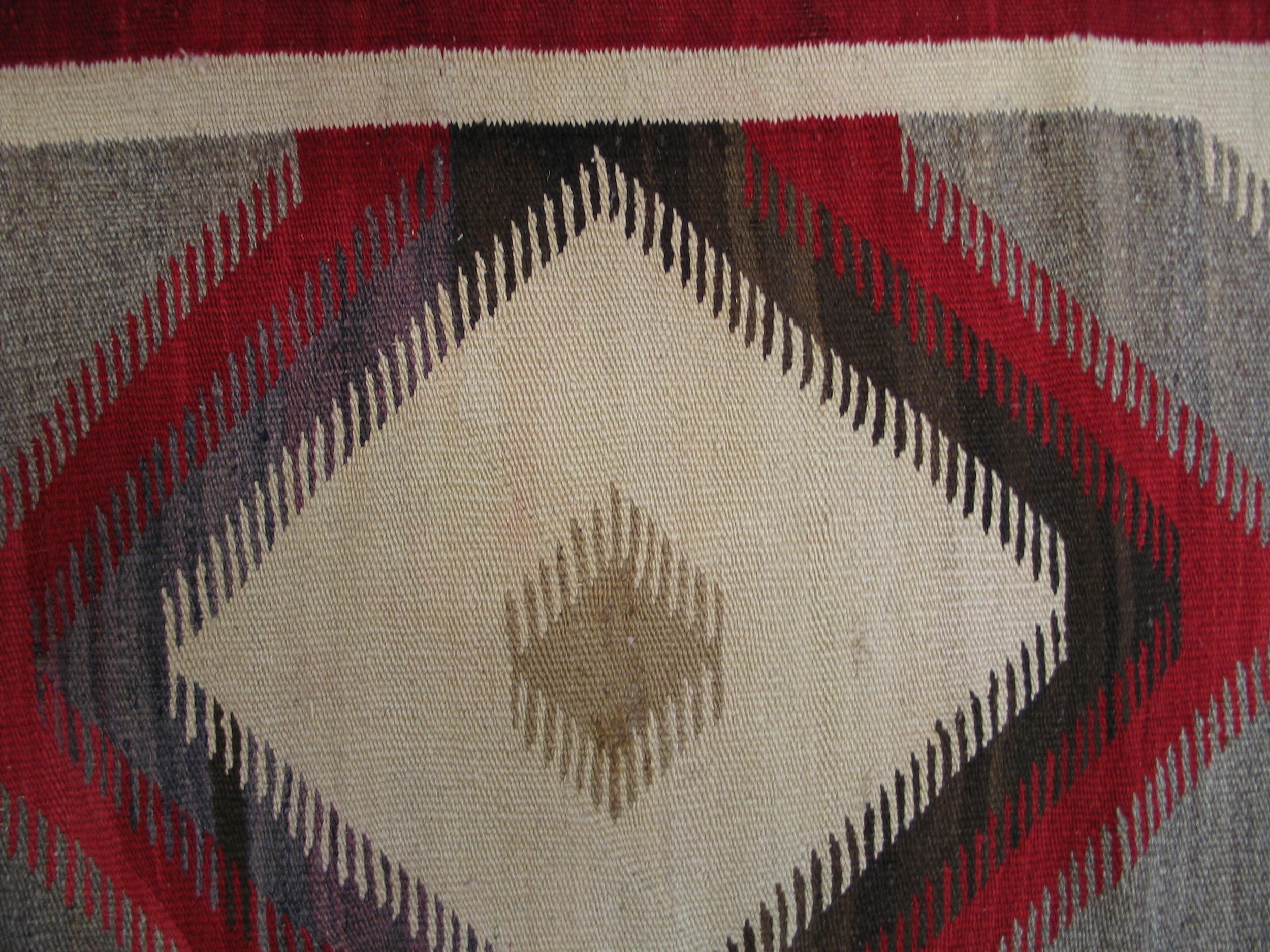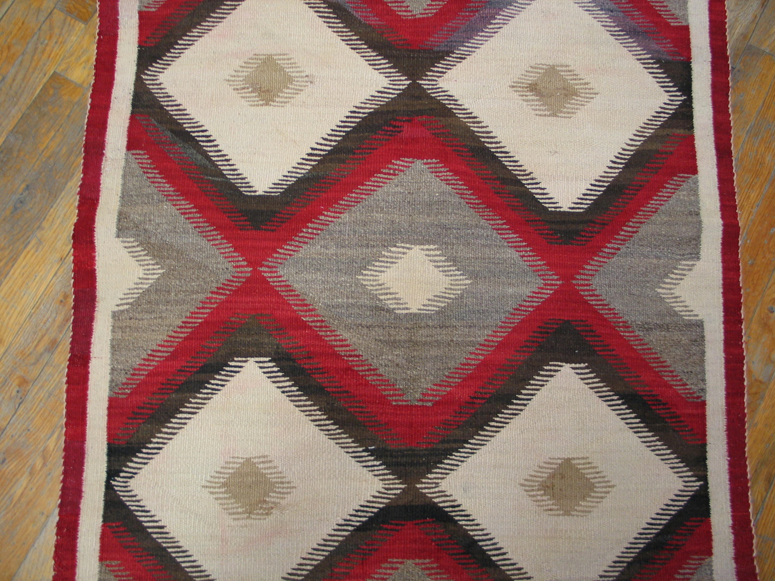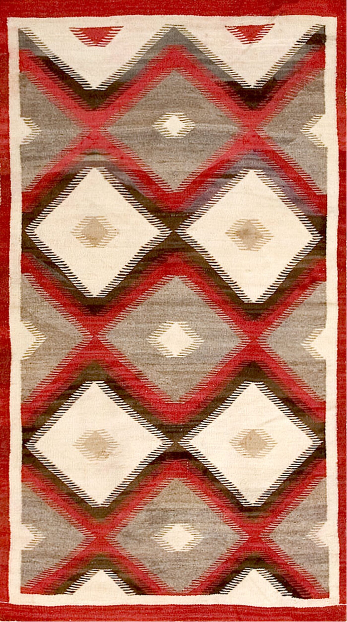 The design features a continuous series of interlocking diamond forms, creating an energetic, rhythmic allover pattern across the entire field. This dynamic structure, framed by a simple red border, confirms the rug’s status as a highly collectible example of Navajo weaving from the transitional era.
