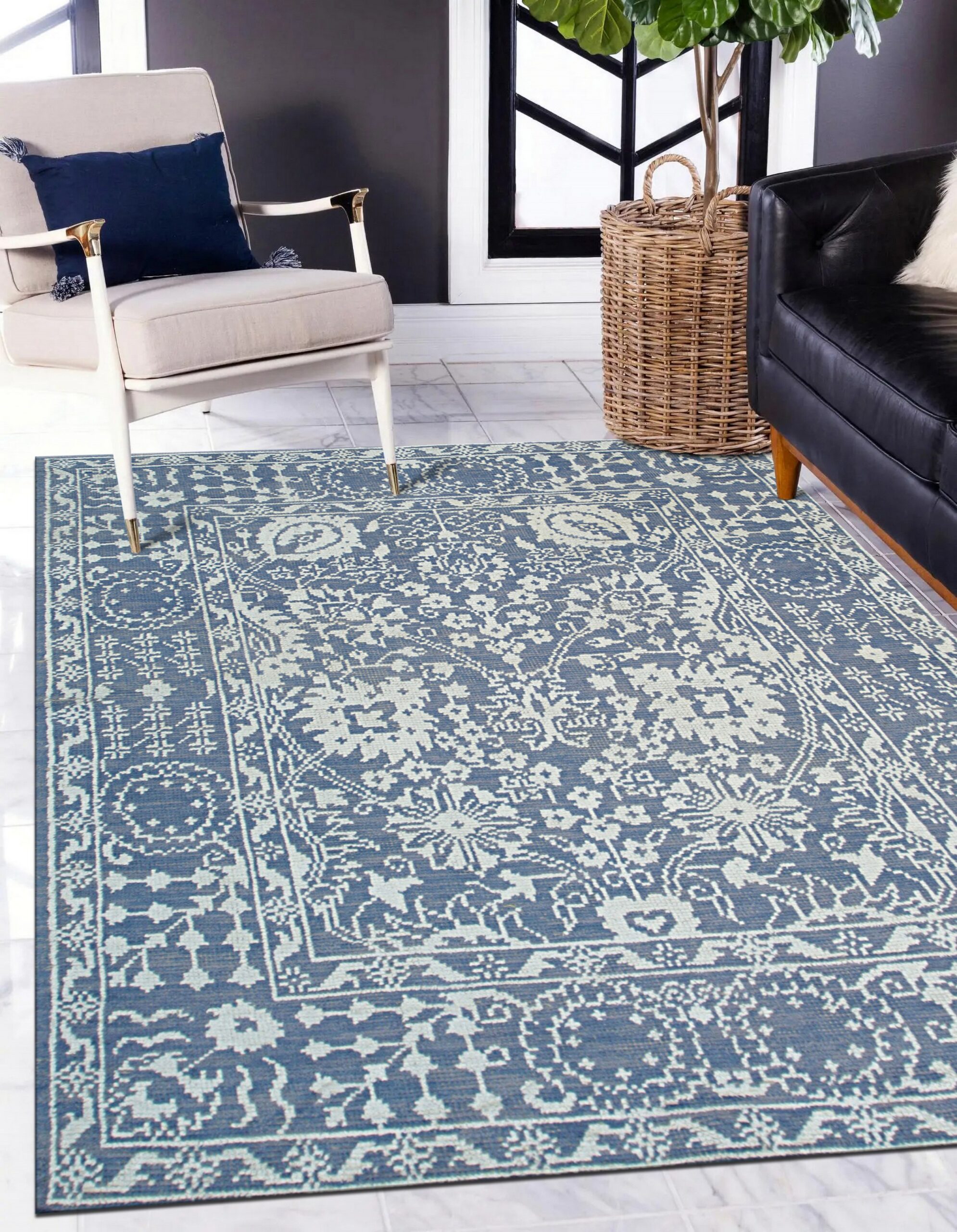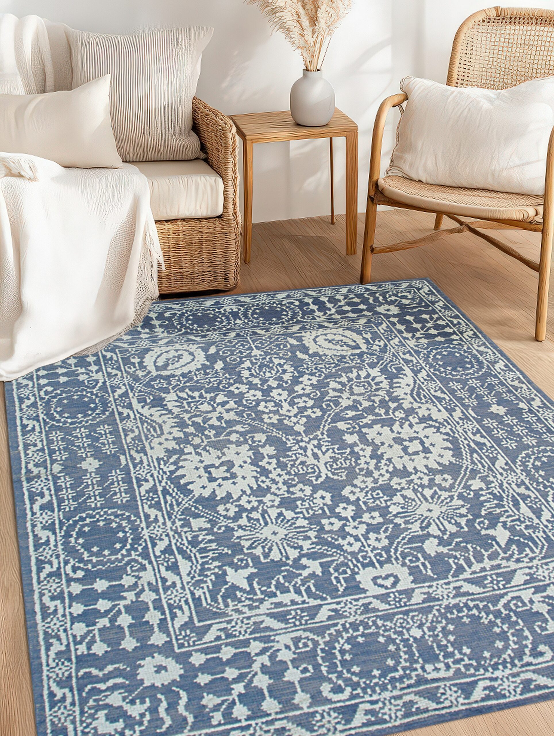 The deep indigo field provides a striking contrast to the finely rendered geometric and stylized floral motifs, echoing classic Mughal garden patterns. The sophisticated use of negative space and the saturated blue color rugs palette make this piece a timeless foundation for contemporary or traditional interiors, offering a calming yet authoritative presence.