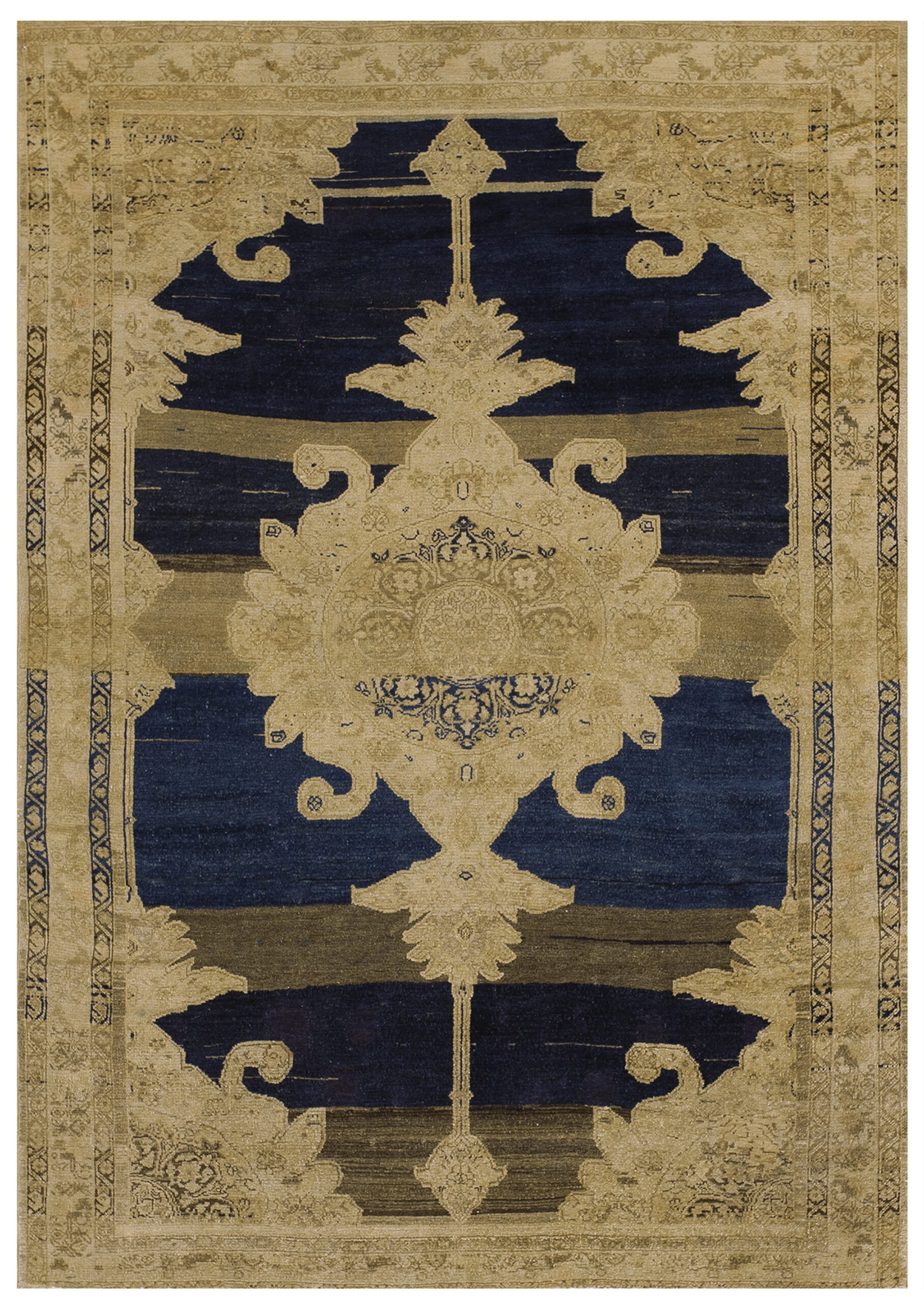 Within the expansive central motif, intricate detailing reveals highly stylized palmettes and delicate vines, characteristic of traditional Persian weaving. While the overall composition is bold and architectural, the fine interior drawing utilizes traditional floral rugs elements, softening the geometry of the main design.