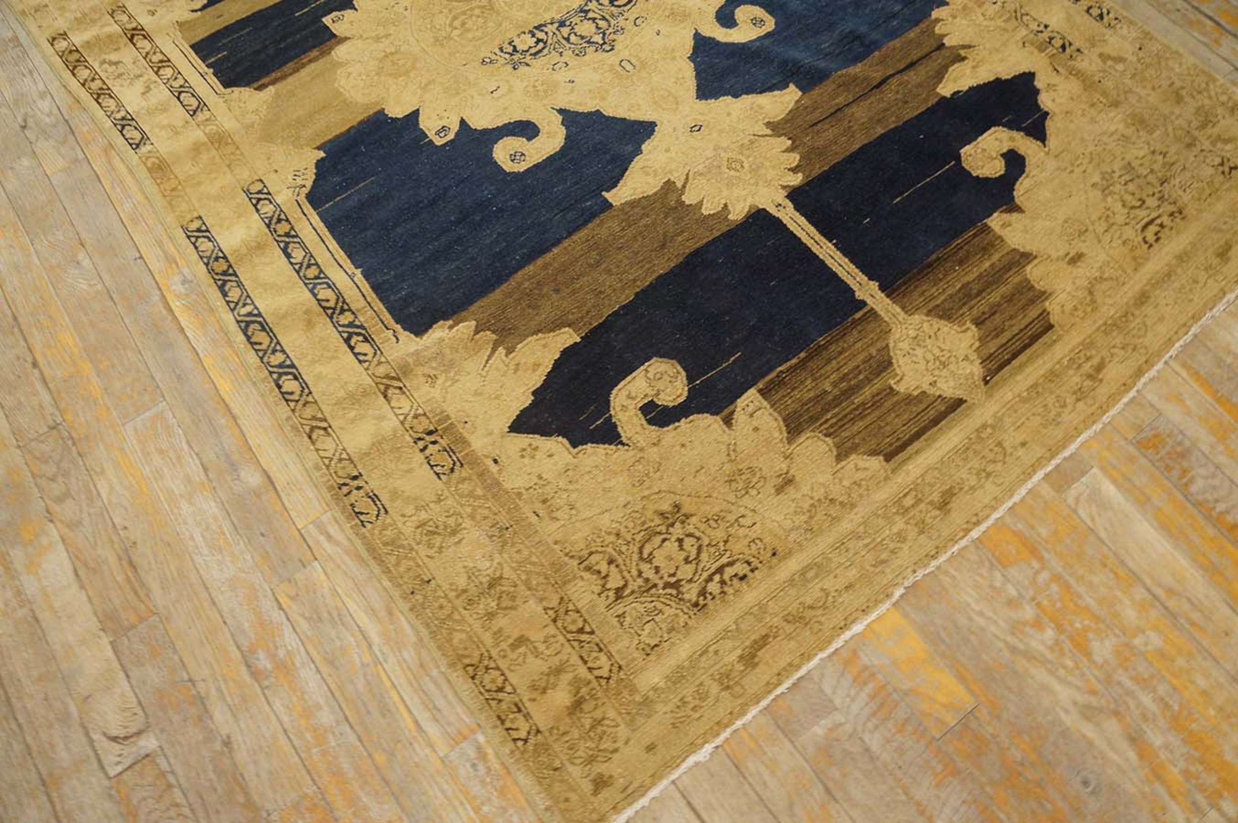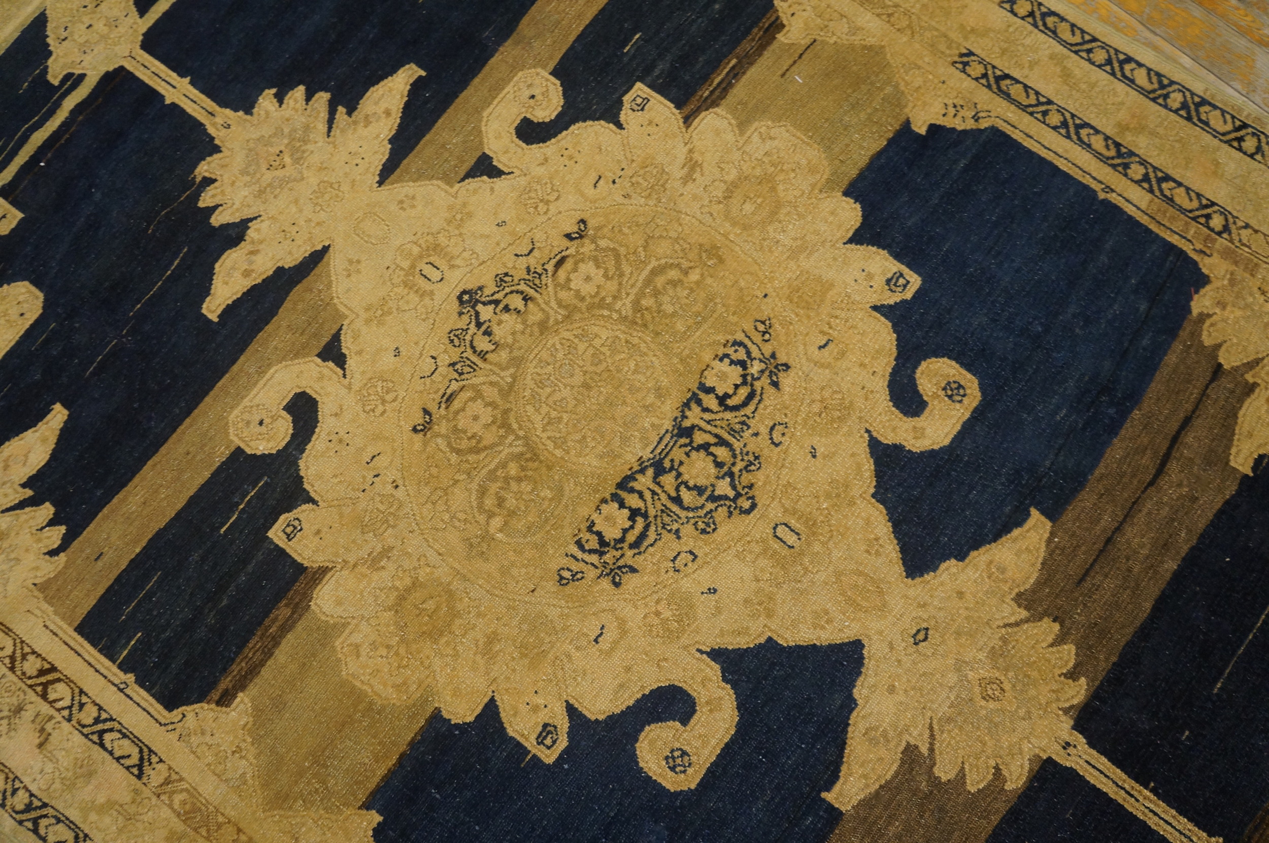 Antique Malayer Persian Blue 1900s Rug, Circa Date: 1900s. This striking West Persian weaving showcases the robust craftsmanship typical of Malayer production. The design is dominated by a powerful, oversized central cartouche rendered in warm khaki tones, dramatically set against a field of deep indigo. This piece is a superb example of antique rugs from the turn of the century.