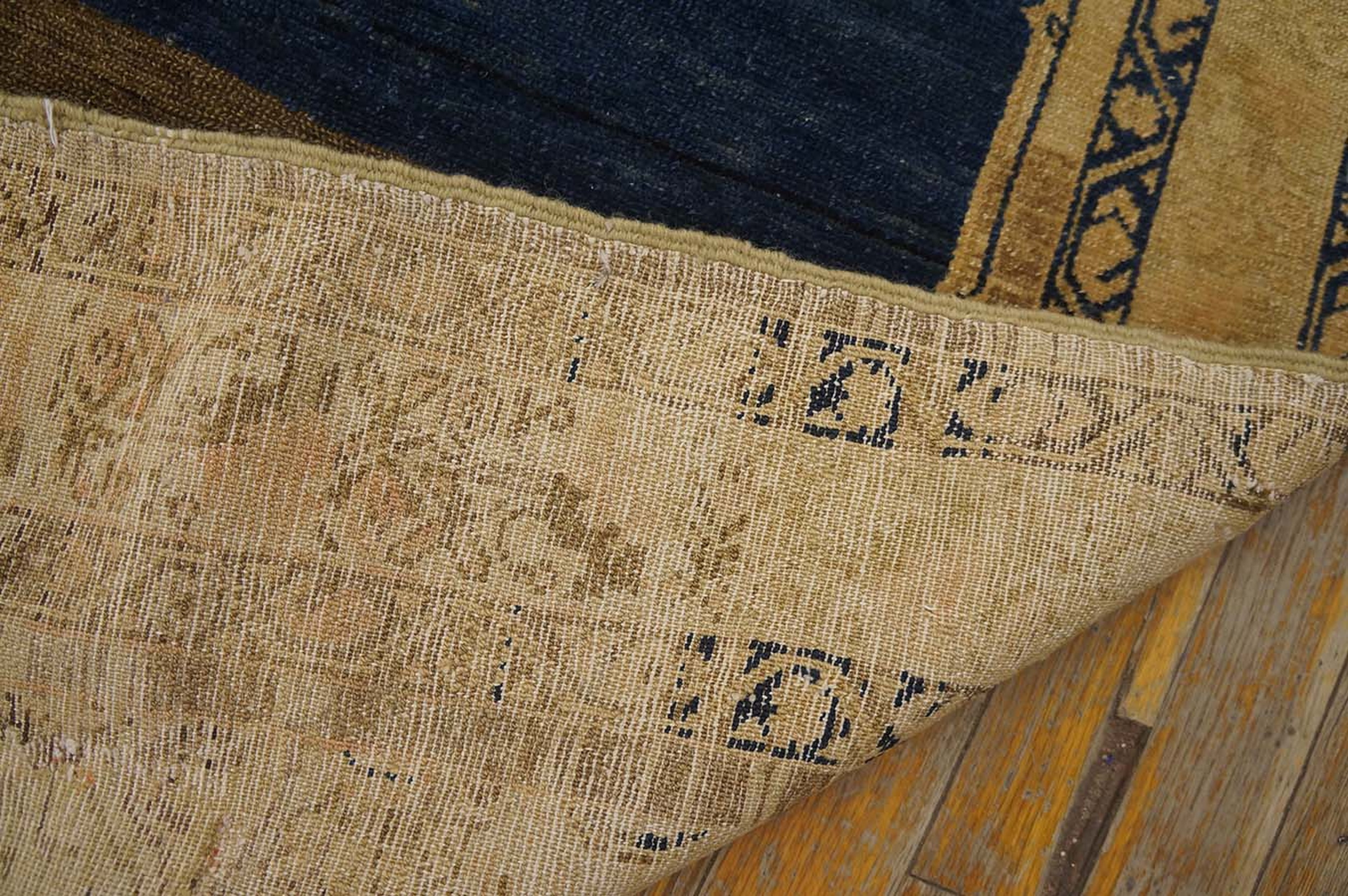The field design is particularly unusual, featuring horizontal bands of olive-khaki alternating with the primary navy ground, lending the piece a unique, almost modern, striated appearance. The depth and saturation of the primary dye palette elevate this weaving beyond typical scatter pieces, making it a compelling study in blue color rugs.