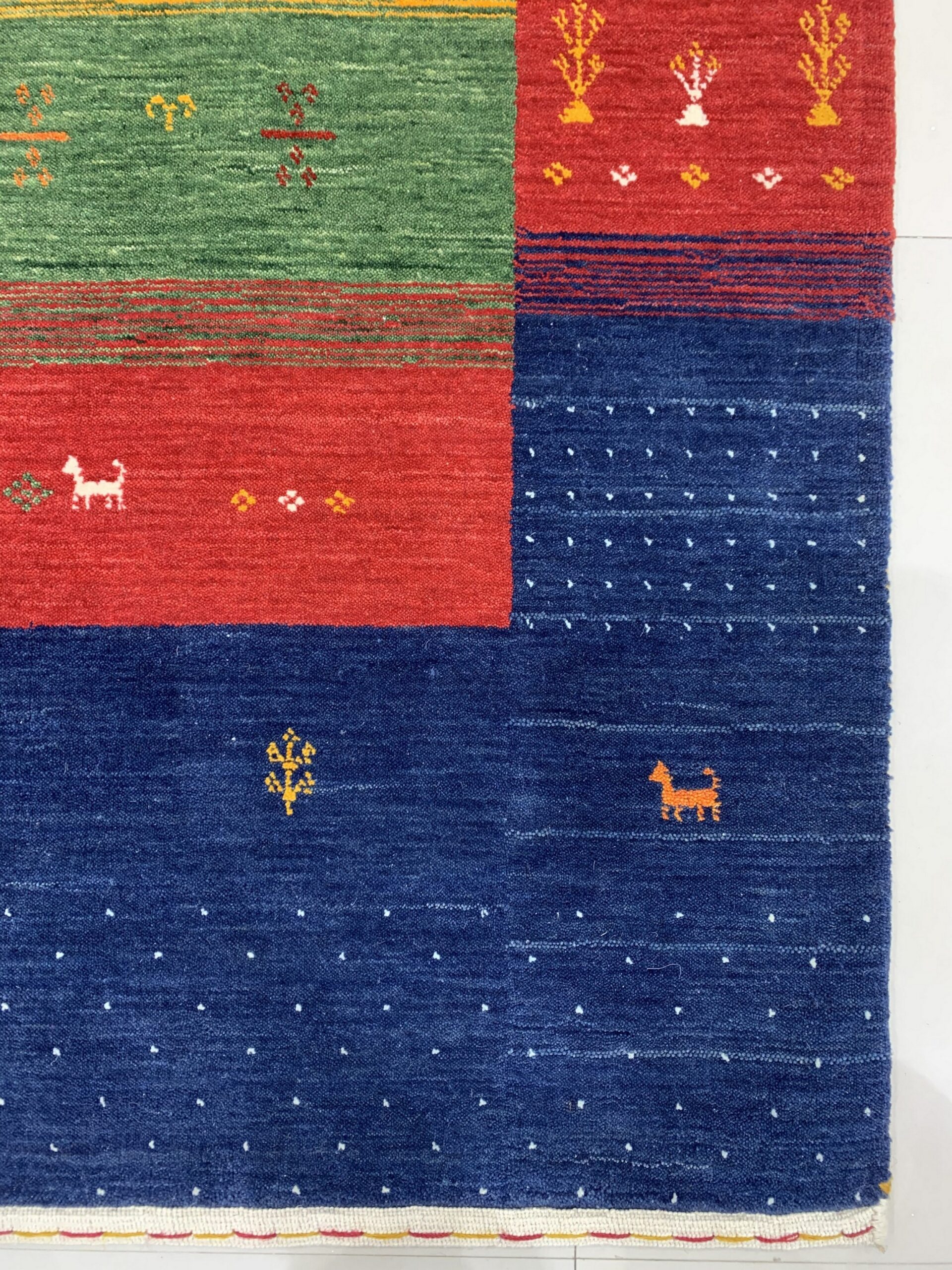 The design employs a striking banded structure, where large blocks of saturated color are punctuated by small, stylized animal and tree motifs, typical of the Gabbeh aesthetic. The use of the central navy hue anchors the entire composition, providing depth and sophistication. This deep indigo tone is highly sought after, reflecting the enduring appeal of blue color rugs in both traditional and transitional interiors.