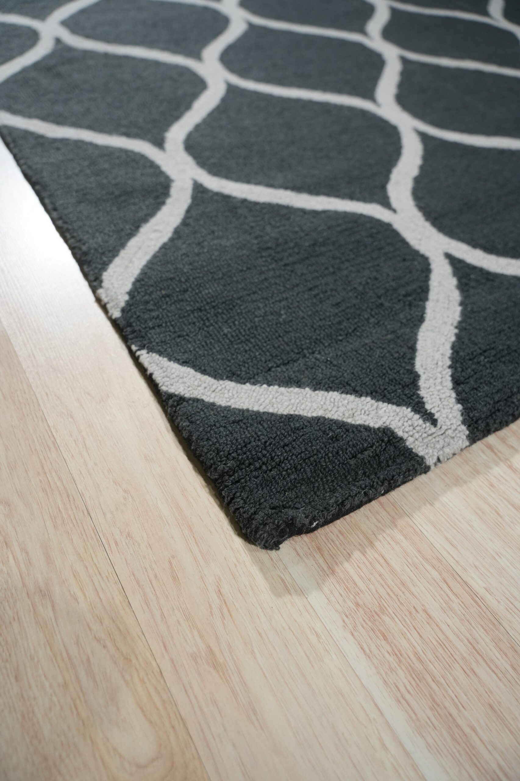 The design features a bold, repeating ogee trellis pattern rendered in crisp white against a deep, textural charcoal field. This high-contrast graphic approach ensures the rug acts as a focal point in any room. The commanding presence of the dark palette makes this a premier choice among black color rugs.