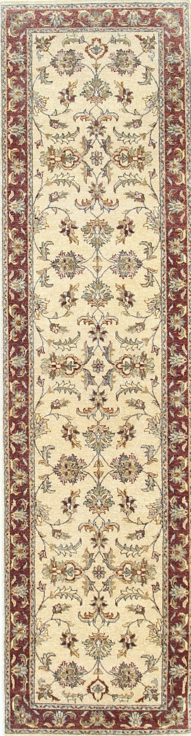 A classic all-over pattern of scrolling vines and stylized palmettes fills the central area, framed by a striking, wide border in rich rust red. This traditional layout is highly adaptable, and depending on the size, this design is particularly effective in defining long corridors or entryways, often found in our selection of hallway runner rugs.