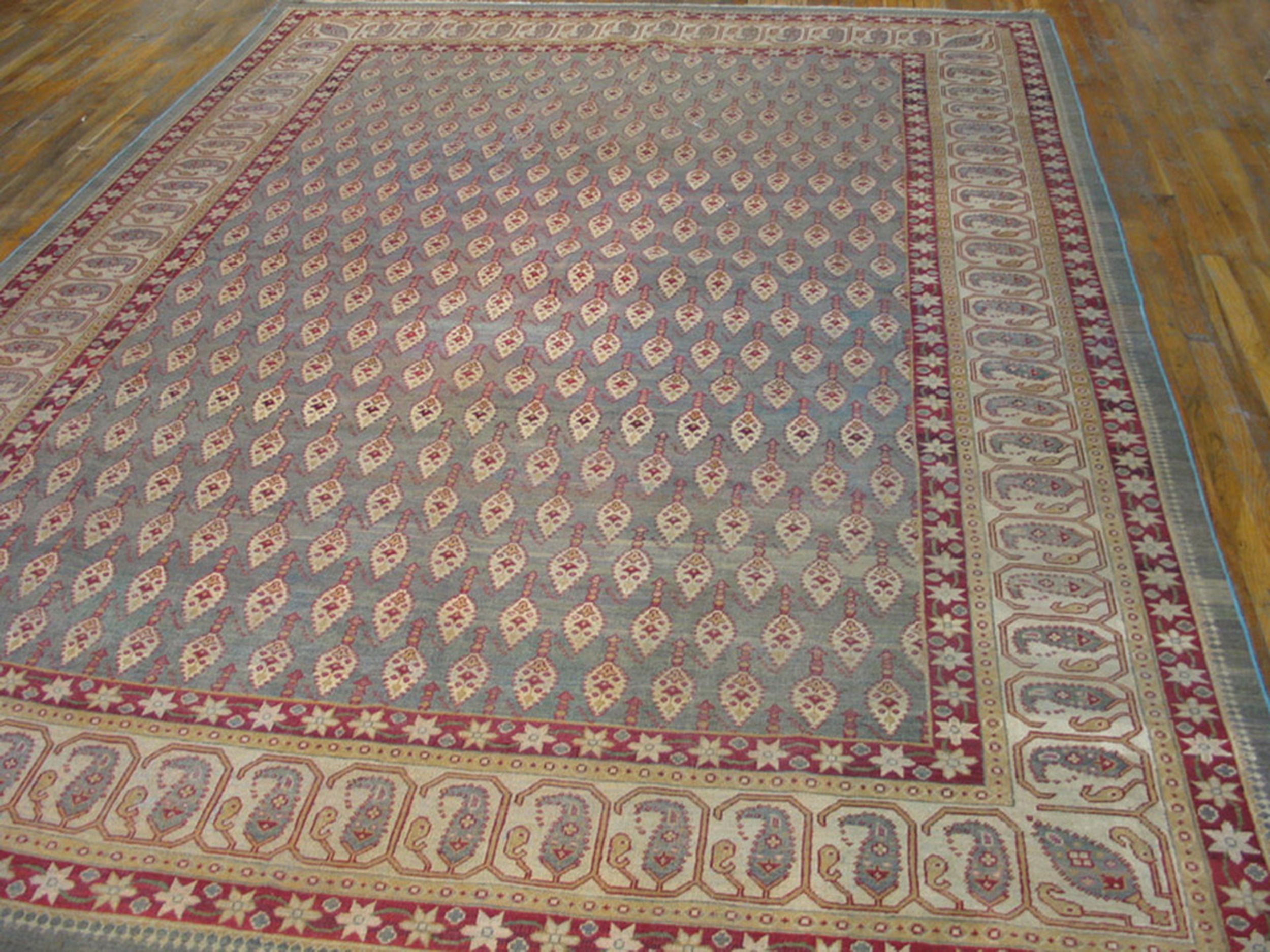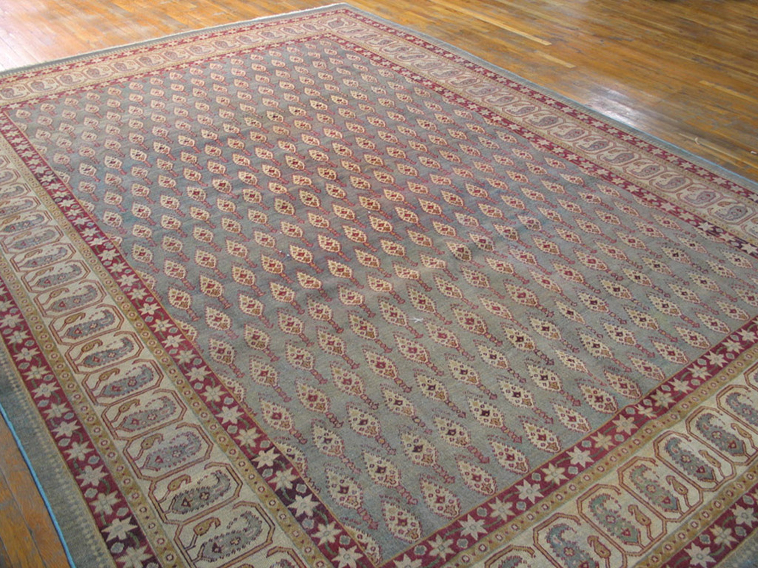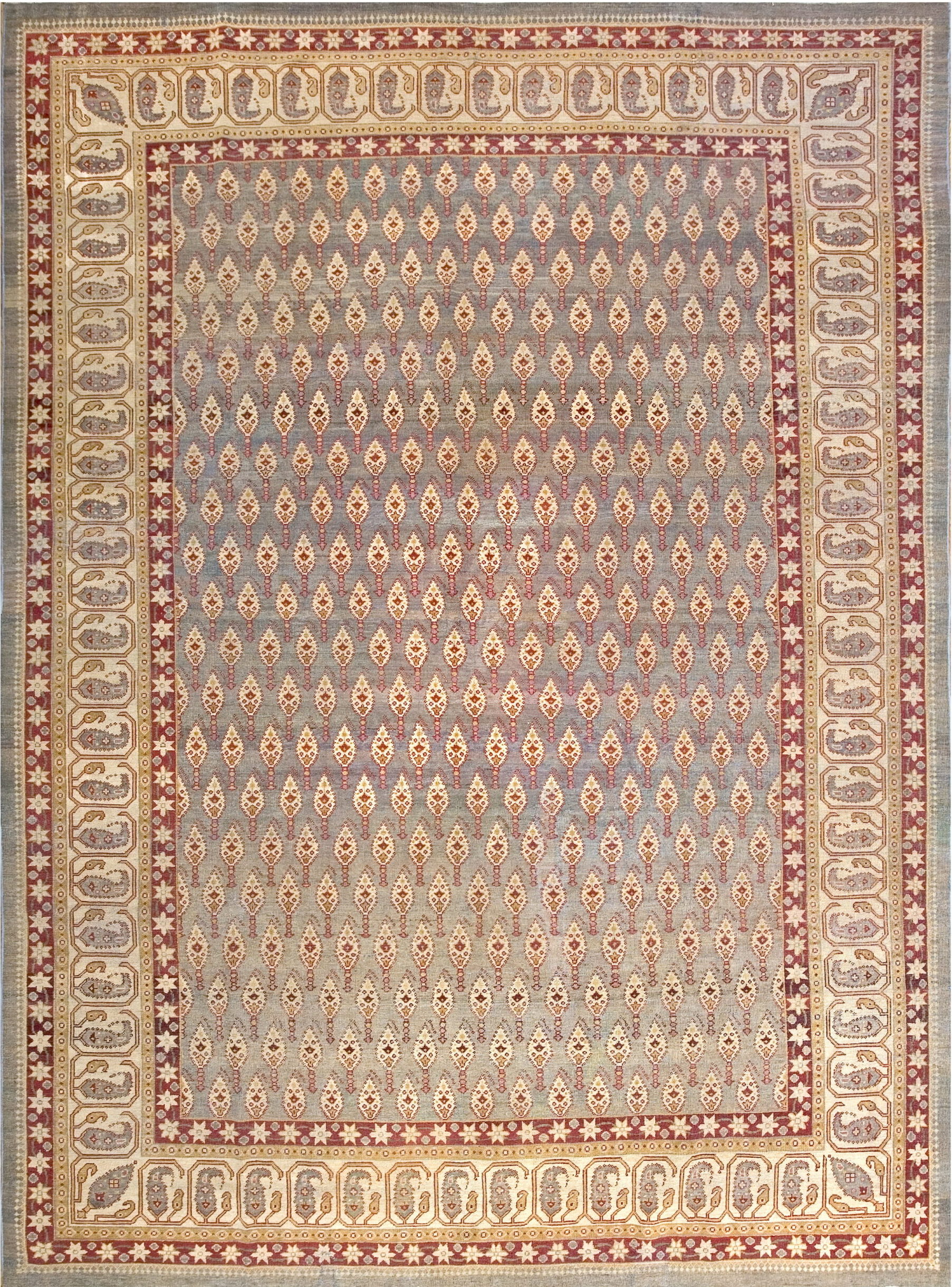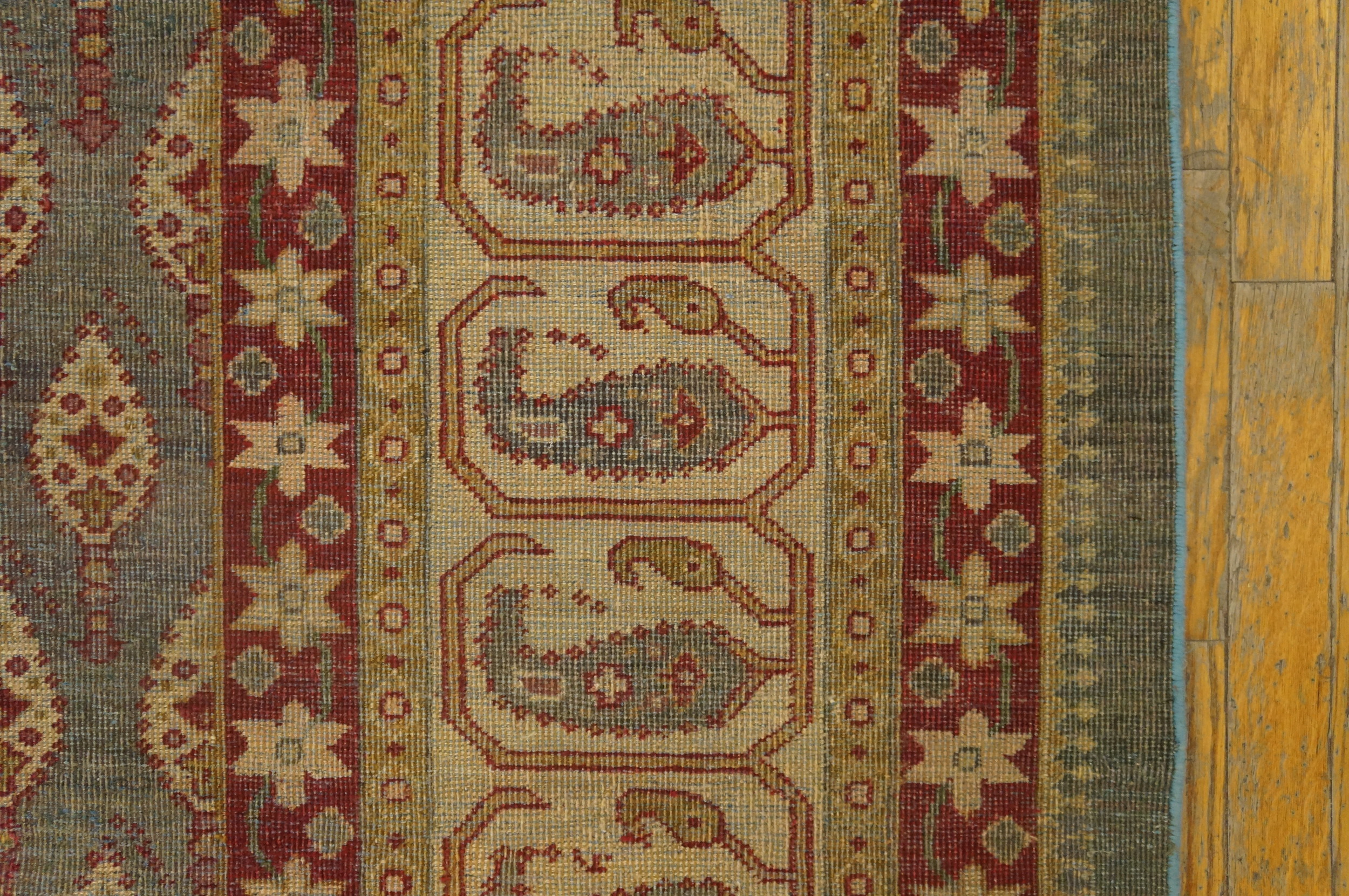 The central field features a meticulously rendered, repeating boteh pattern, characteristic of the finest Persian designs adapted by Indian weavers. This dense, continuous layout establishes the rug as a classic example of allover rugs, ensuring visual balance regardless of furniture placement. The rhythm of the design draws the eye without overwhelming the space.