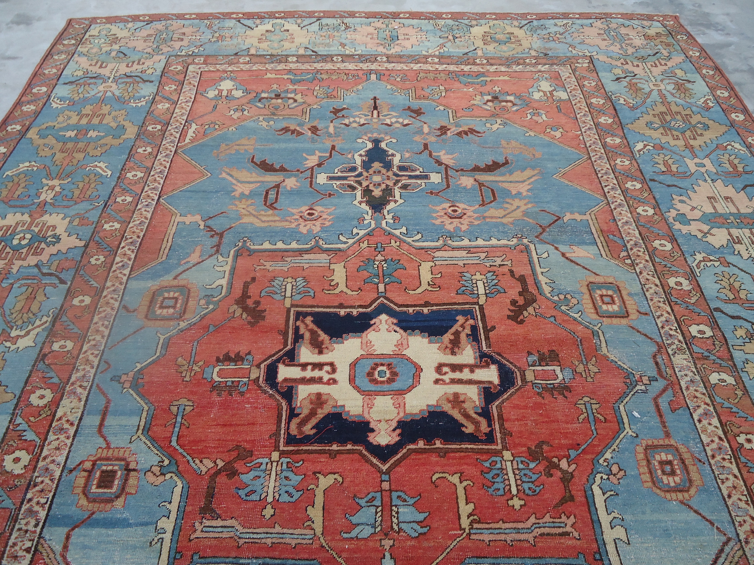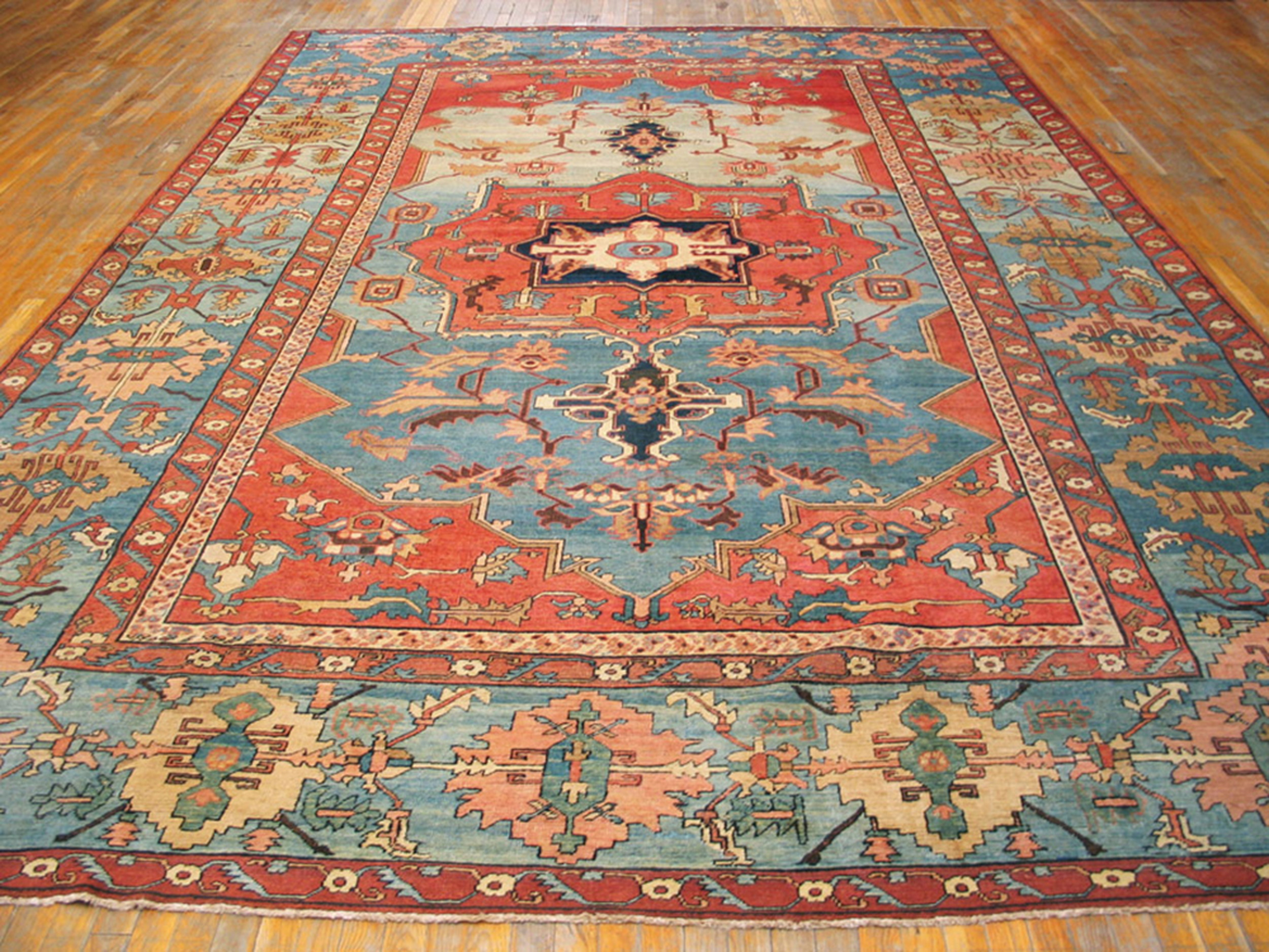 The commanding central medallion features powerful serrated edges rendered in rich terracotta and deep indigo, contrasted against a field dominated by a spectacular, faded sky blue coloration. This specific palette, combined with the bold, angular motifs, is characteristic of the highly sought-after Serapi style, distinguishing it from neighboring Heriz weavings.