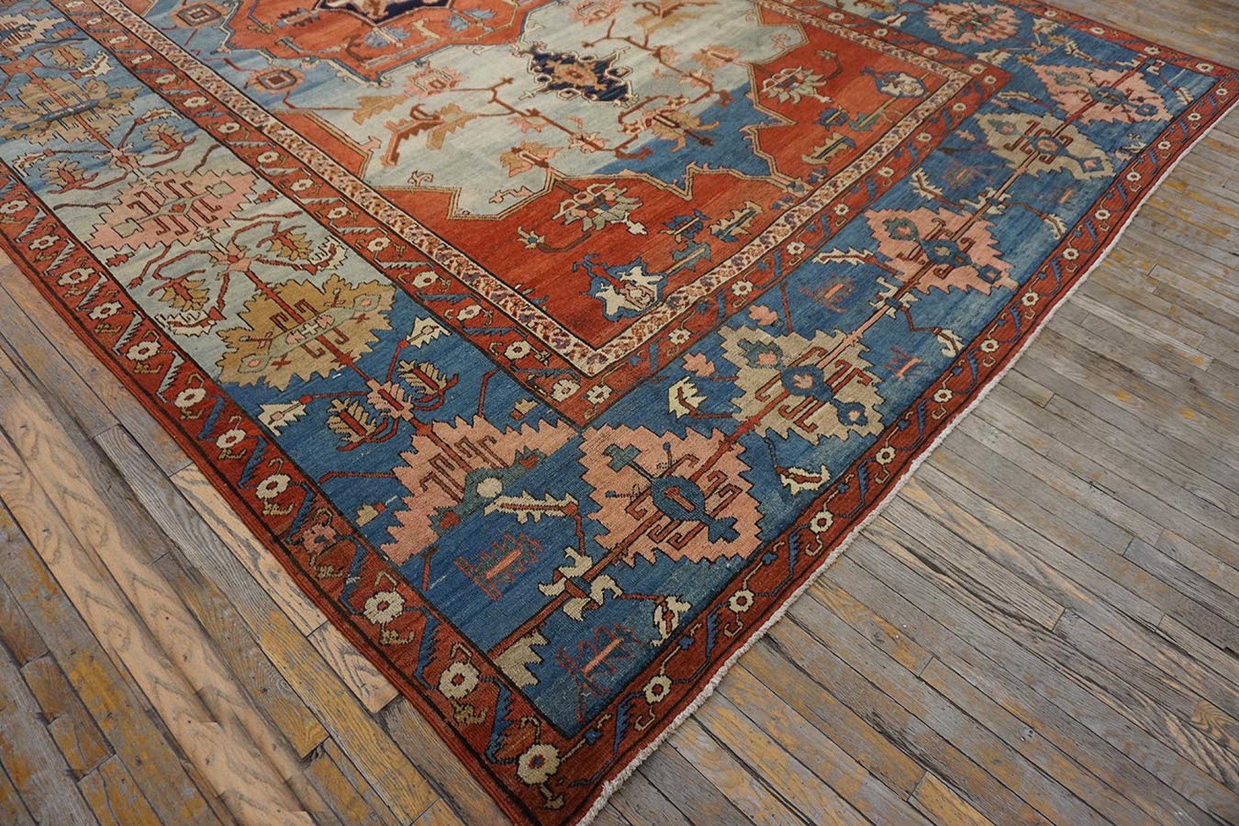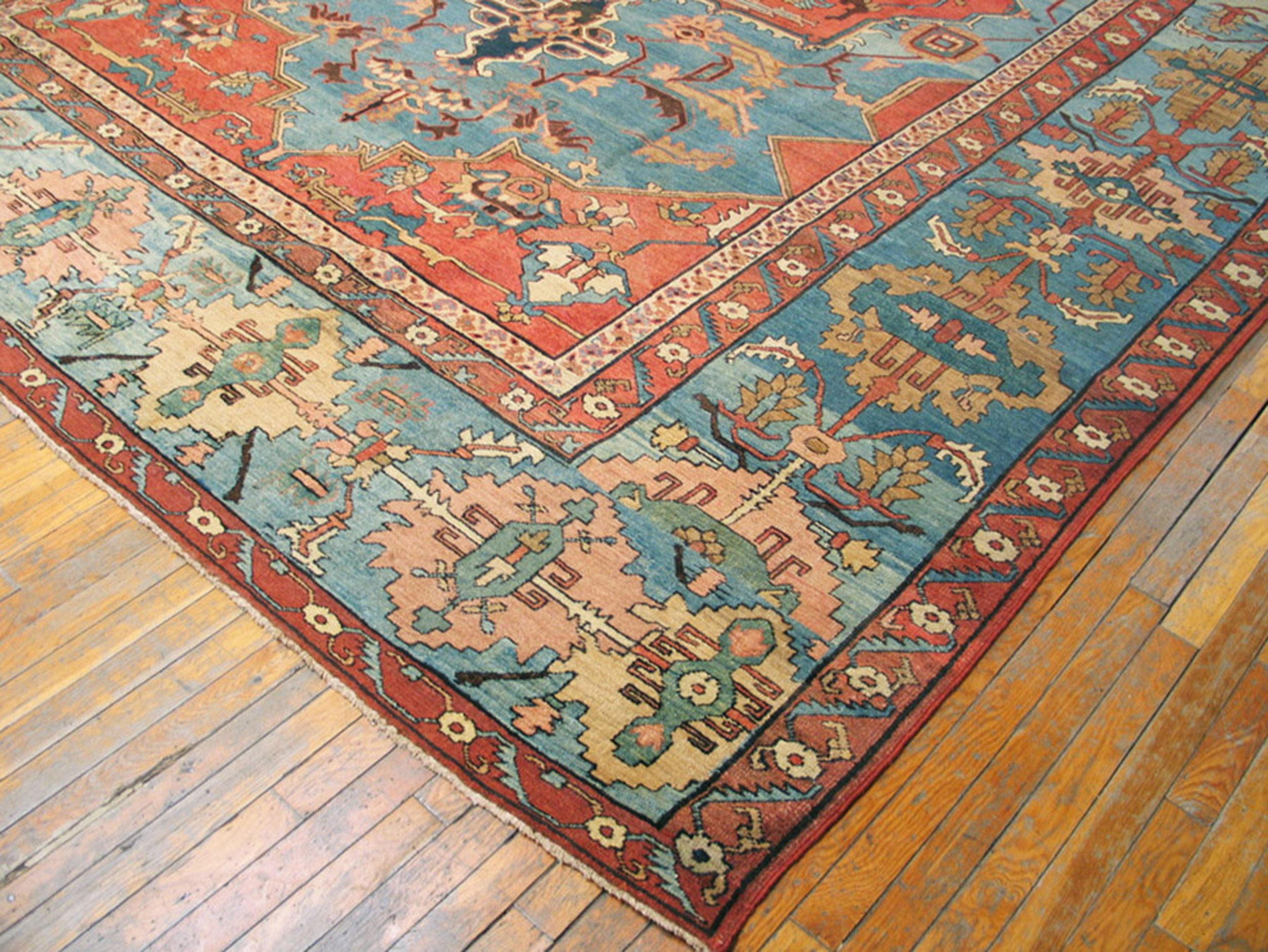 Antique Serapi Large Room Size Wool Blue Rug, Country of Origin: Iran / Persia, Circa Date: 1880s. This exceptional example of weaving artistry originates from the highly respected region of Northwest Iranian / Persian production. Its robust wool foundation and striking geometric design immediately place it among the finest examples of late 19th-century craftsmanship.