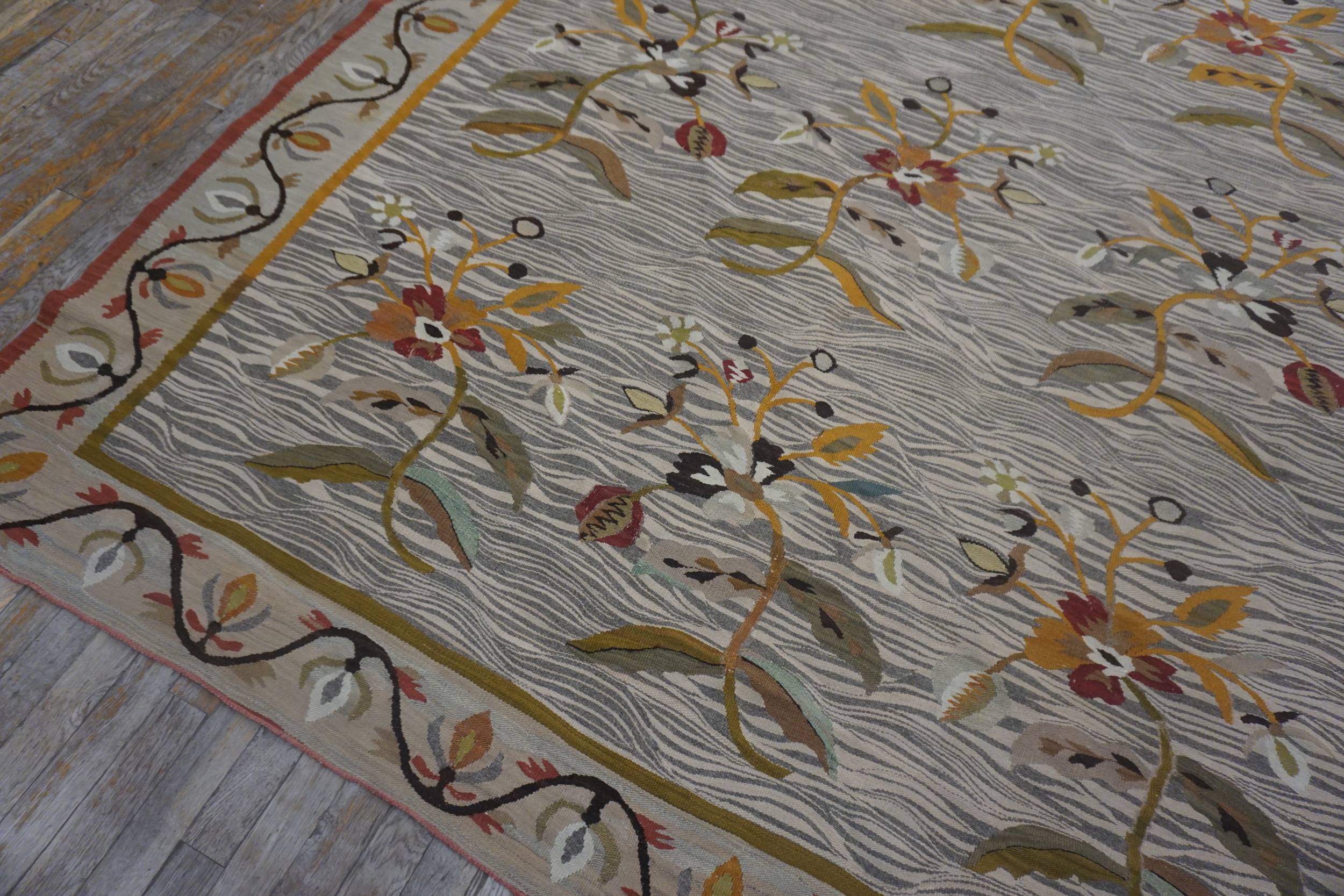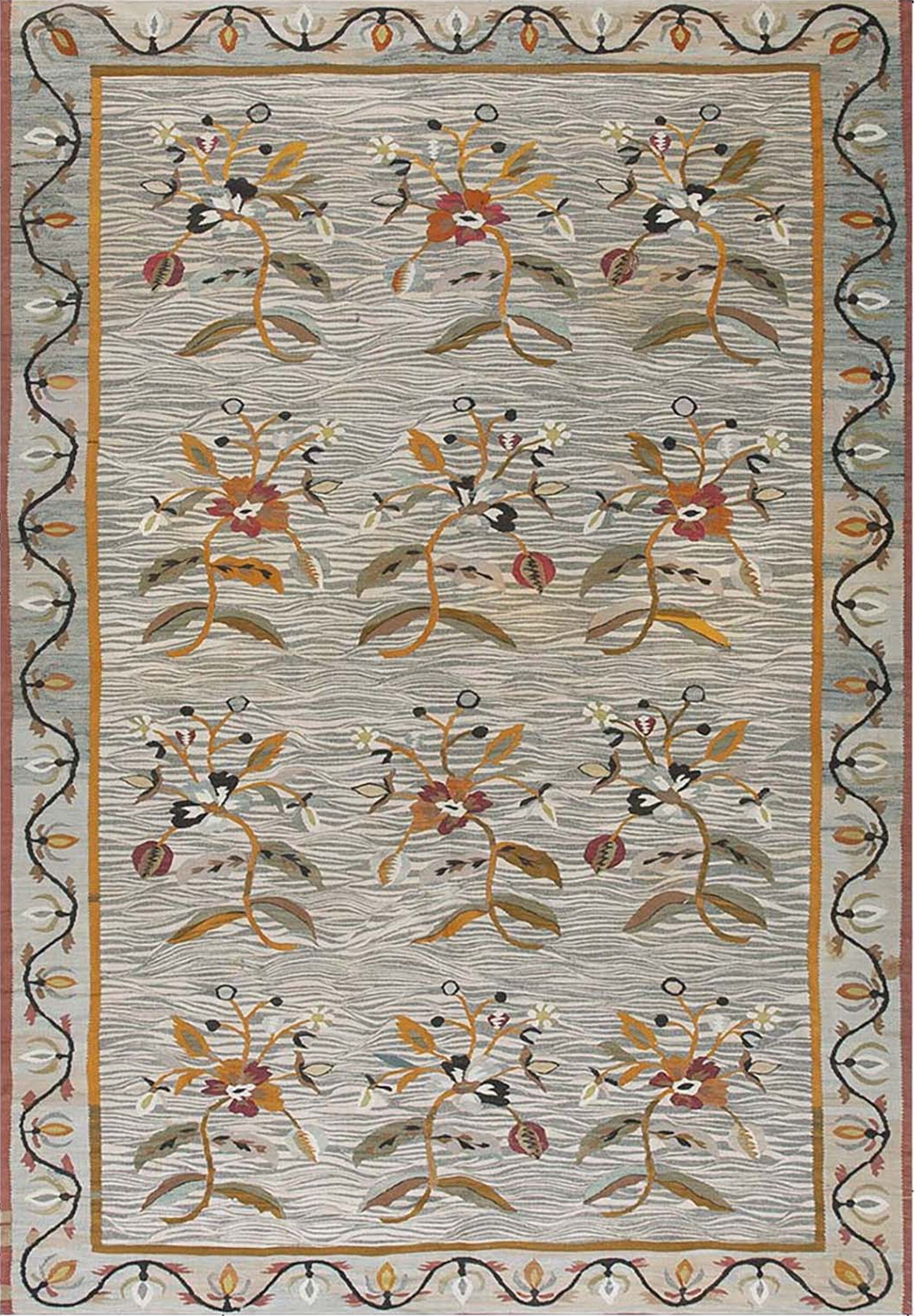 Antique Allover Floral Wool Flat Weave Gray 1900s Rug, Circa Date: 1900s. This exceptional flat weave piece, likely of Bessarabian or Eastern European origin, presents a striking example of early 20th-century decorative textiles. The sophisticated palette centers on a soft, undulating field, providing a serene backdrop for the vibrant botanical elements, achieved through a subtle use of gray color rugs and taupe hues.