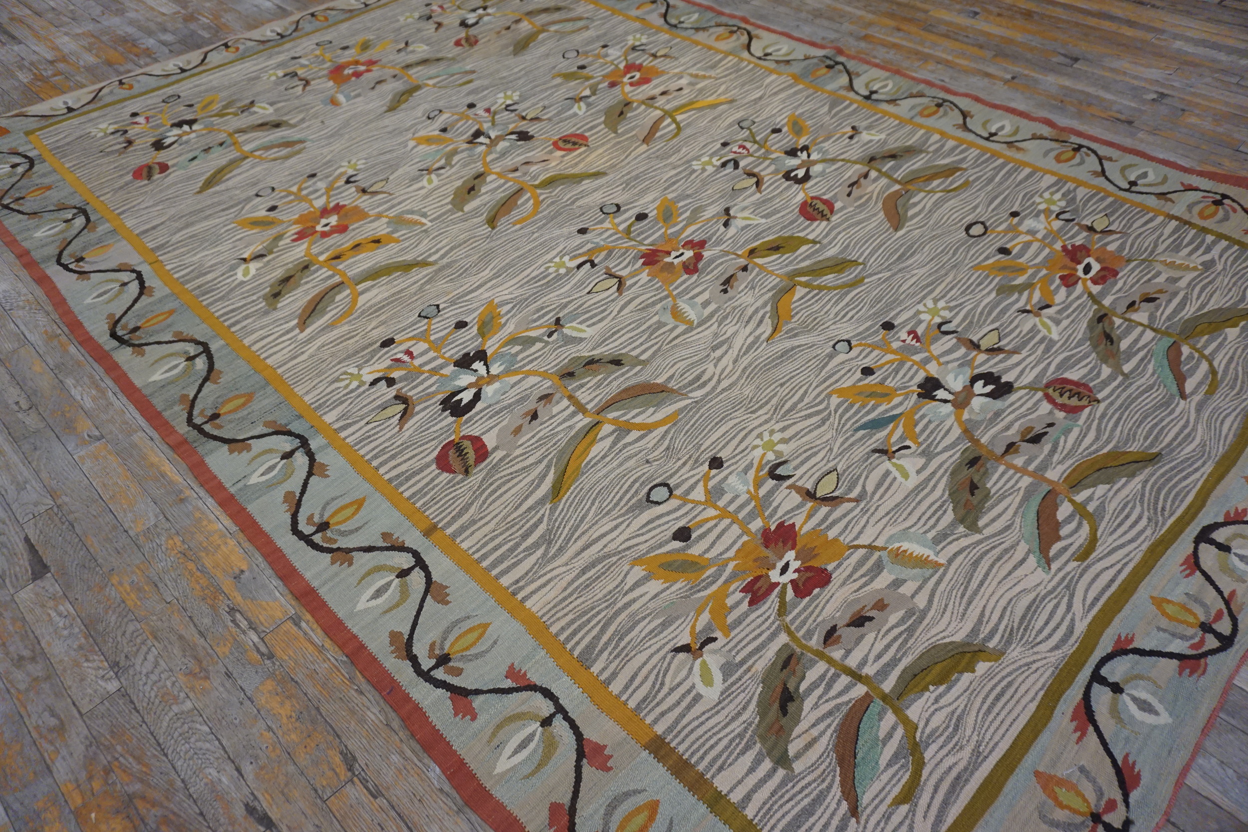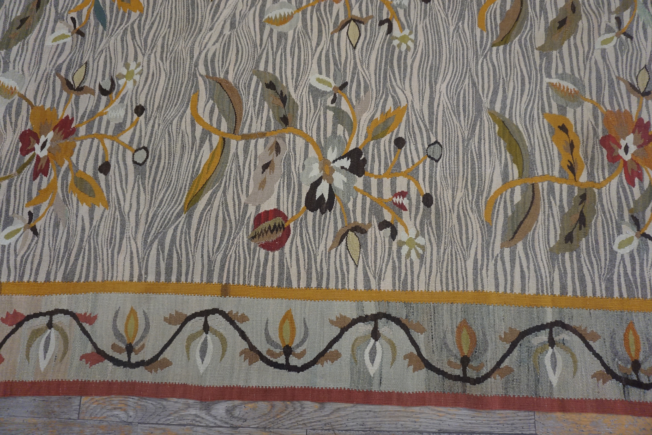 Such pieces represent a refined moment in European weaving history, blending traditional folk art with sophisticated decorative taste. This particular specimen retains remarkable clarity of color and structure, making it a valuable addition to any collection of fine antique rugs and period textiles.