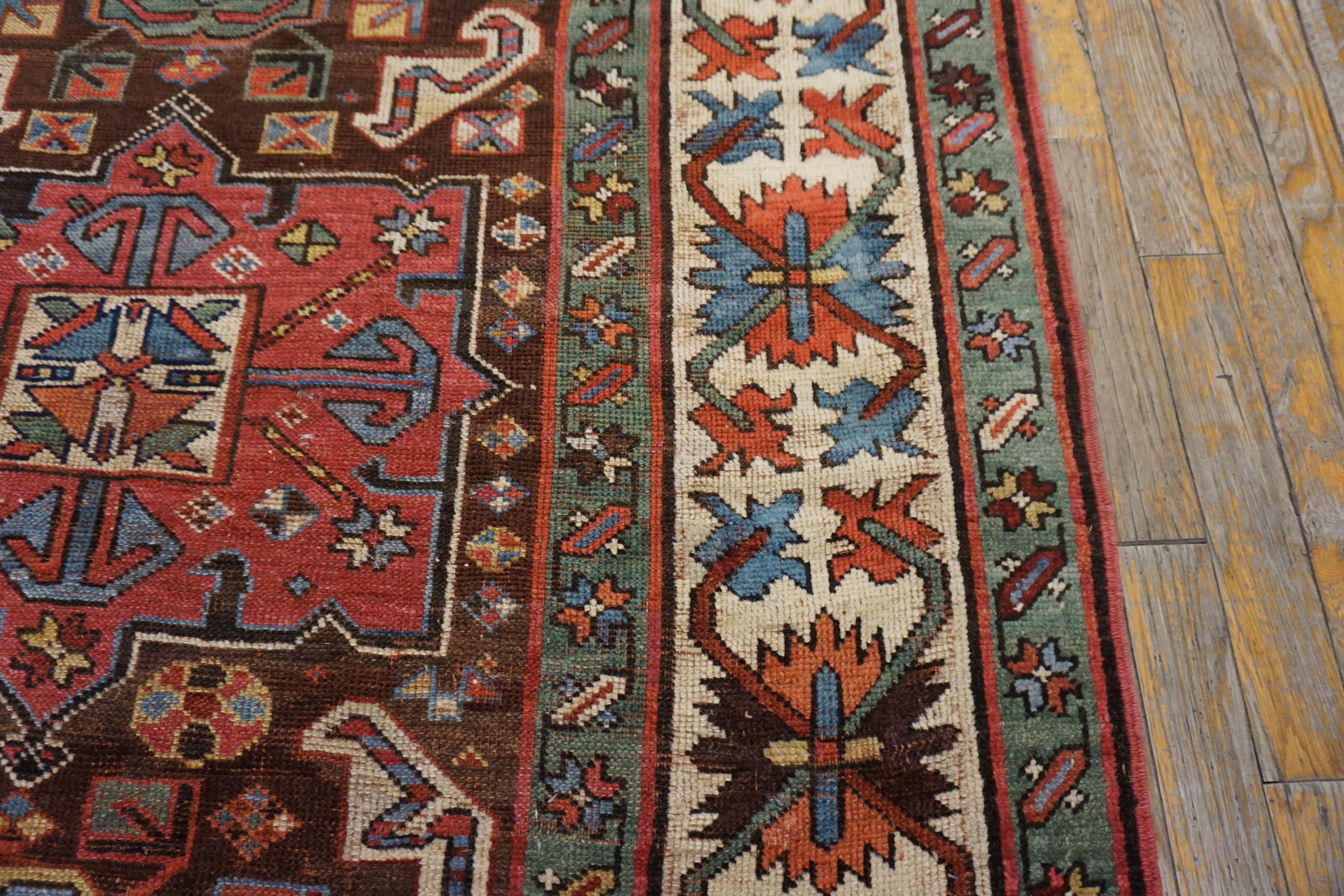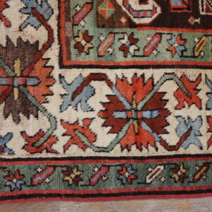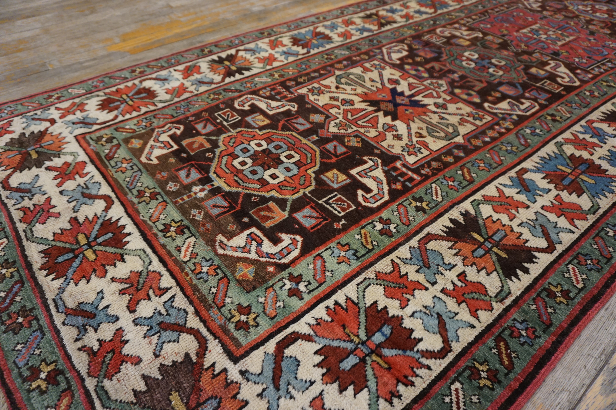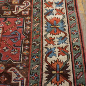 The narrow field is anchored by a rich, almost aubergine brown earth tone, providing a dramatic contrast to the vibrant geometric motifs. These powerful tribal designs—executed in madder red, indigo blue, and soft ivory—are tightly packed, creating a mesmerizing visual density typical of the best Karabagh or Kazak production.