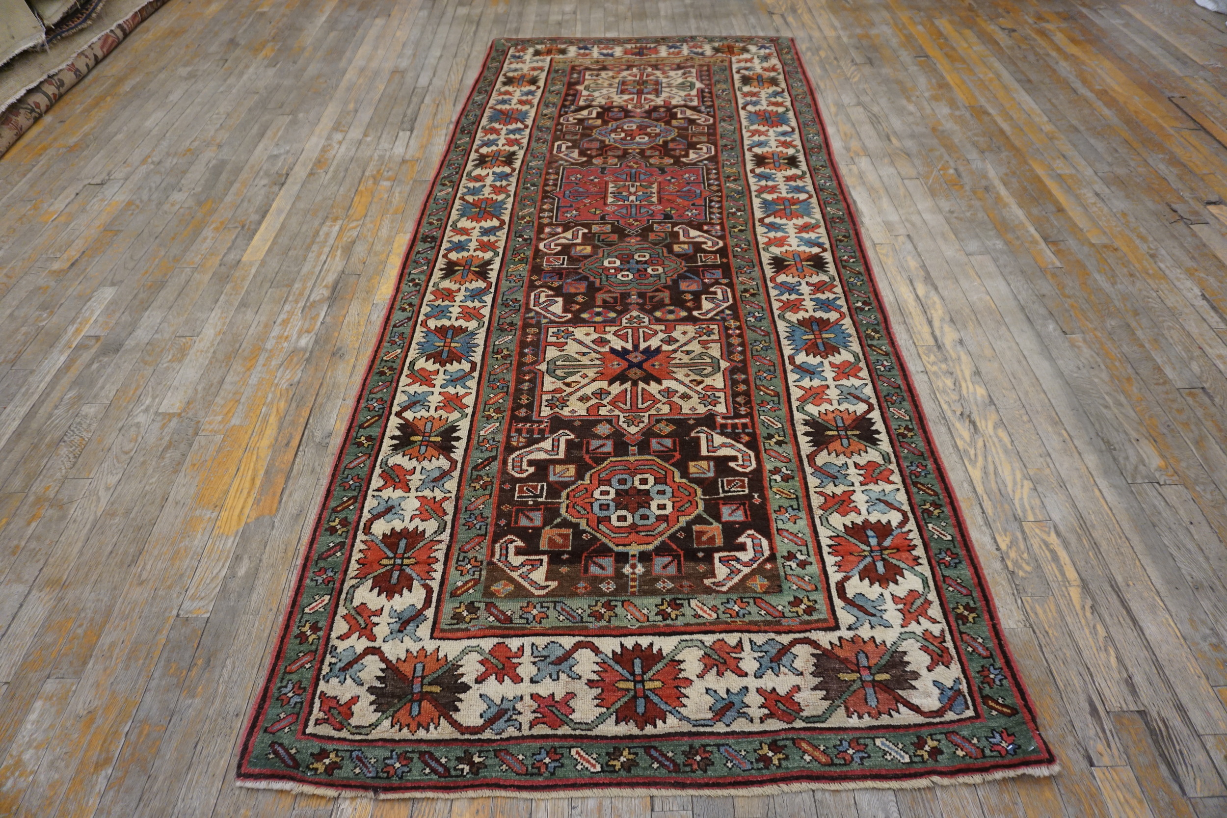 Antique Caucasian Hallway Runner Wool Brown Rug, Circa Date: 1890s. This exceptional piece is a prime example of late 19th-century Caucasian weaving, characterized by its robust wool foundation and deeply saturated natural dyes. As a genuine antique rug, it carries the patina and history inherent in nomadic craftsmanship, offering an authentic glimpse into the weaving traditions of the region.