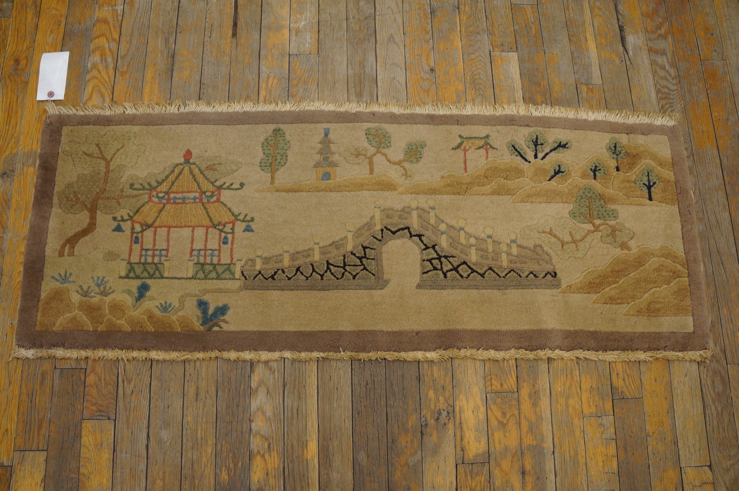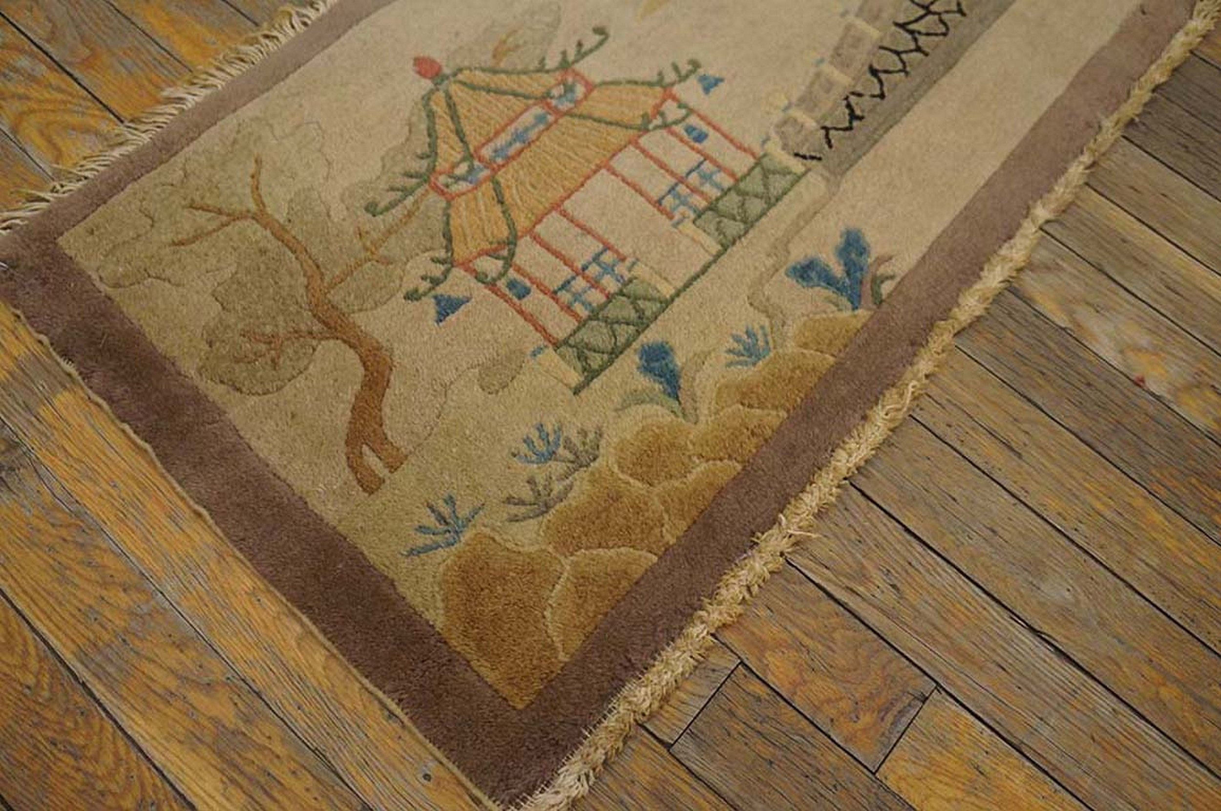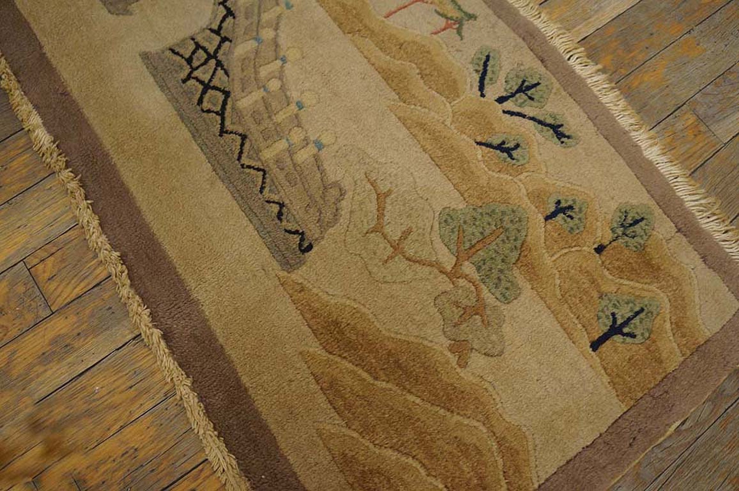 Woven in Chinese rugs workshops during a period of intense Western influence, the design beautifully merges traditional Eastern iconography—such as the stylized architecture and weeping willow—with the clean lines and open composition favored by modernists. The result is a highly decorative yet remarkably serene composition, perfectly suited for contemporary interiors seeking historical depth.