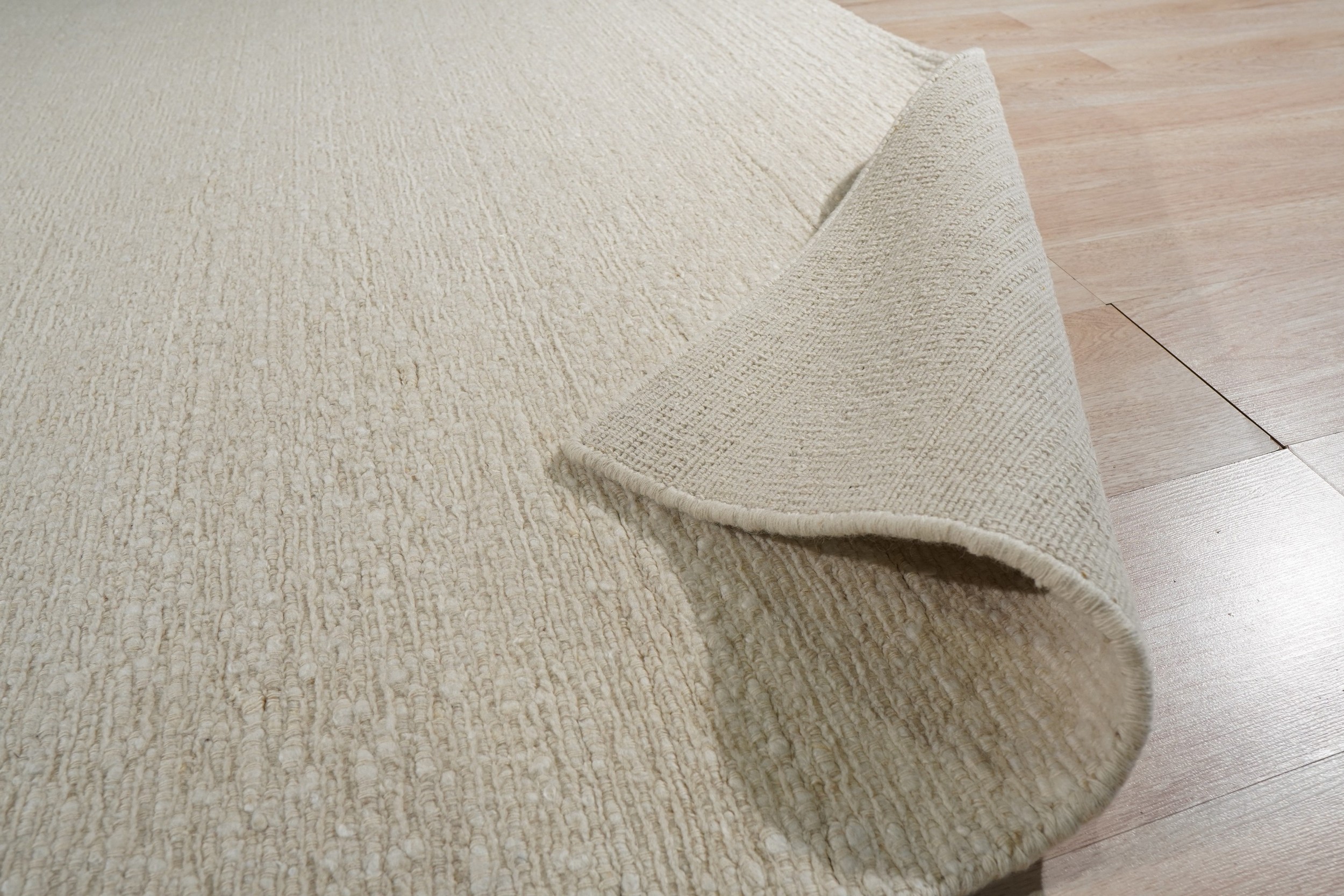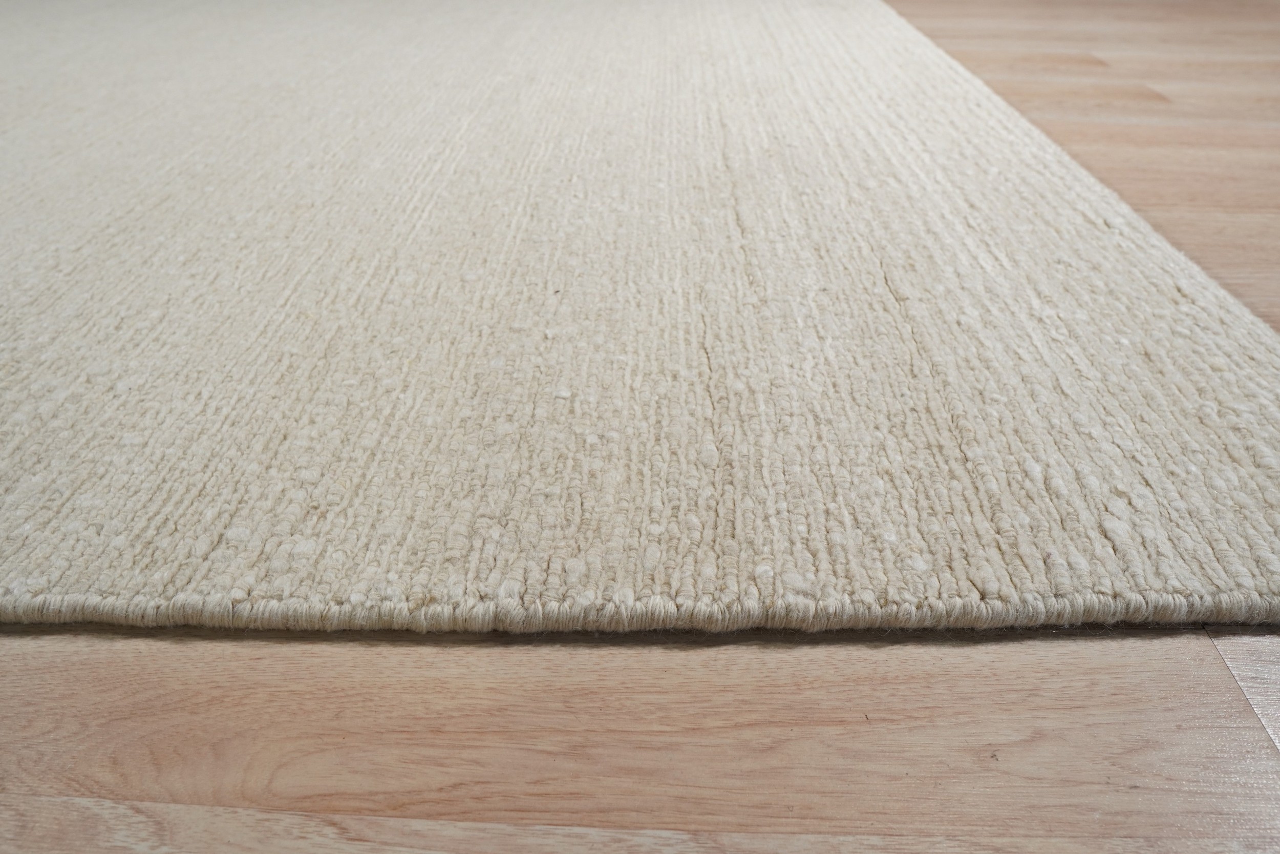 The dense, hand-spun wool fibers are meticulously finished, resulting in a subtle, striated texture that catches the light beautifully. The monochromatic field, rendered in a soft, nuanced ivory color, offers unparalleled versatility, serving as a sophisticated neutral anchor for any design scheme.