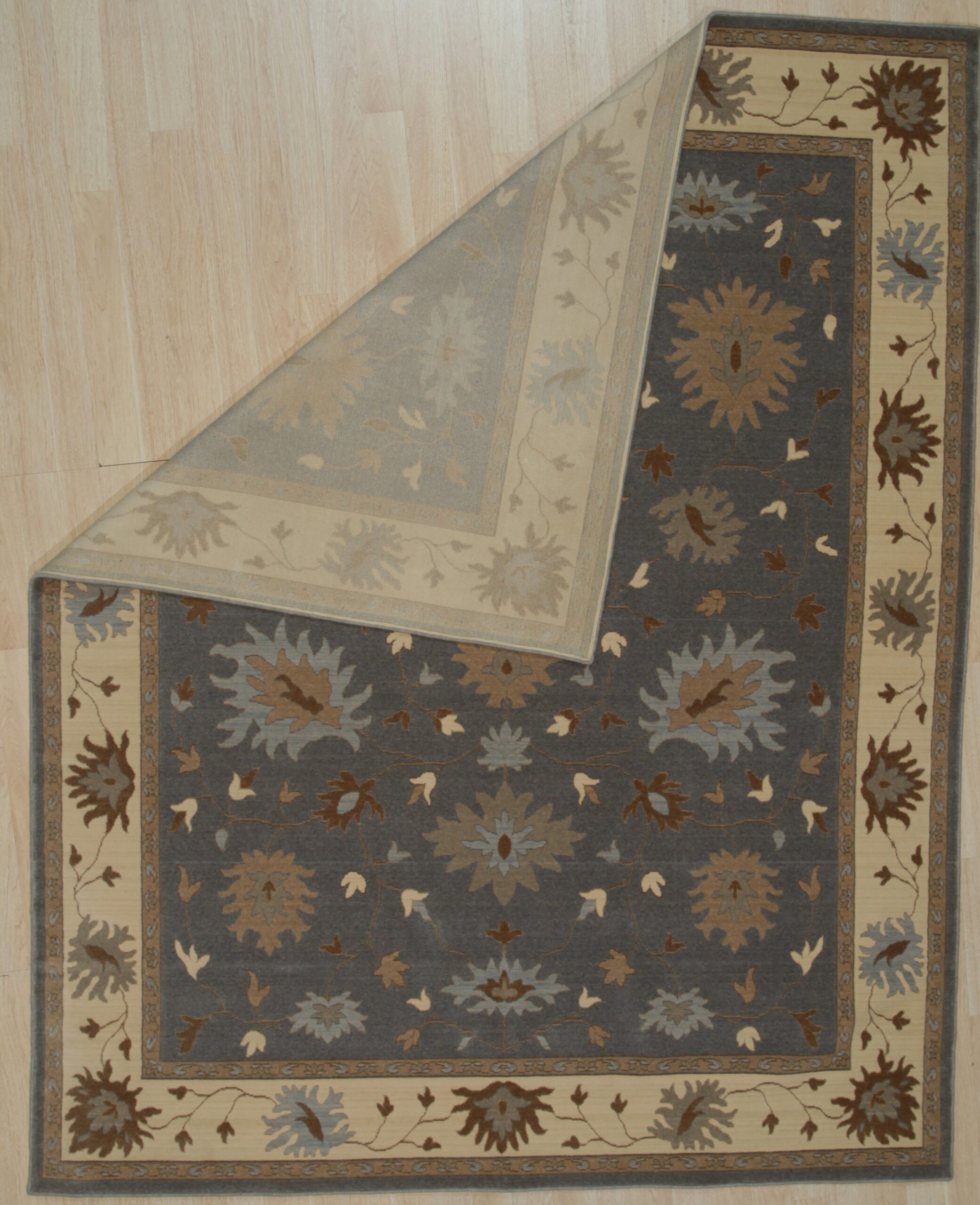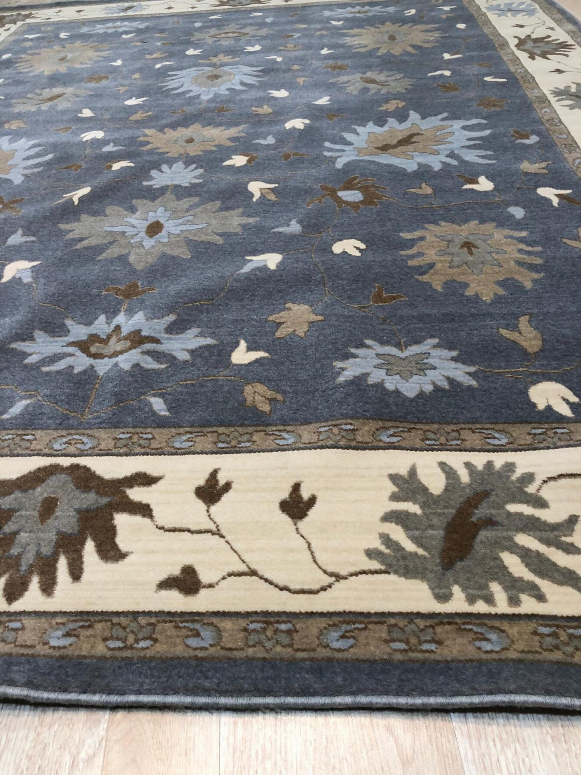 Bespoke Oushak Gray Hand Knotted Wool Rug, Country of Origin: India. This exceptional piece revives the grand scale and stylized floral vocabulary of classic Turkish Oushak carpets. Woven with meticulous care, this rug demonstrates the high level of craftsmanship found in contemporary Indian rugs.