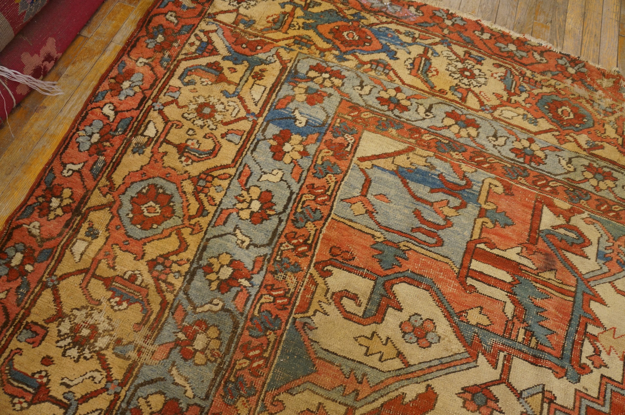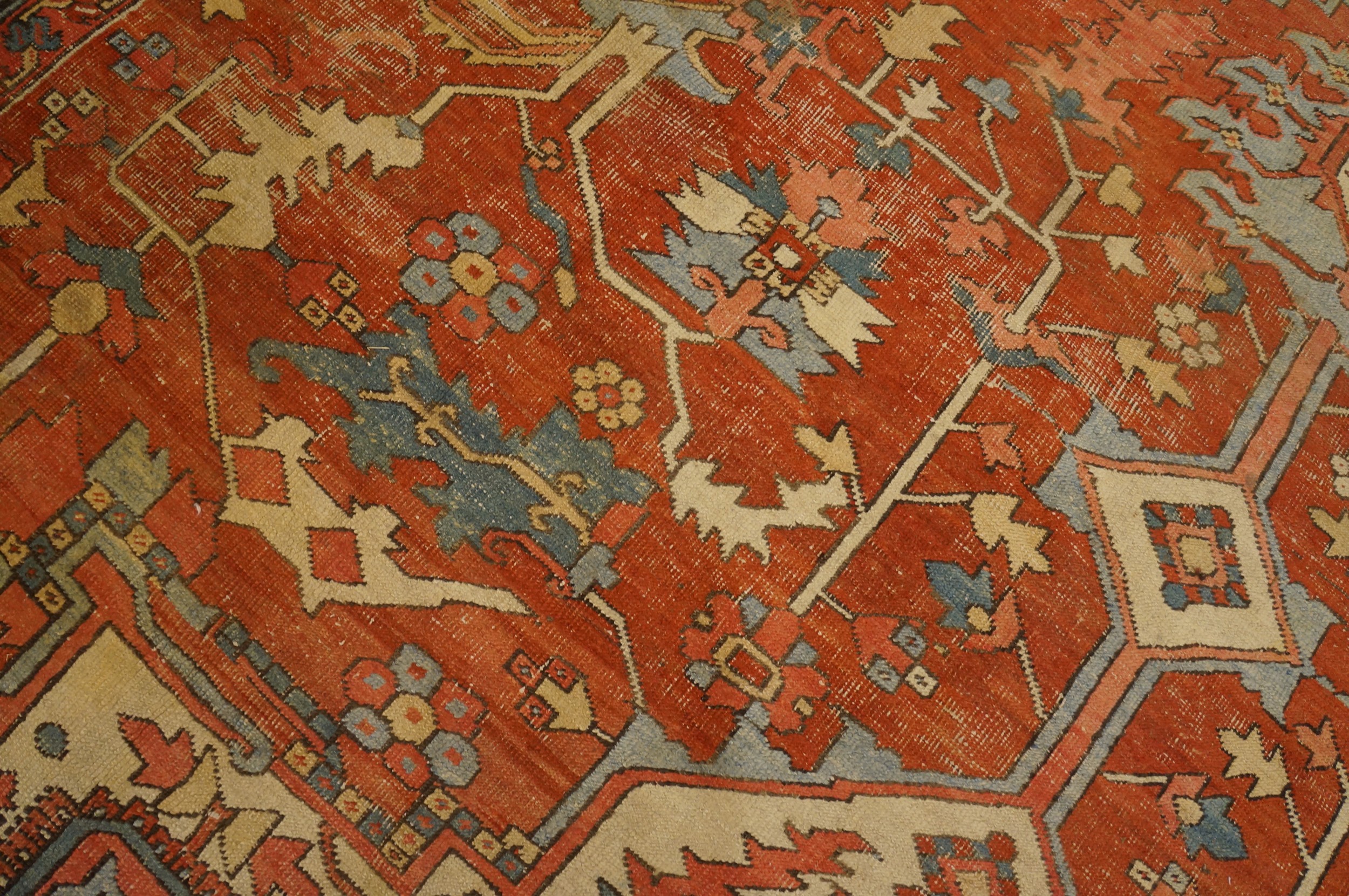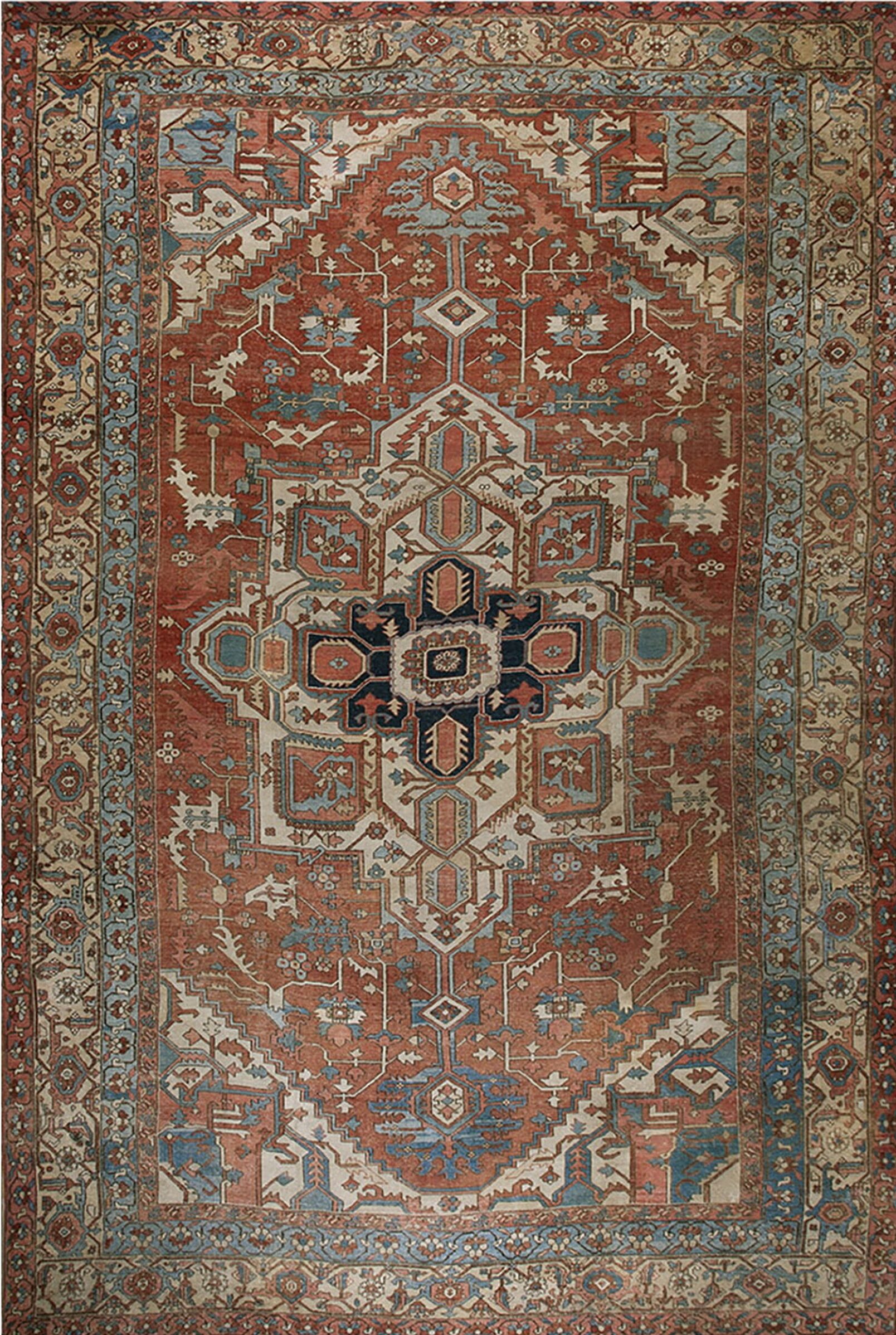 Antique Large Serapi Persian Medallion Knotted Rug, Circa Date: 1890s. This exceptional Serapi exemplifies the finest weaving traditions of Northwest Persia, characterized by its robust structure and commanding presence. Serapi rugs from this period are highly sought after by collectors of antique rugs for their unique blend of tribal geometry and formal composition.