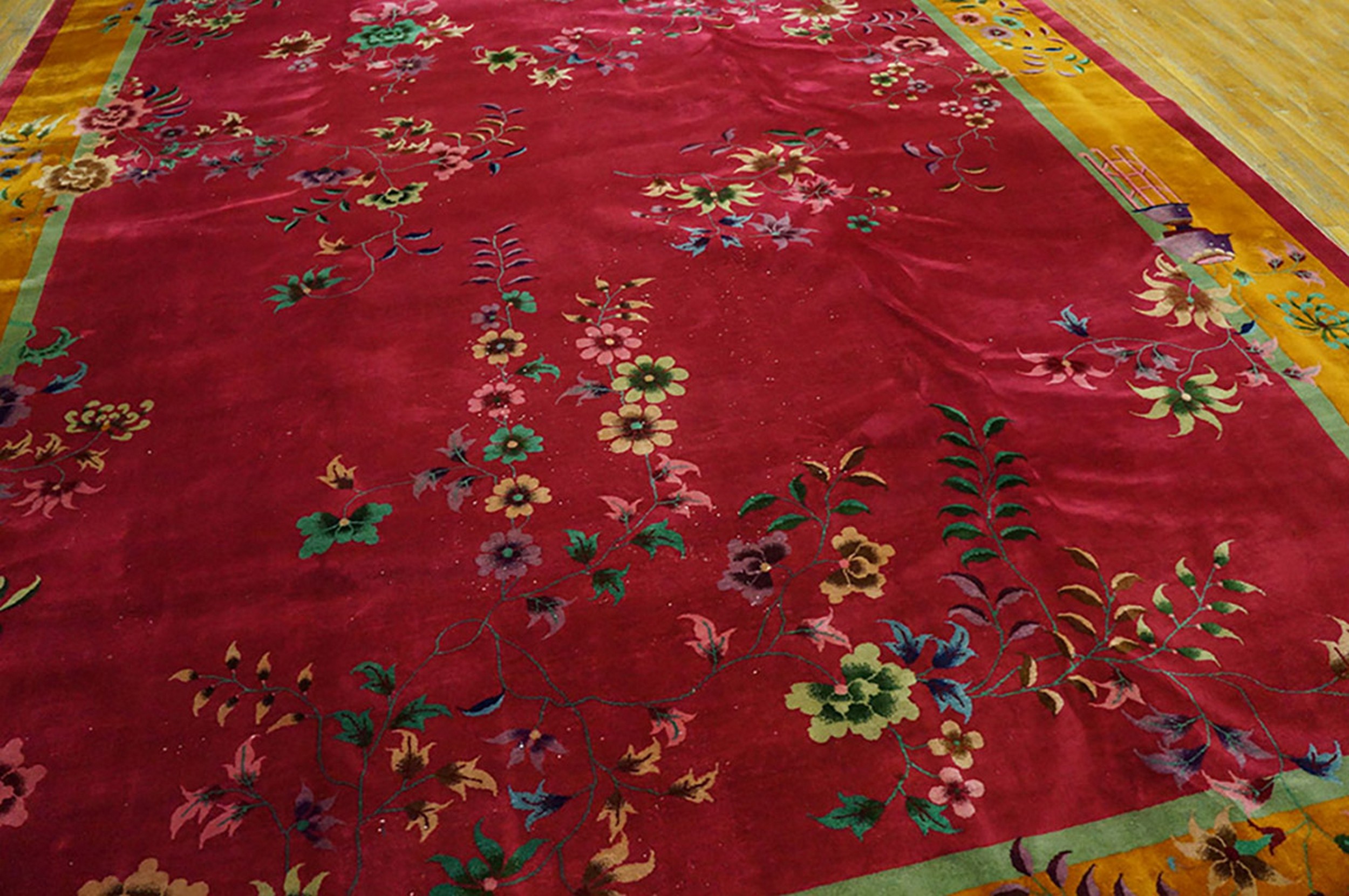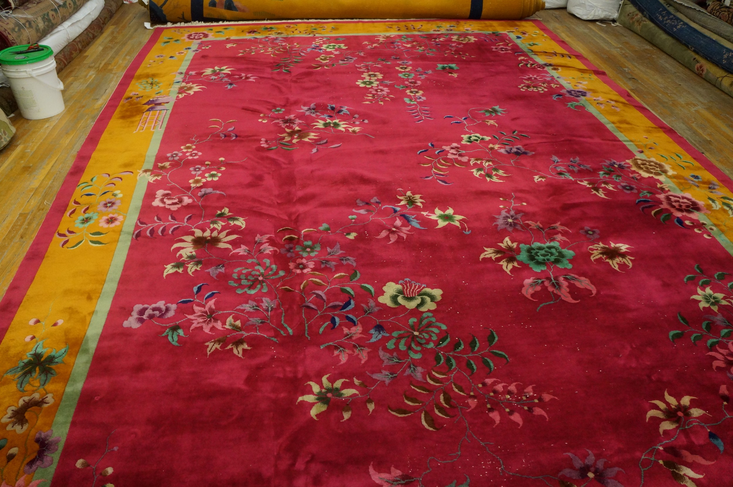 Antique Wool Hand Knotted Pile Red / Rust 1920s Rug, Circa Date: 1920s. This exceptional Chinese Art Deco piece captures the dramatic aesthetic of the early 20th century. Hand-knotted from luxurious wool, the rug features a highly saturated field in a deep wine rust red color rugs, perfectly contrasting with the broad, luminous saffron border.