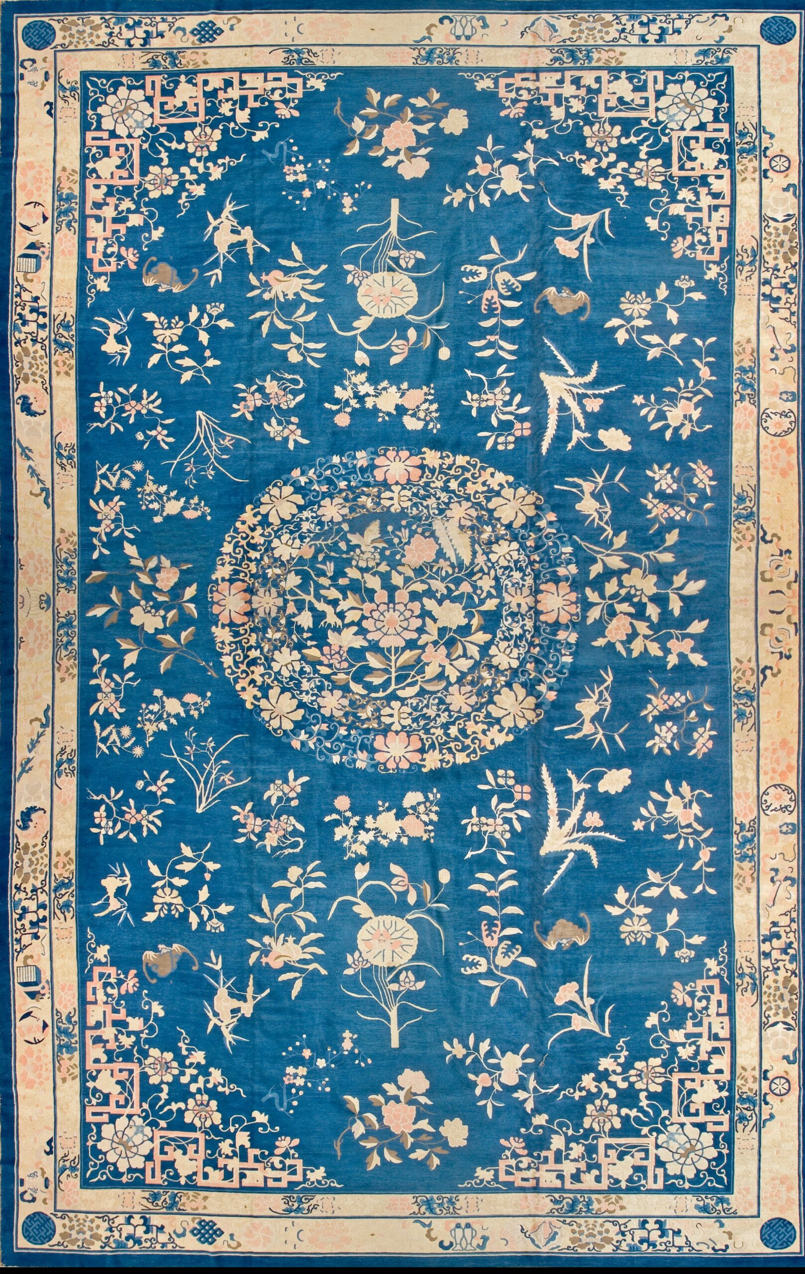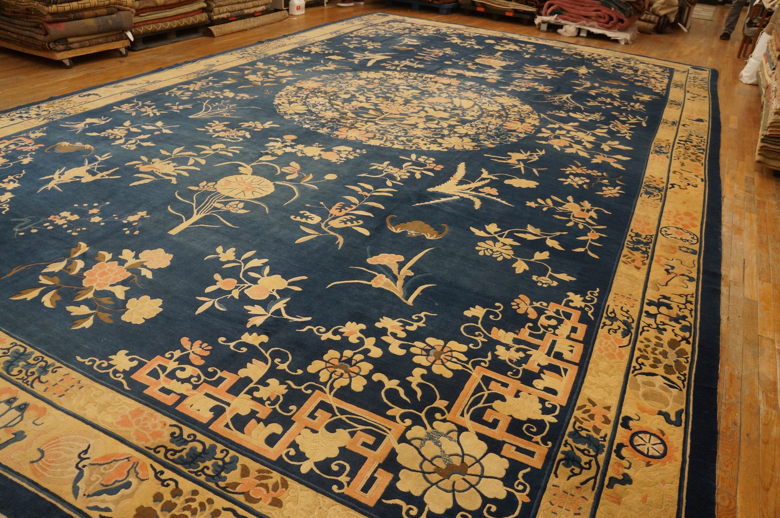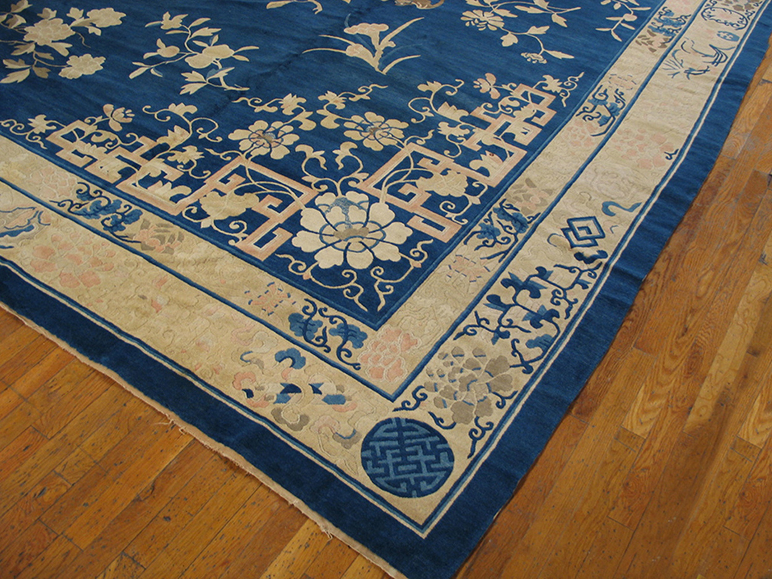 Woven during the Qing Dynasty’s twilight years, this rug captures a moment of cultural refinement and artistic excellence. Its generous dimensions ensure it commands attention in any setting, whether placed in a grand hall or a contemporary living space. Finding a piece of this age, condition, and scale is rare, making it a significant large oversized big rug acquisition for the discerning connoisseur.