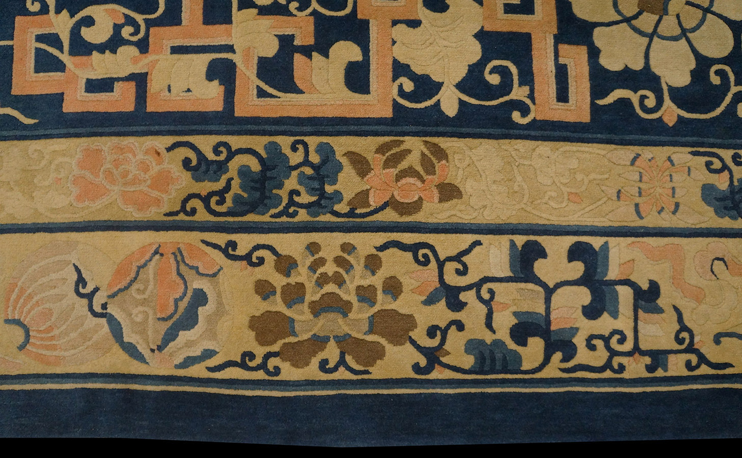 Antique Chinese – Peking Chinese Blue 1890s Rug, Circa Date: 1890s. This exceptional example of late 19th-century weaving represents the zenith of the Peking style, characterized by its sophisticated use of open space and symbolic motifs. Such pieces are highly sought after by collectors of antique rugs due to their distinctive palette and superior wool quality, setting them apart from later 20th-century productions.