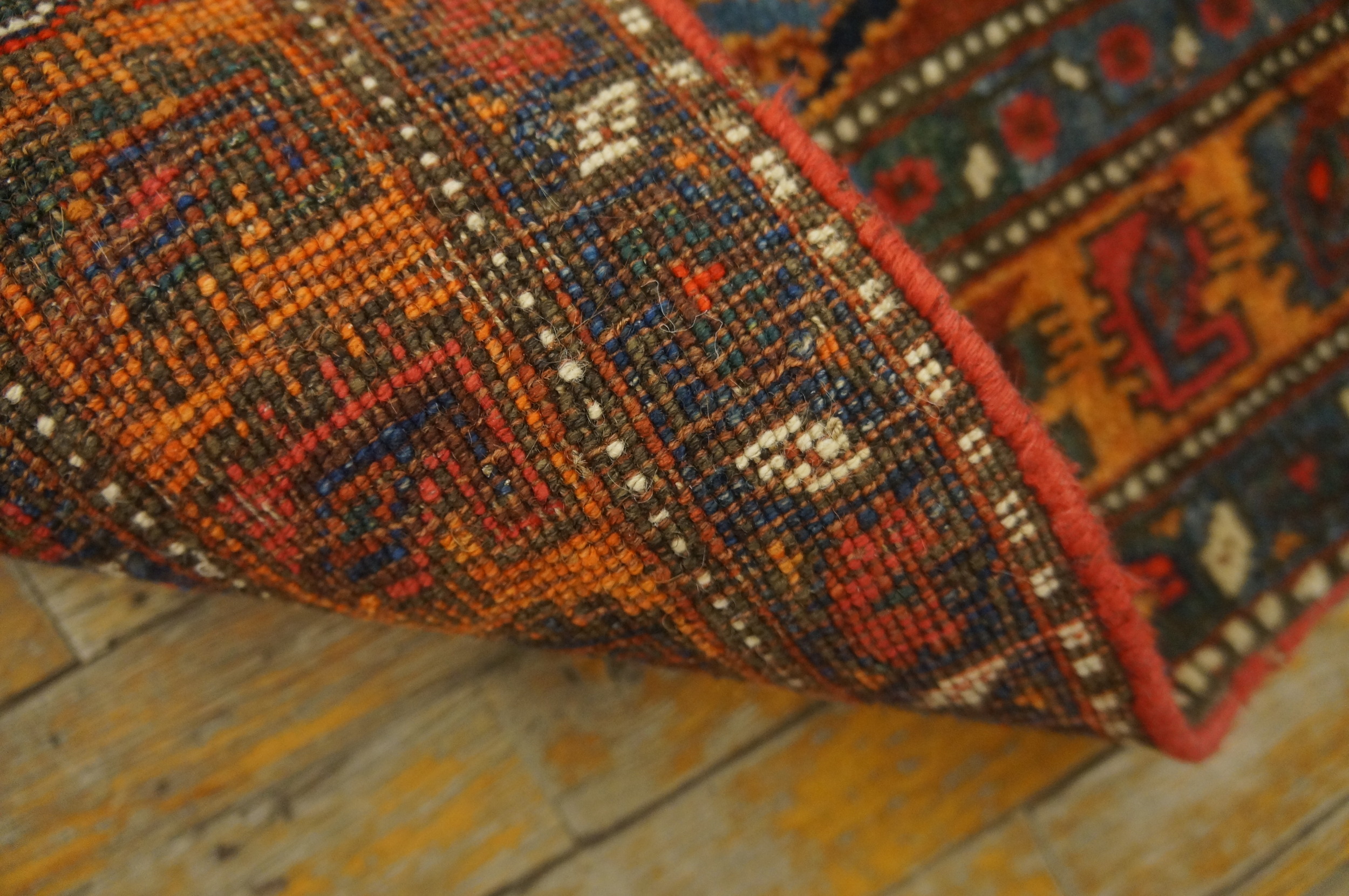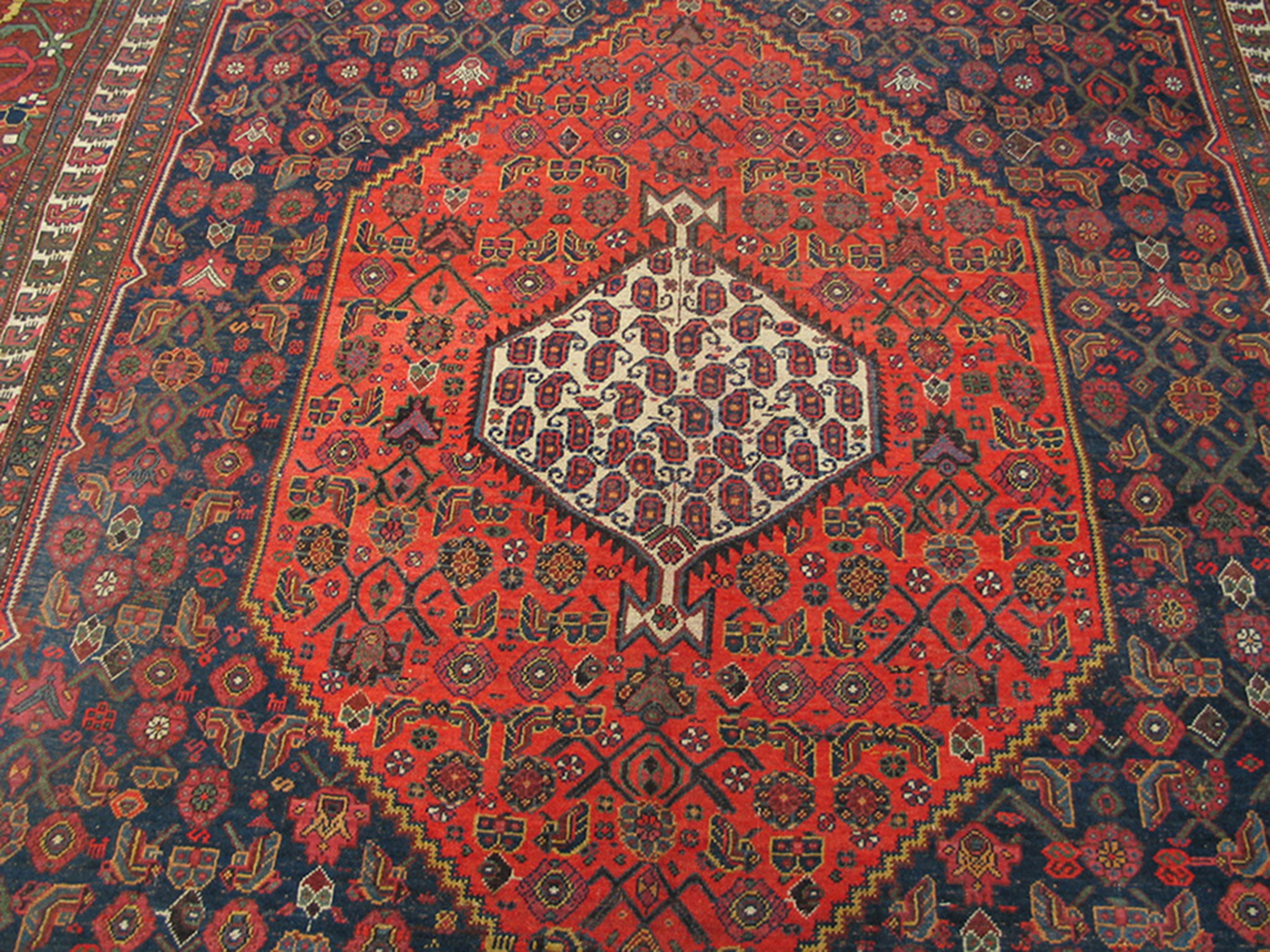 The central composition is defined by a bold, angular lozenge medallion, densely filled with intricate boteh and stylized floral elements. This highly organized, geometric design is typical of Kurdish influence, emphasizing structure and permanence over fluid movement across the field. The detailed inner borders frame the central motif with precision, demonstrating the high technical skill of the weaver.