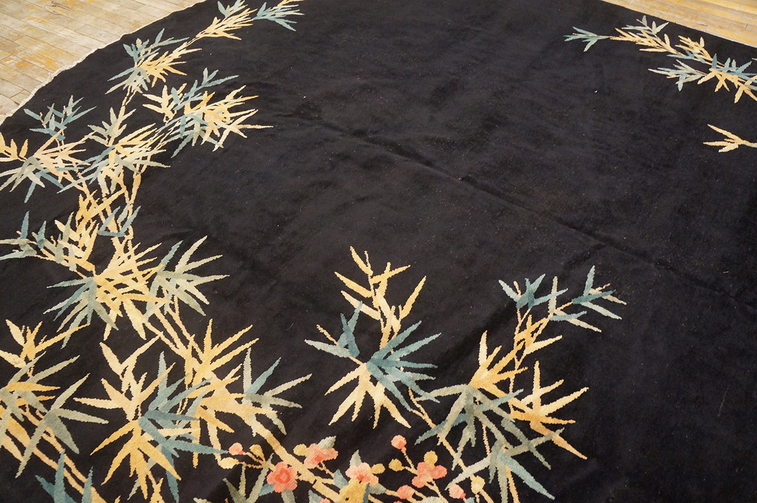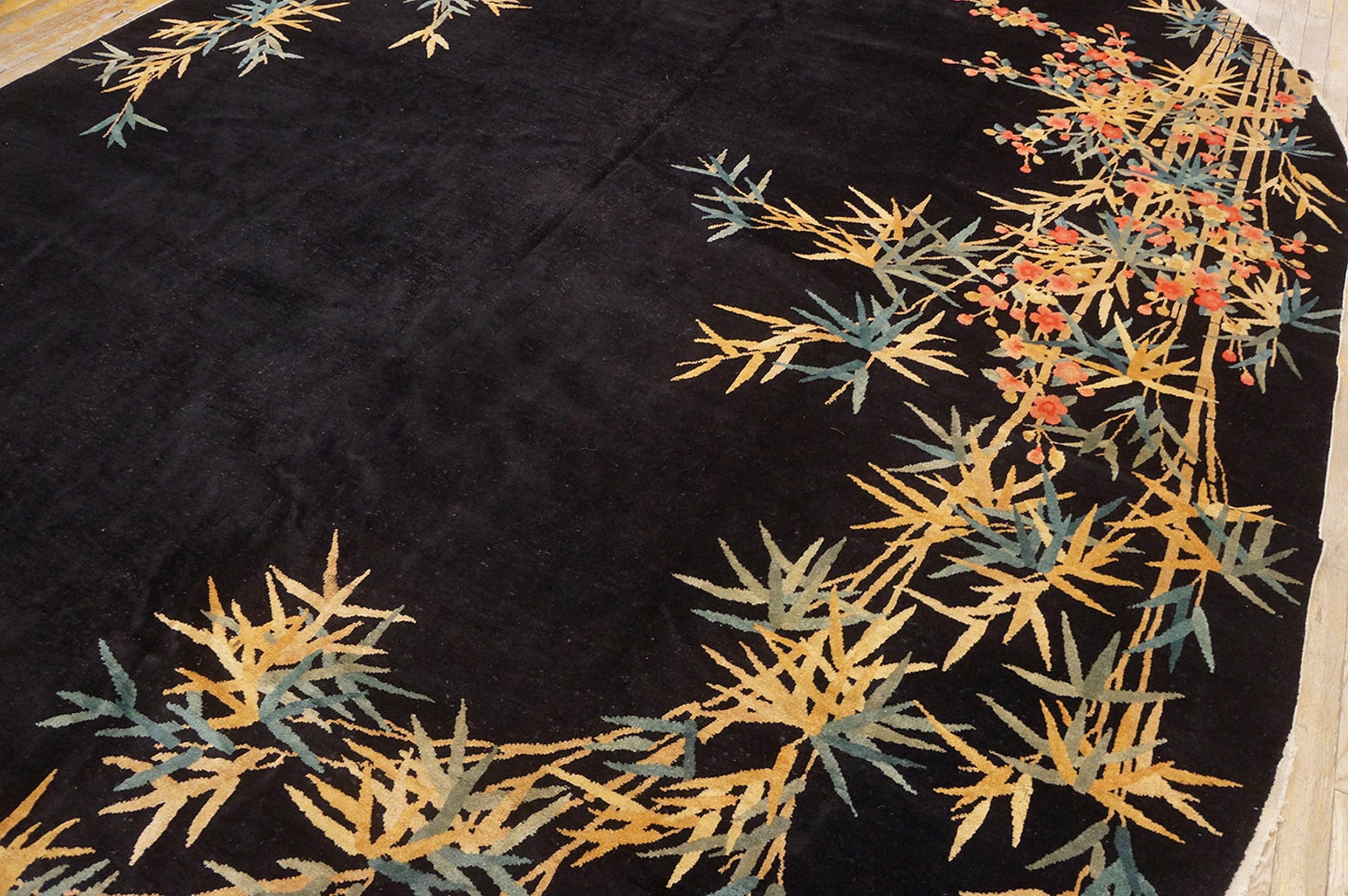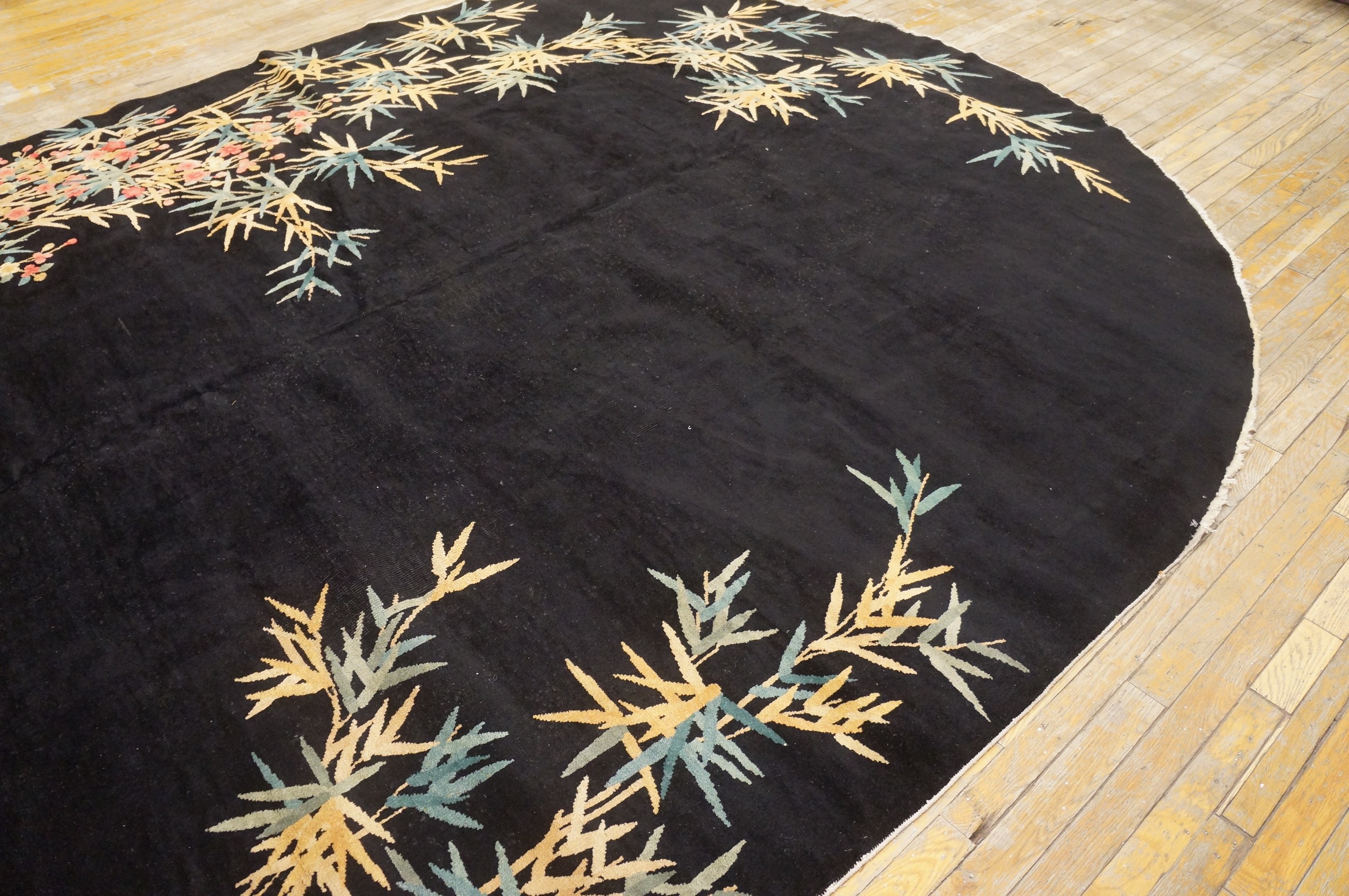 Antique Art Deco Chinese Floral Black 1920s Rug, Circa Date: 1920s. This exceptional piece captures the dramatic fusion of traditional Chinese iconography with the bold aesthetic of the Art Deco era. Its striking design and unusual shape distinguish it among antique rugs of the period, representing a high point in early 20th-century textile production.