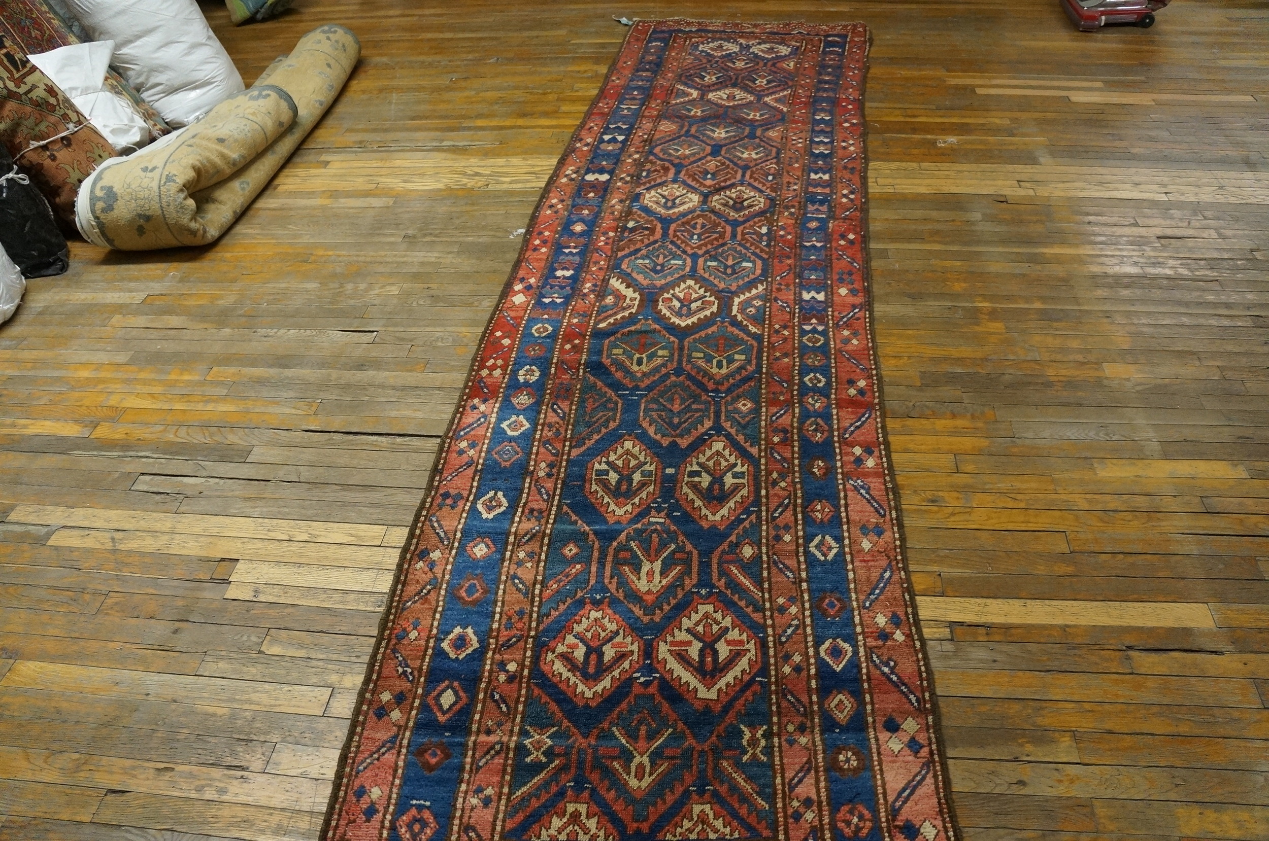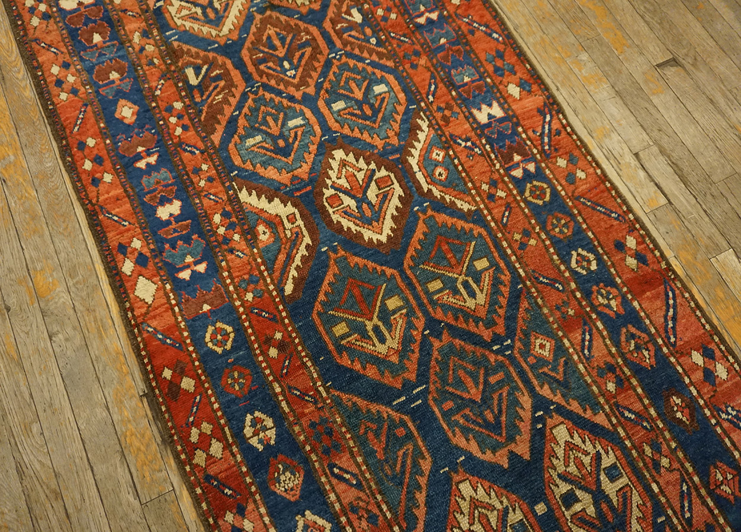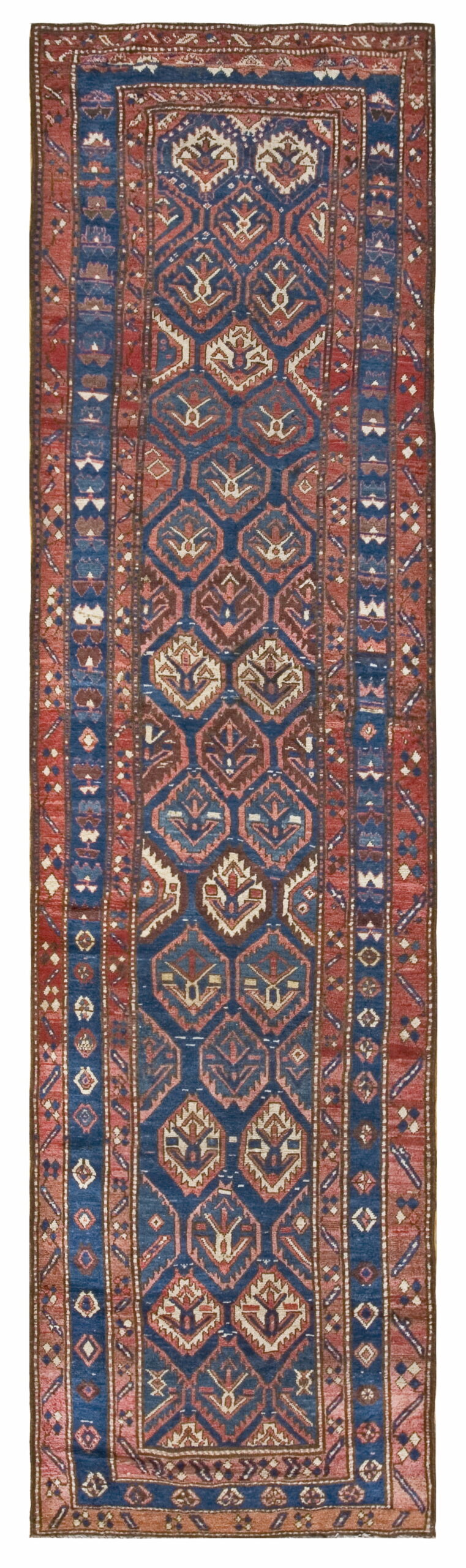 Persian Malayer Hallway Runner Rug (3.02ft x 13ft), Circa Date: 1880s. This exceptional example of nomadic weaving presents a powerful geometric design. The field utilizes an allover geometric arrangement, where repeating, stylized medallions create a sense of continuous movement down the length of the piece.