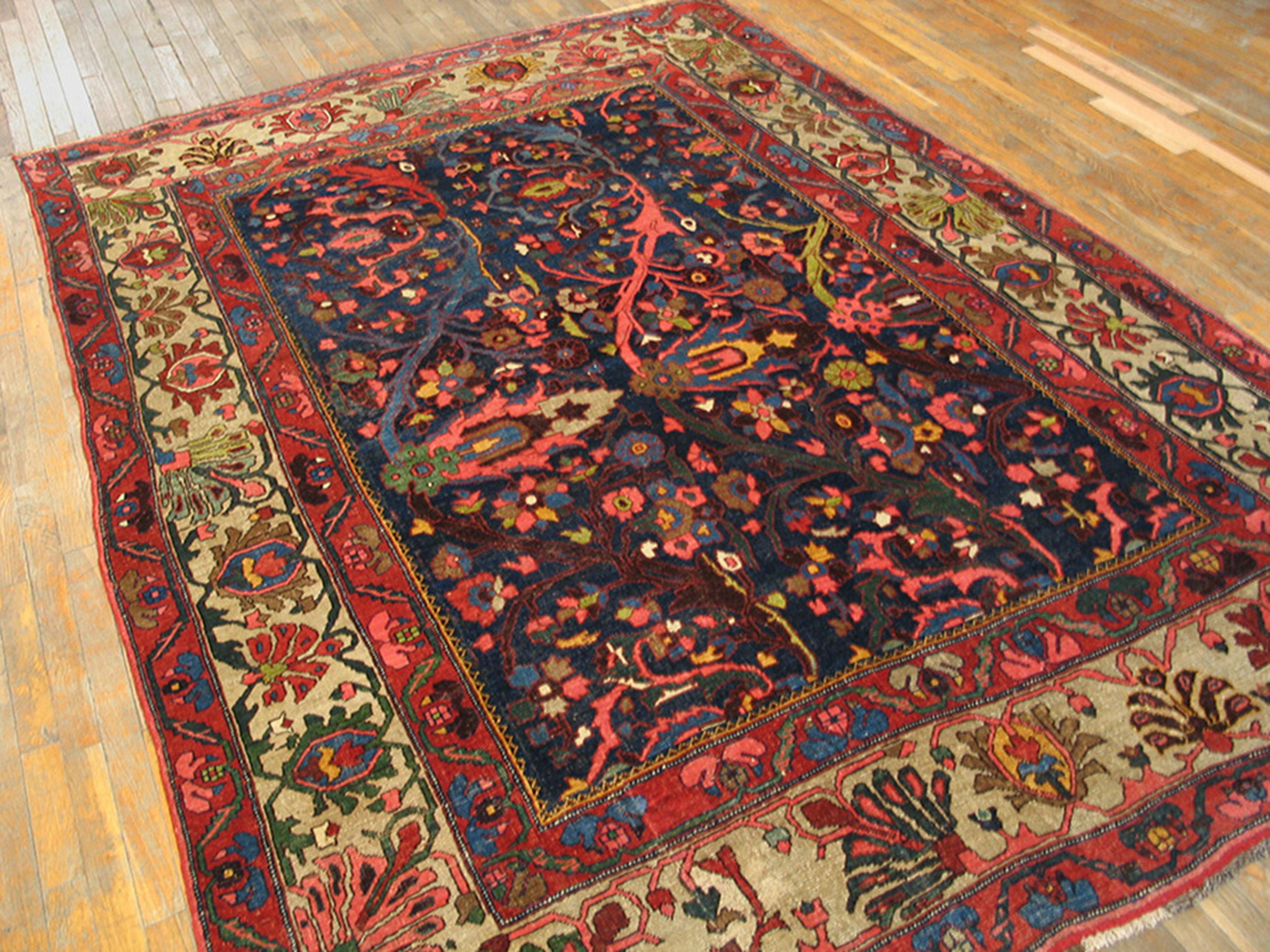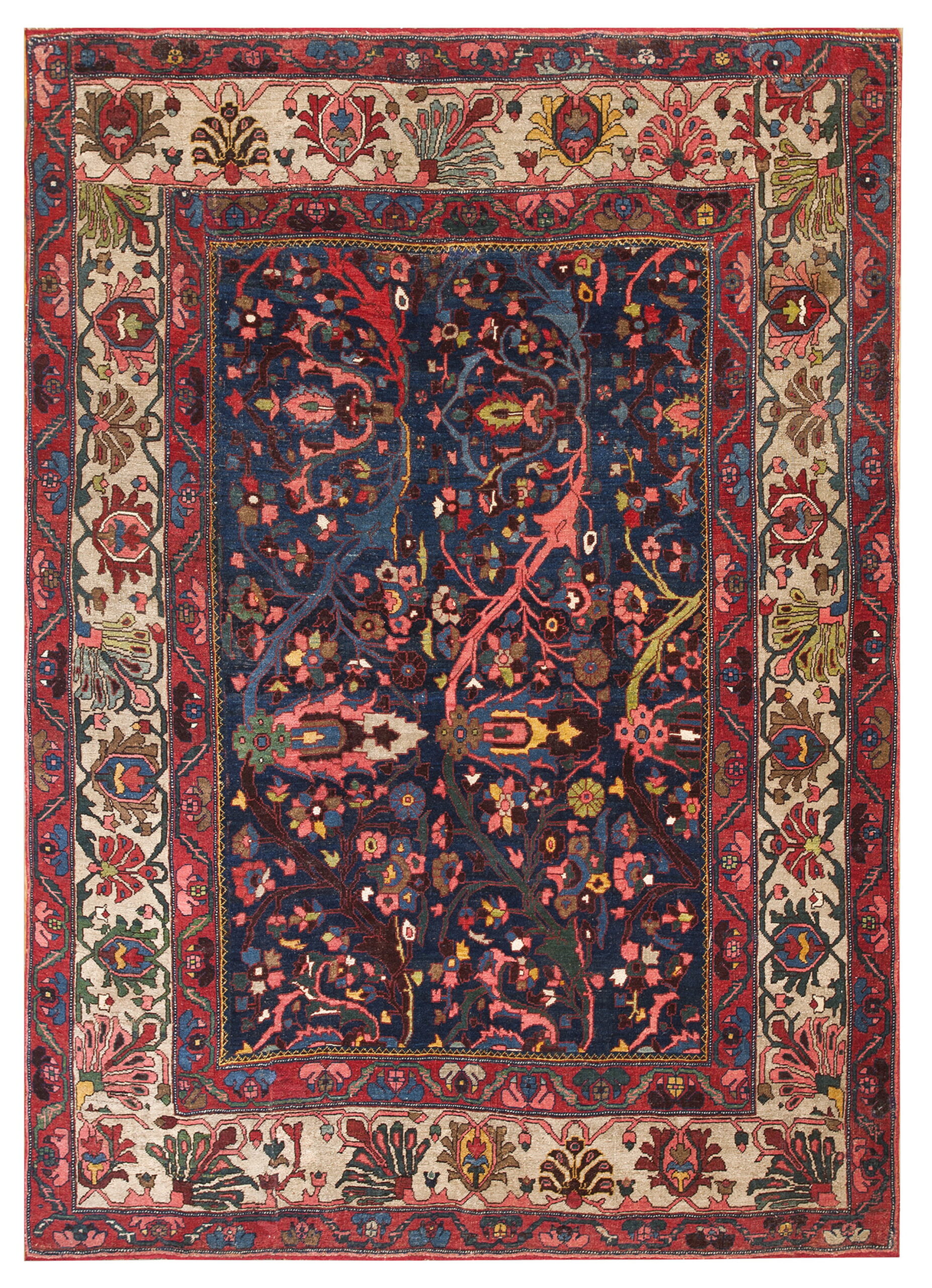 The commanding central field is rendered in a rich, deep indigo, providing a dramatic backdrop for the riotous display of stylized botanical forms. Accents of salmon, russet red, and olive green are meticulously integrated, ensuring the depth of the primary blue color rugs remains the focal point while adding complexity and visual warmth to the composition.