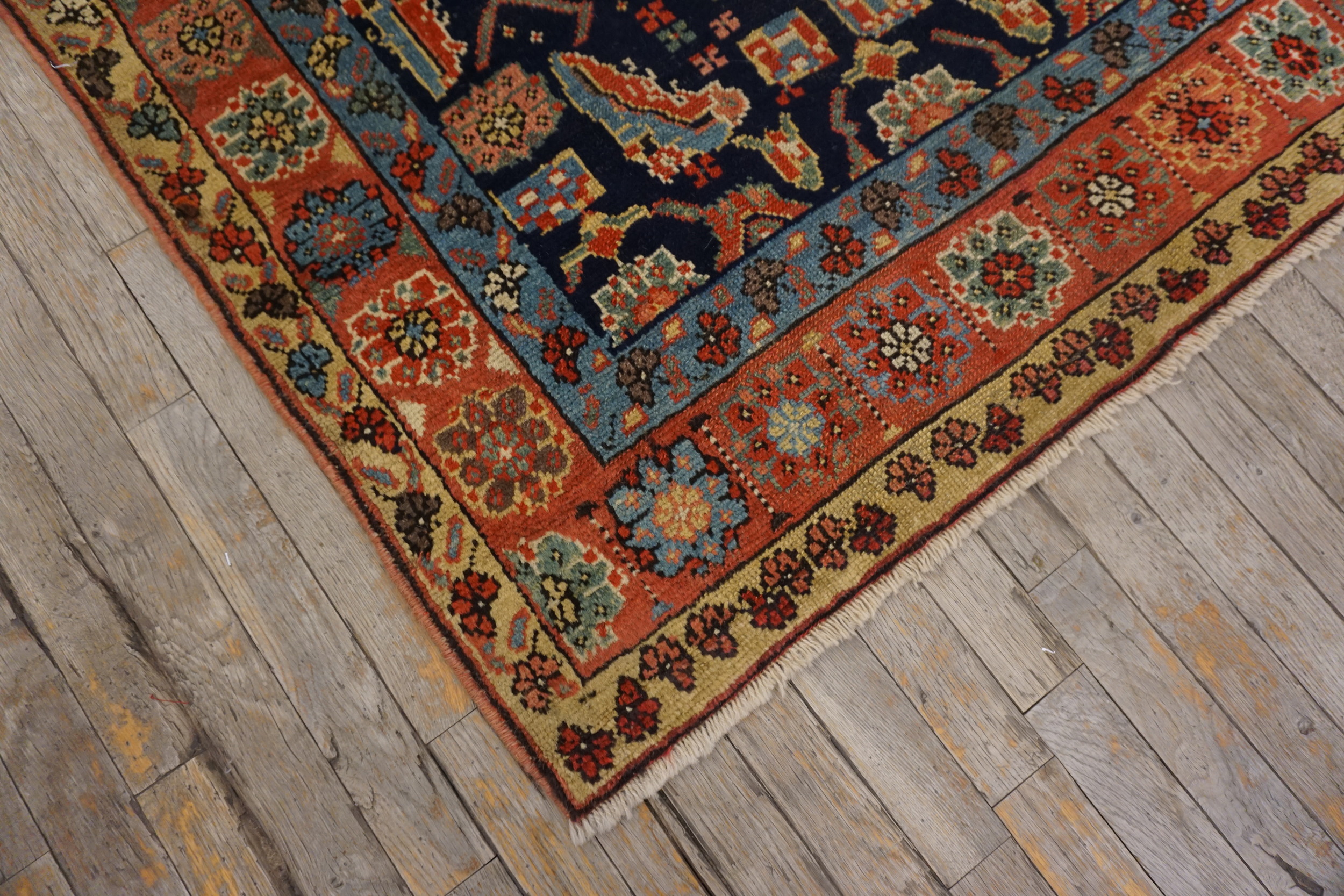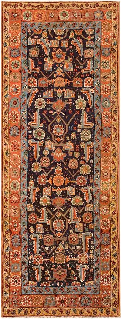 The masterful use of color is immediately apparent. The primary field is a rich, saturated navy, anchoring the vibrant secondary palette. Hues of terracotta, teal, and soft gold highlight the detailed motifs, creating a visual depth that is highly sought after in blue color rugs of this period, demonstrating the skilled use of natural dyes.