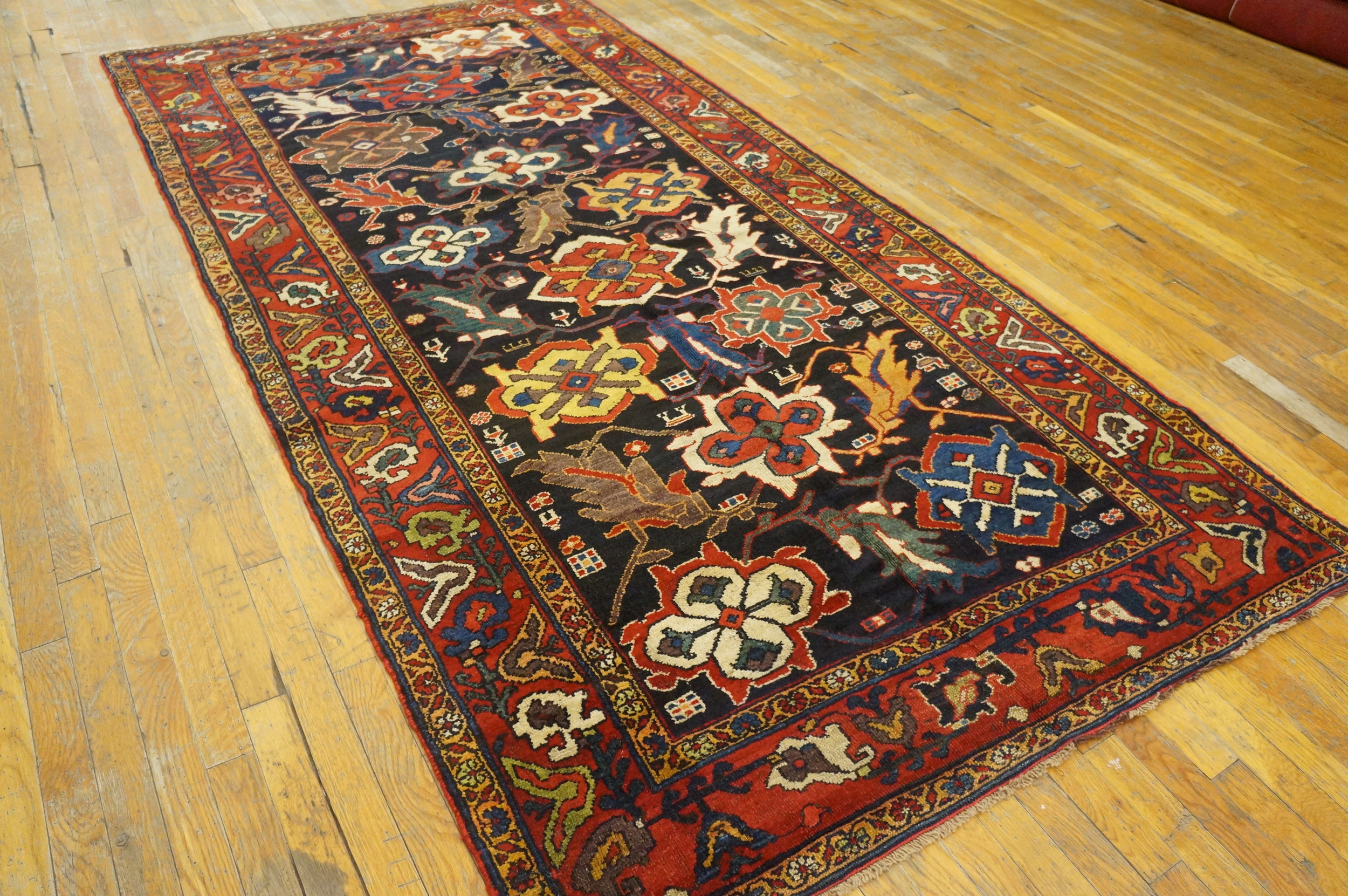 Antique Bakhtiari Hallway Runner Wool Black Rug, Country of Origin: Iran / Persia, Circa Date: 1890s. This exceptional piece is a testament to the robust weaving tradition of the bakhtiari tribes, showcasing the characteristic bold, stylized motifs adapted here for a narrow format. The deep, saturated colors speak to the quality of the natural dyes used at the close of the 19th century, lending the textile an immediate sense of historical gravitas.