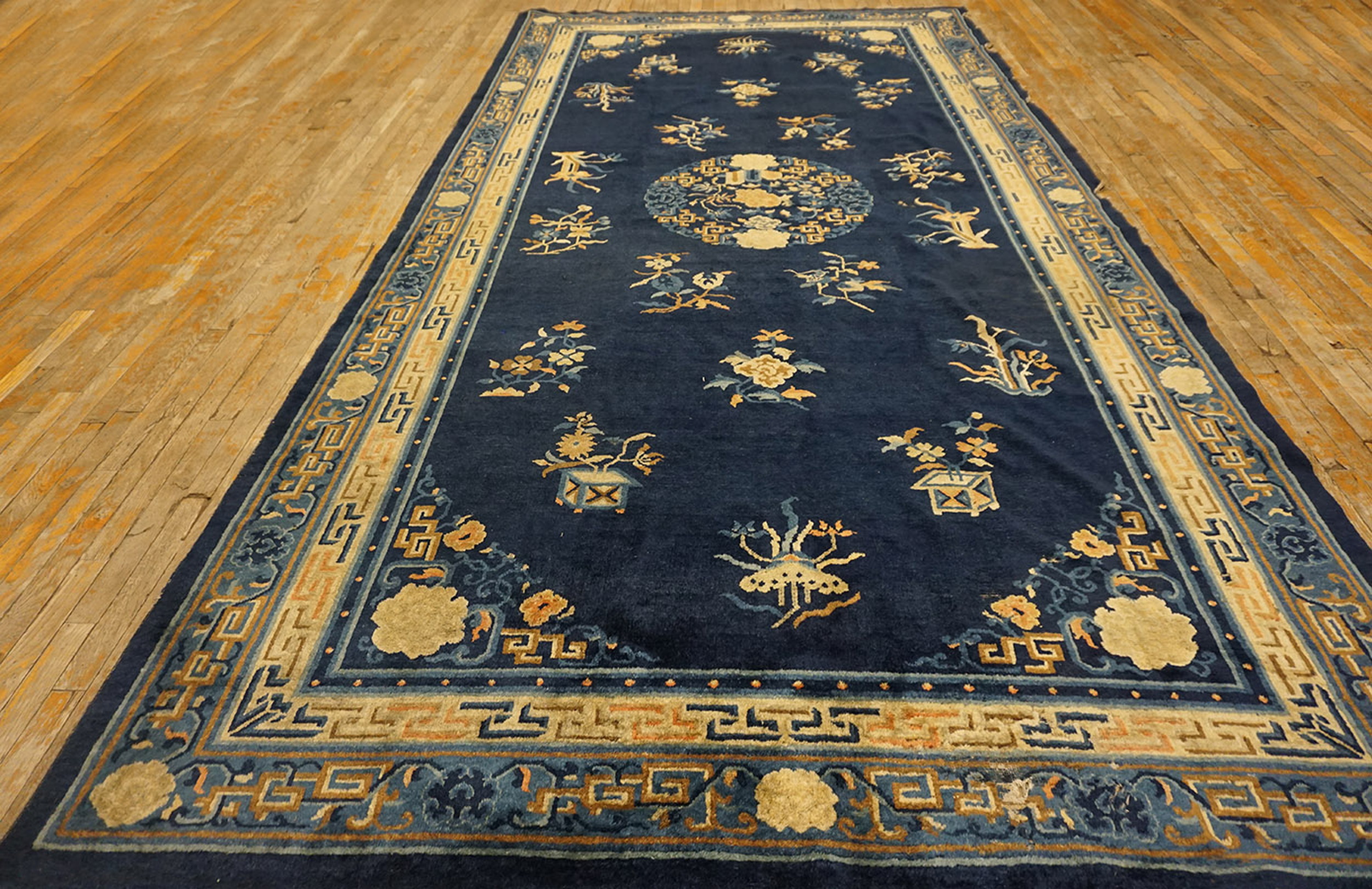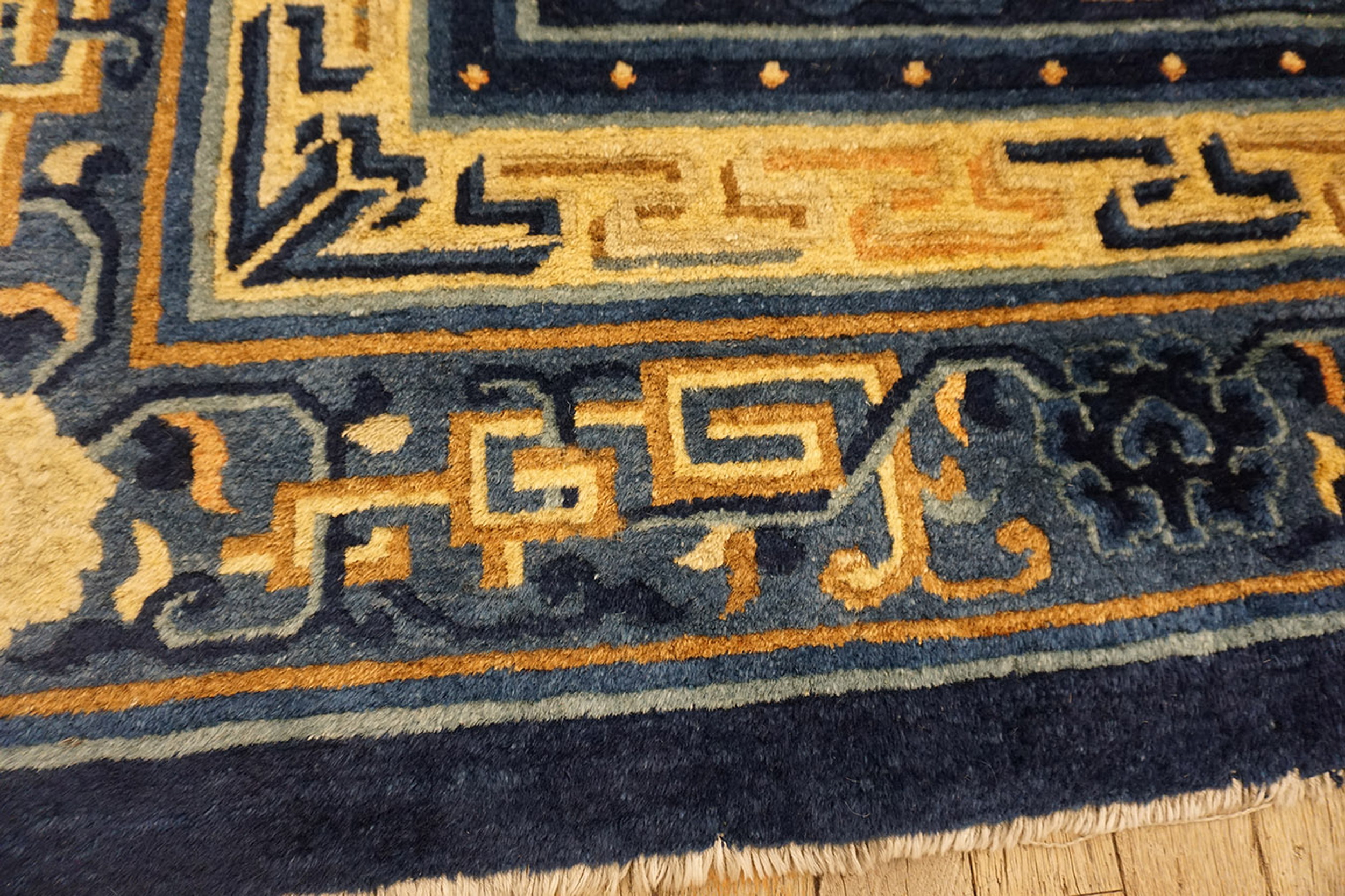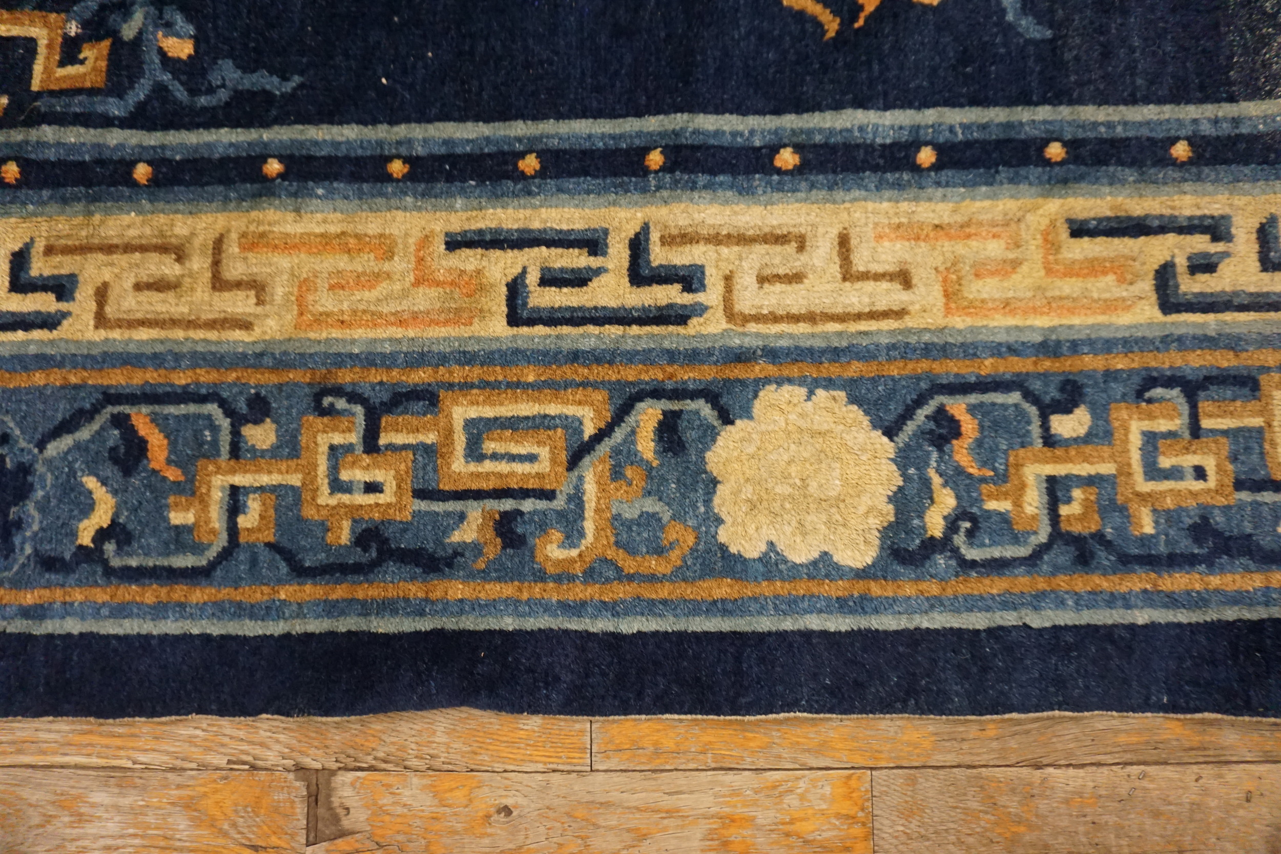 Blue Chinese Antique 1880s Rectangle Room Size Wool Knotted – Peking Rug, Circa Date: 1880s. This exceptional example of Chinese weaving captures the restrained elegance typical of late Qing Dynasty antique rugs. The craftsmanship displayed in this wool knotted piece speaks to the enduring quality of textiles produced in the Peking region during this period, utilizing traditional techniques that emphasize durability and visual depth.