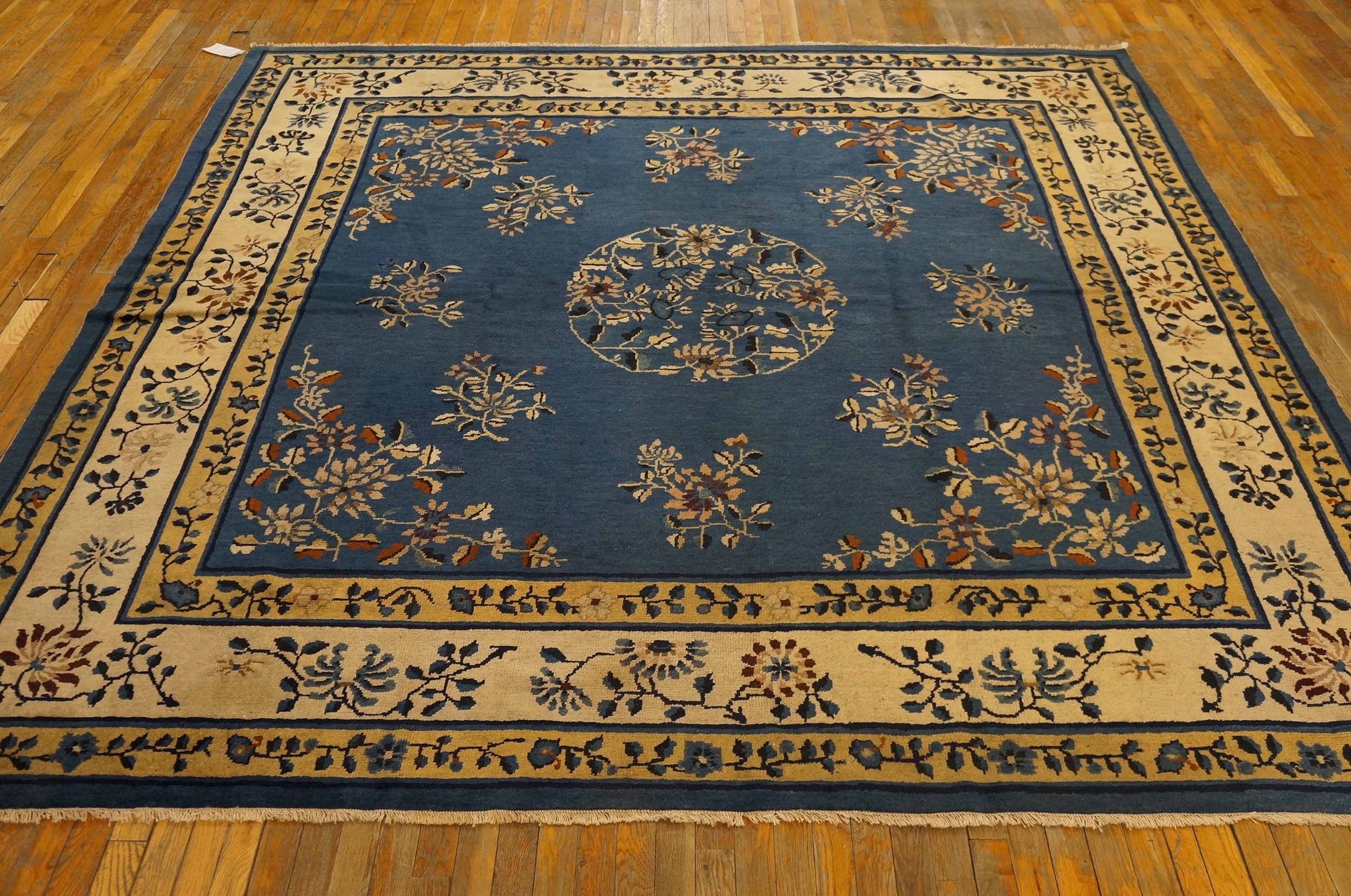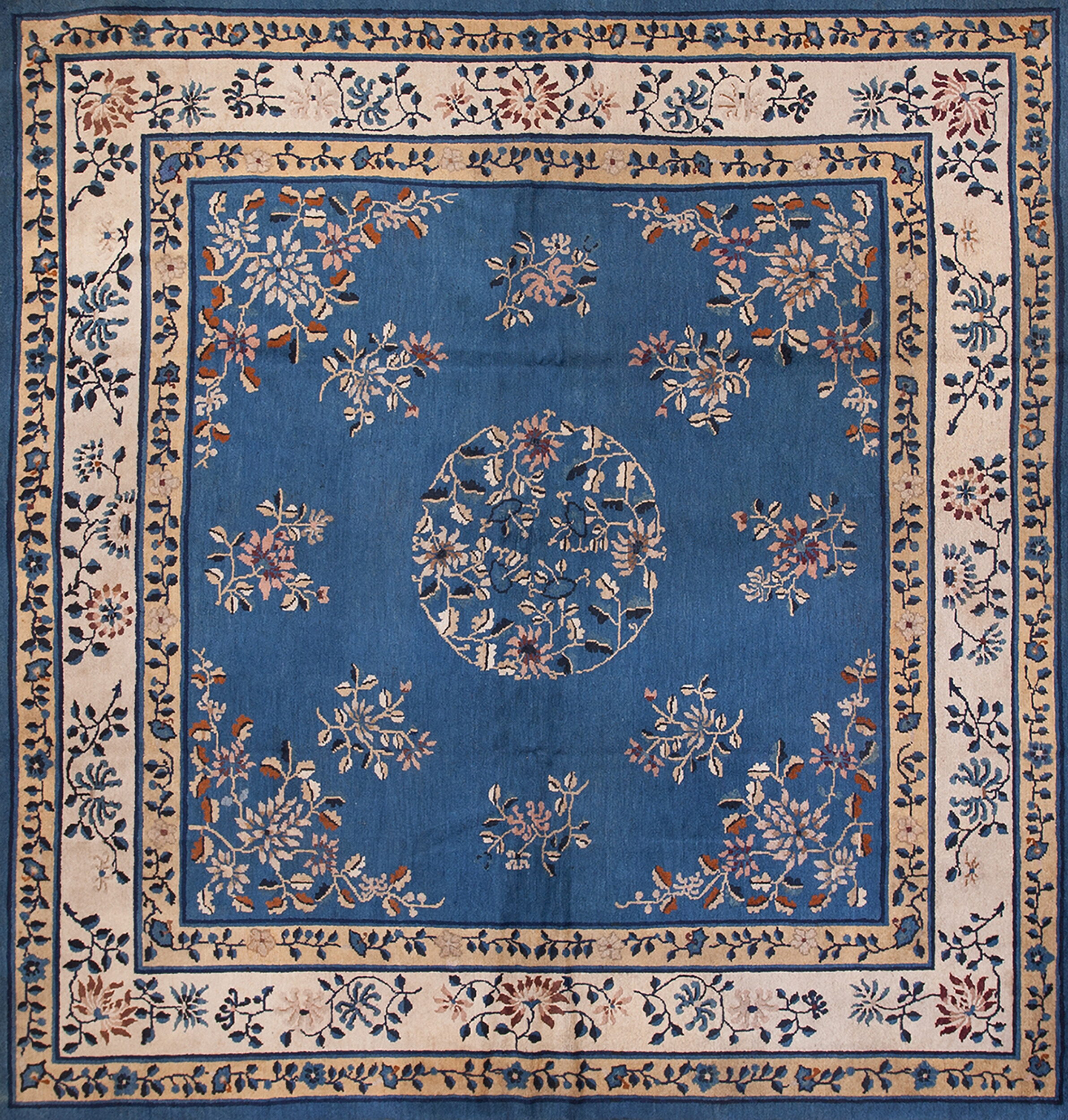 Square Room Size Rugs (8.09ft x 9.0ft), Circa Date: 1920s. This exquisite piece exemplifies the refined aesthetic of early 20th-century Chinese weaving, characterized by its generous scale and sophisticated color palette. The dense wool pile and sturdy construction confirm its status as a genuine antique rug, offering enduring quality and historical provenance.