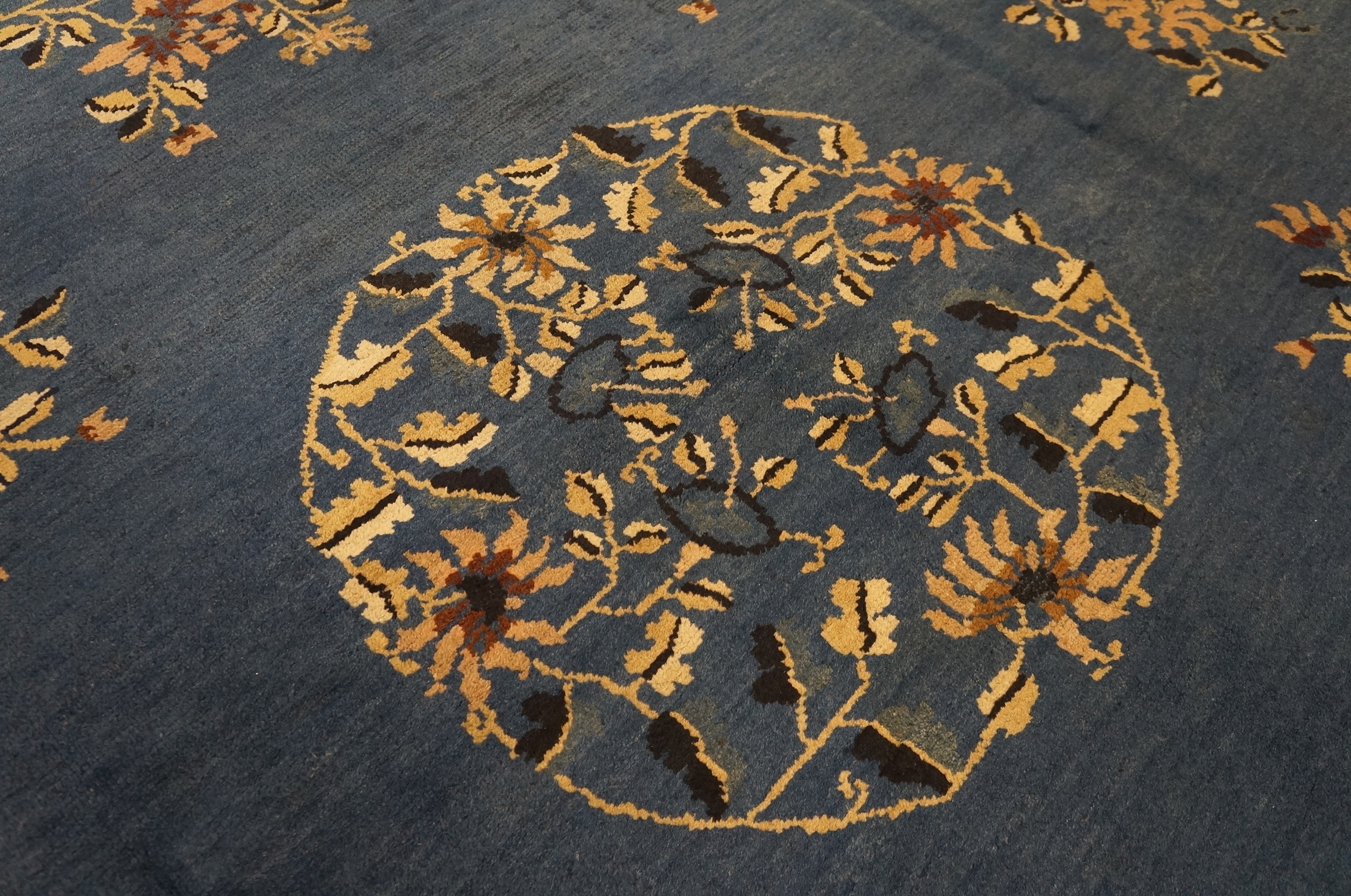 The field is dominated by a rich, saturated tone, placing it among the most sought-after blue color rugs of the period. This deep hue, often associated with tranquility and prestige in Chinese decorative arts, contrasts beautifully with the soft ivory and pale beige used in the border and the delicate floral sprays. The substantial dimensions ensure it functions perfectly as a grand room-size rug for a formal reception area.