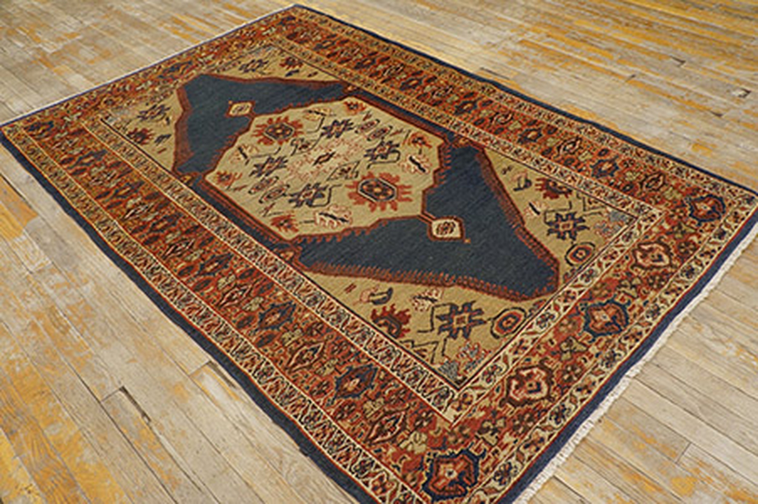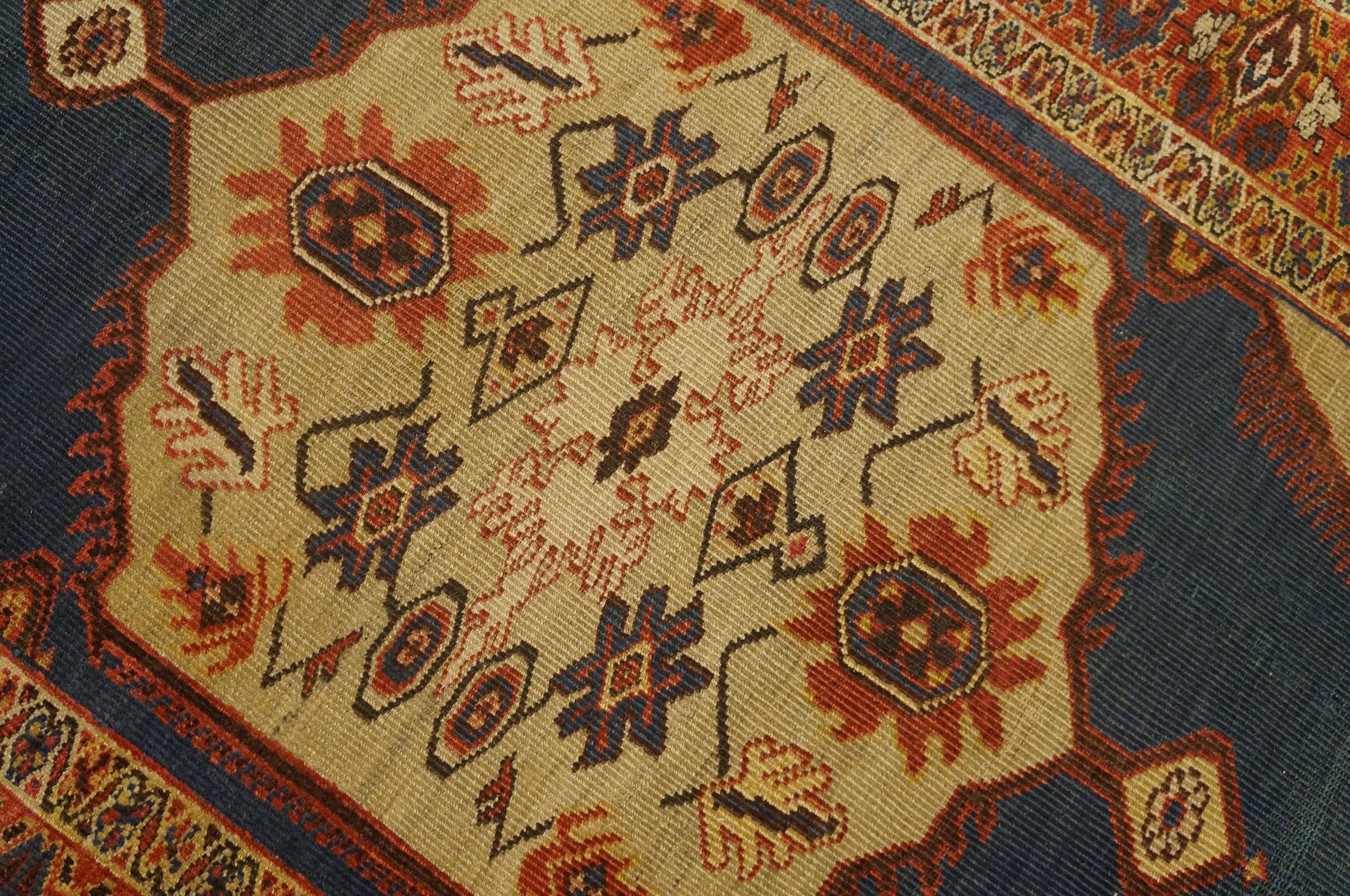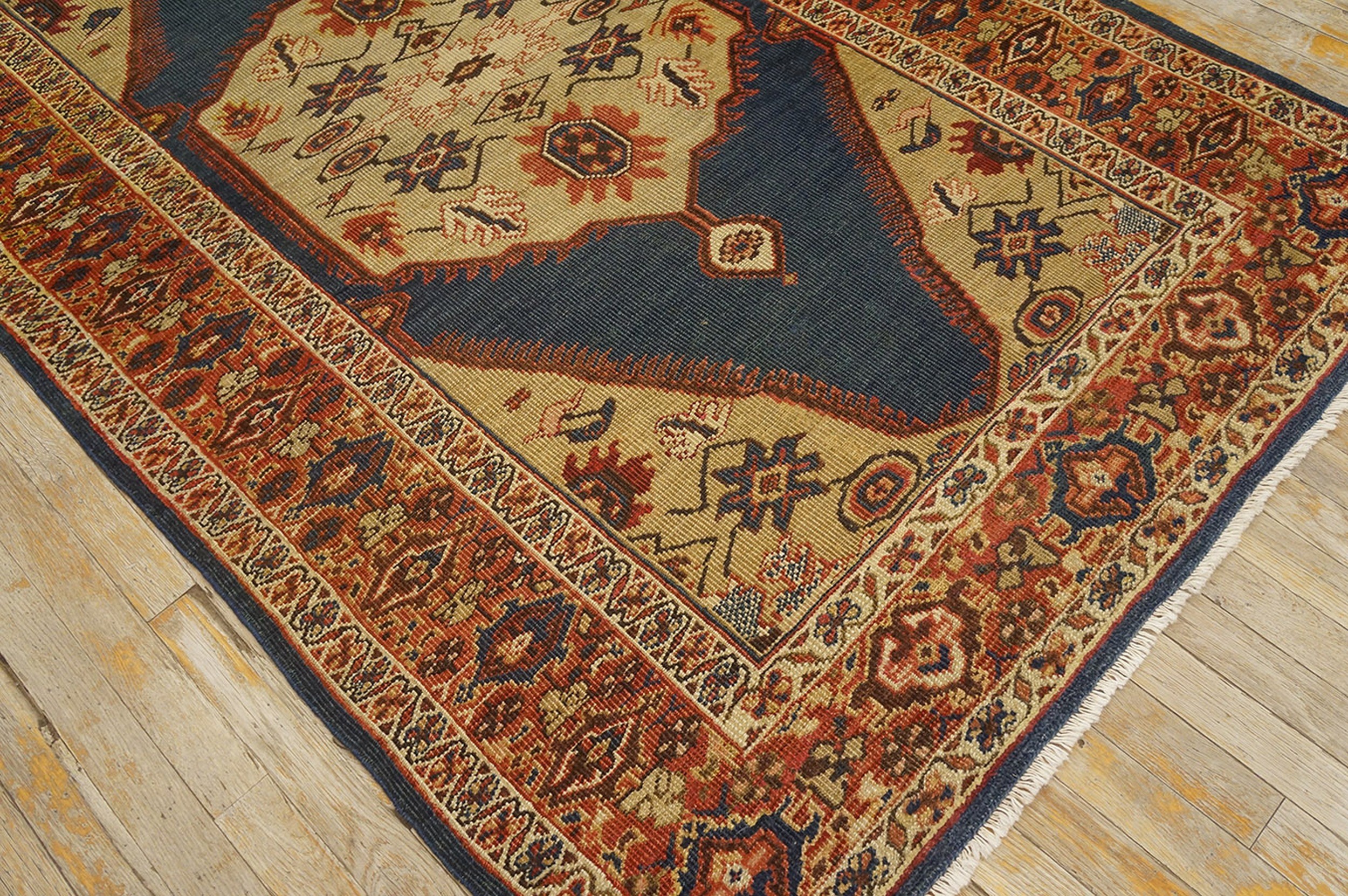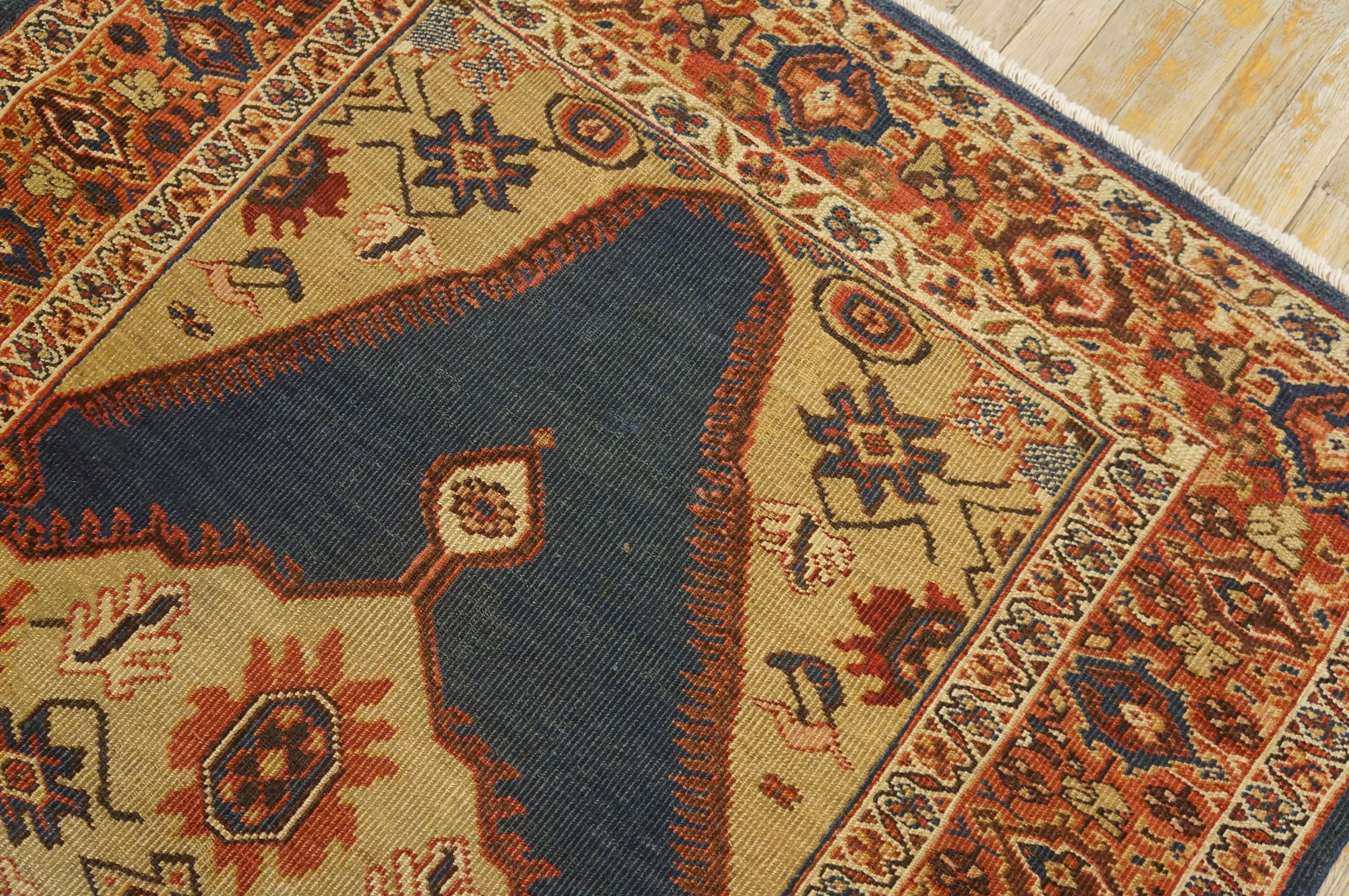 The borders act as a disciplined architectural frame, typically featuring a “Main Border” of alternating rosettes and scrolling “serrated” leaves. This frame “locks in” the explosive energy of the blue and cream center, providing a sense of historical permanence. To possess this small blue Sultanabad is to own a monument to nineteenth-century Persian excellence—a work that bridges the gap between grand architectural scale and intimate tribal art, transforming a small space into a sanctuary of historical gravity and rare, chromatic brilliance.