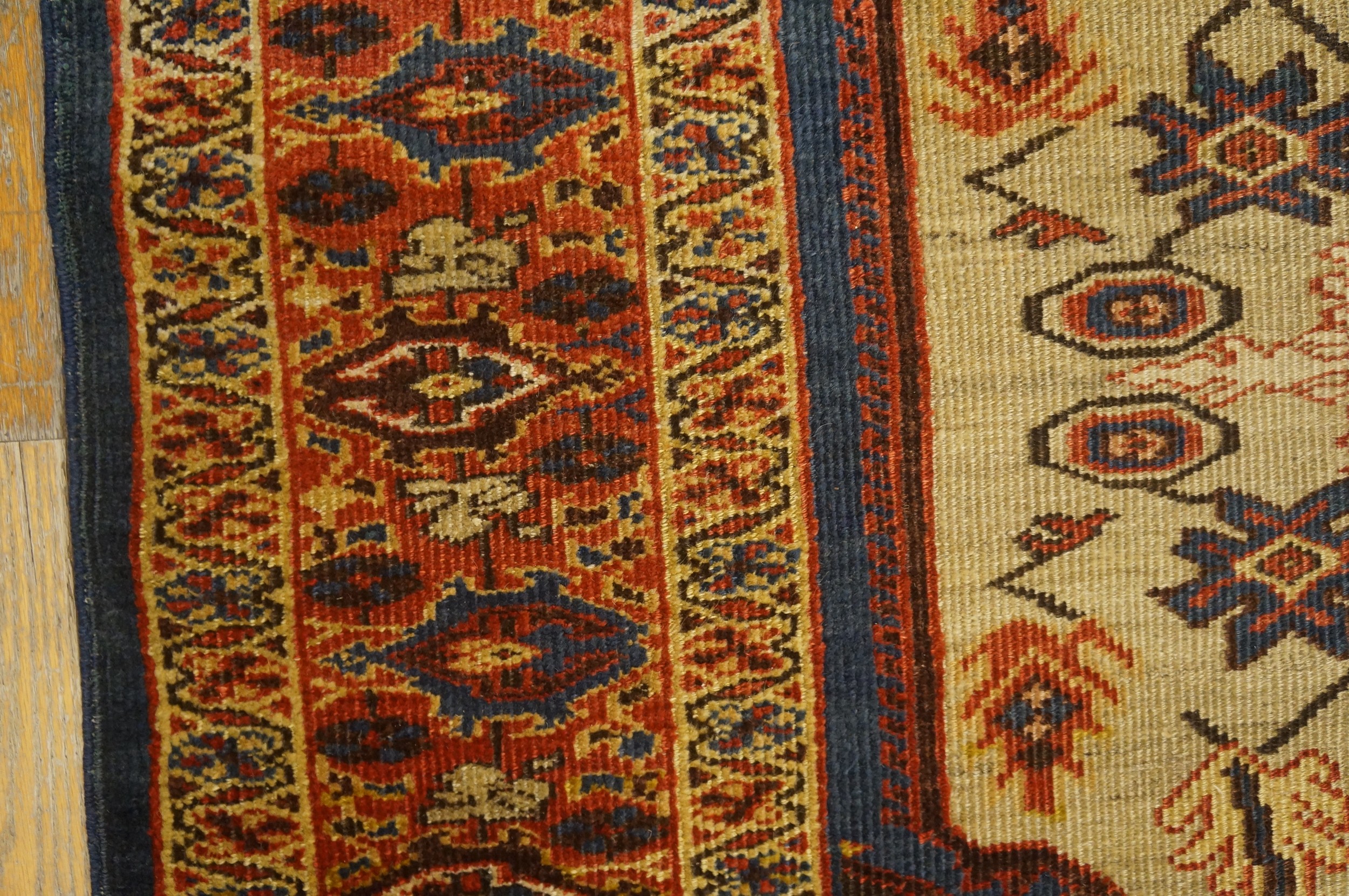 Technically, an antique Sultanabad is prized for its lustrous, “fleshy” wool and its substantial handle. Even in a small size, the rug retains a heavy, luxurious feel. The wool is rich in natural lanolin, which has allowed the fibers to develop a soft, matte patina over more than a century of use. The weave is characteristically supple, giving the rug a “drapery-like” quality that allows it to sit beautifully on a floor or hang with the presence of a fine painting.
