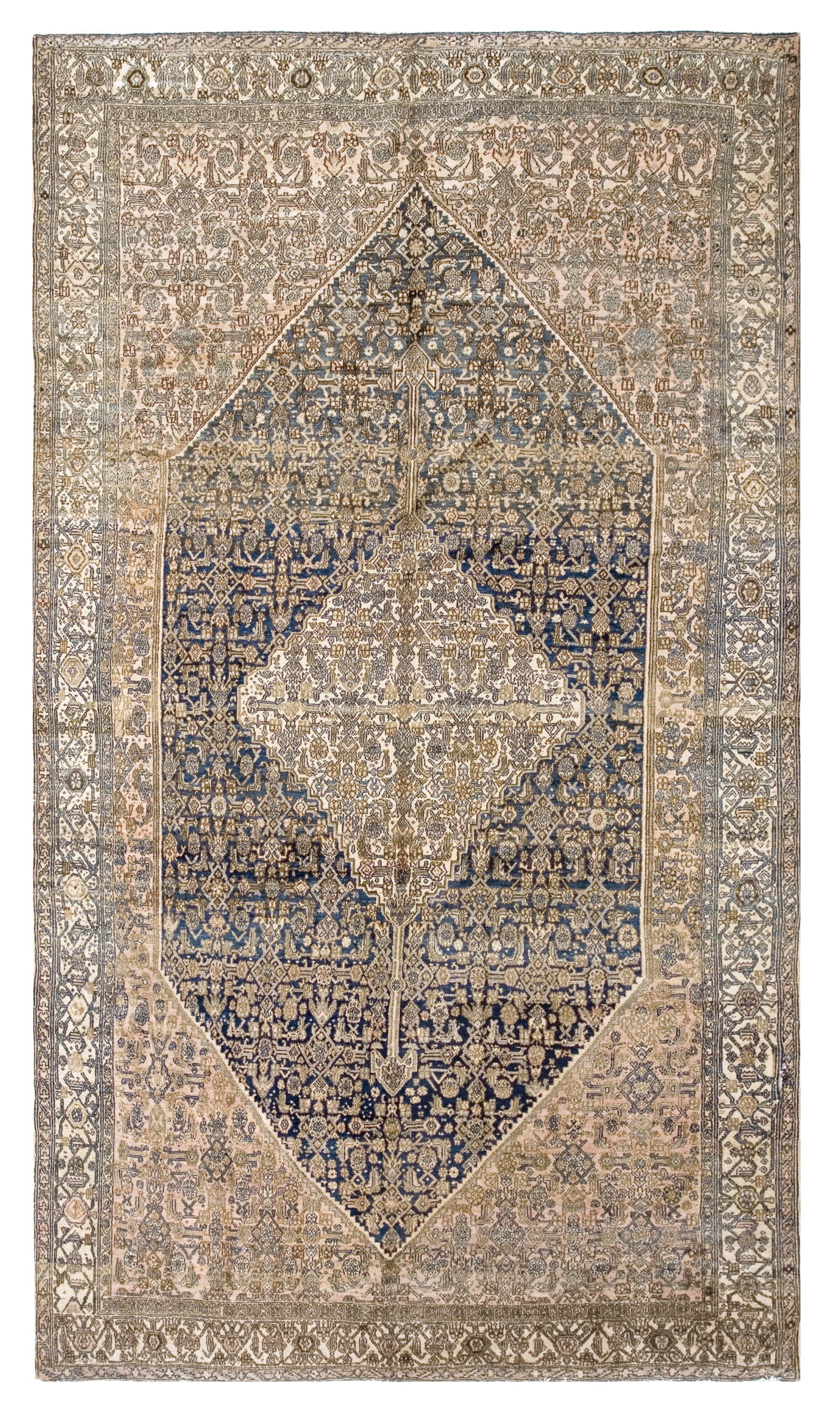 The masterful use of color is central to its appeal. A deep, saturated indigo dominates the central field, providing a striking contrast to the pale blush and cream tones of the spandrels and border. Such rich saturation, achieved through natural dyes, elevates this piece within the category of blue color rugs.