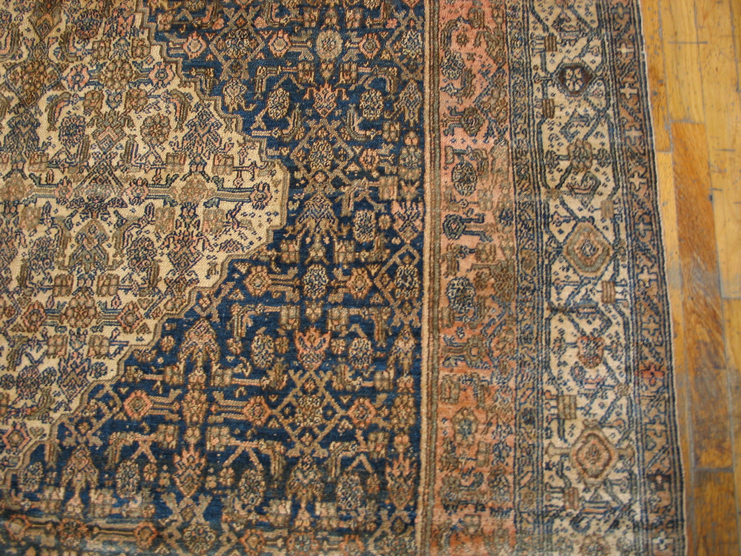 Antique Bibikabad Persian Blue 1920s Rug, Circa Date: 1920s. This exceptional example of bibikabad weaving presents a classic central medallion structure set against a field of complex, finely drawn arabesques. The composition immediately establishes its pedigree among high-quality antique rugs of the early 20th century.
