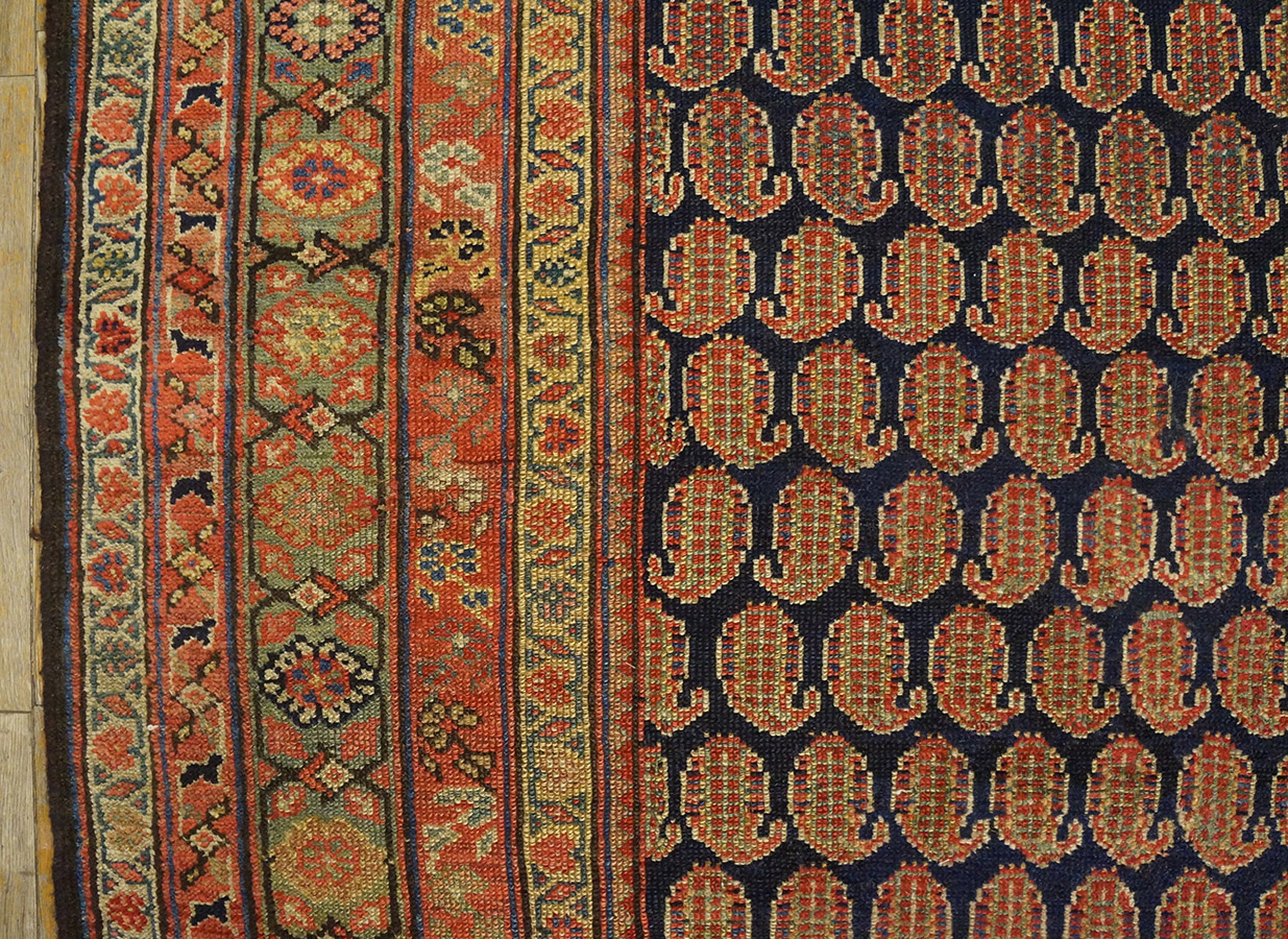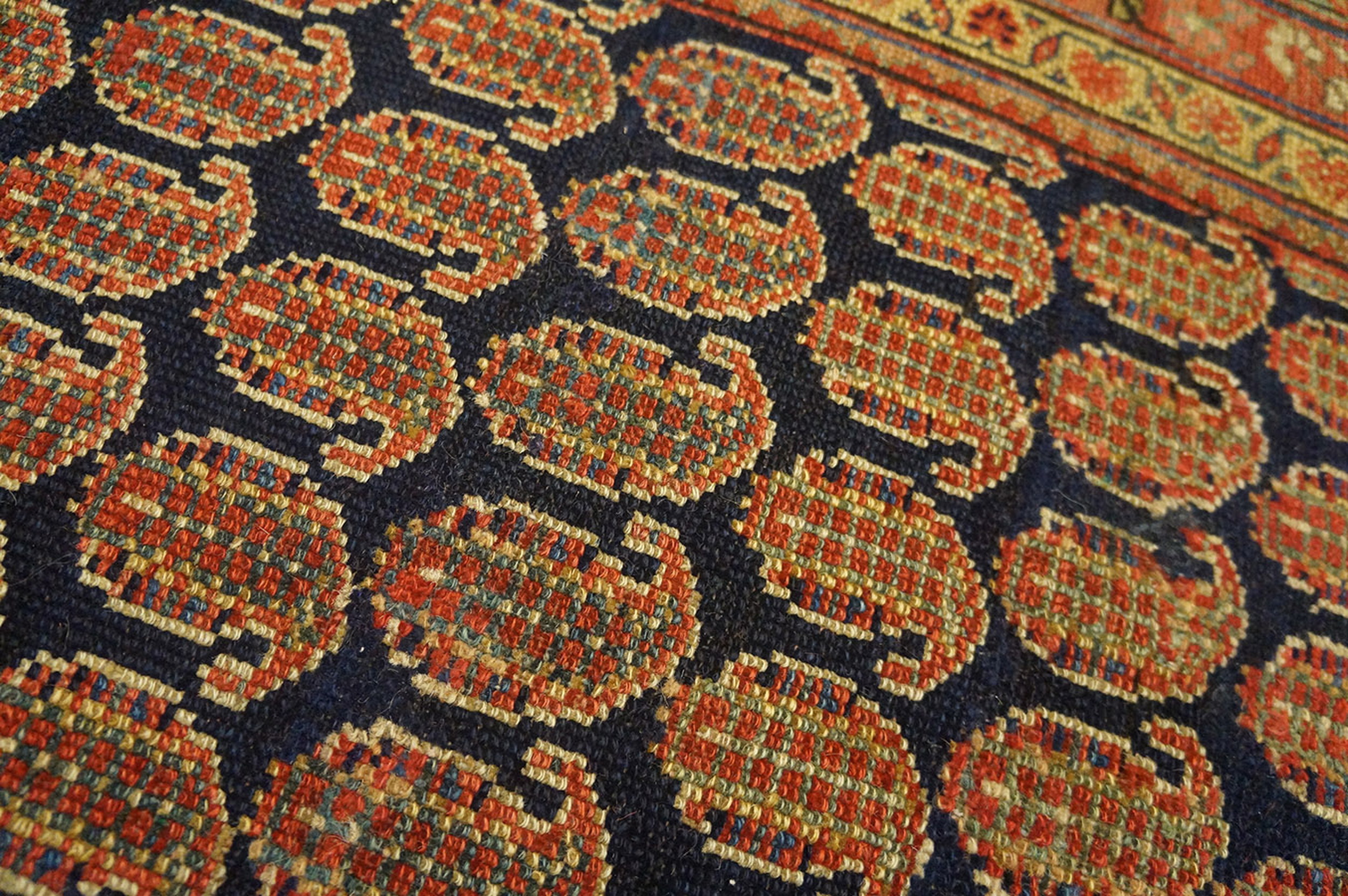 The central field features a highly organized and dense repetition of the classic boteh (paisley) motif. This consistent arrangement creates a dynamic, textural flow across the surface, classifying the design as a sophisticated allover rugs pattern. The boteh elements themselves are rendered in warm, cochineal-derived reds and browns, offering necessary warmth against the cool depth of the field.