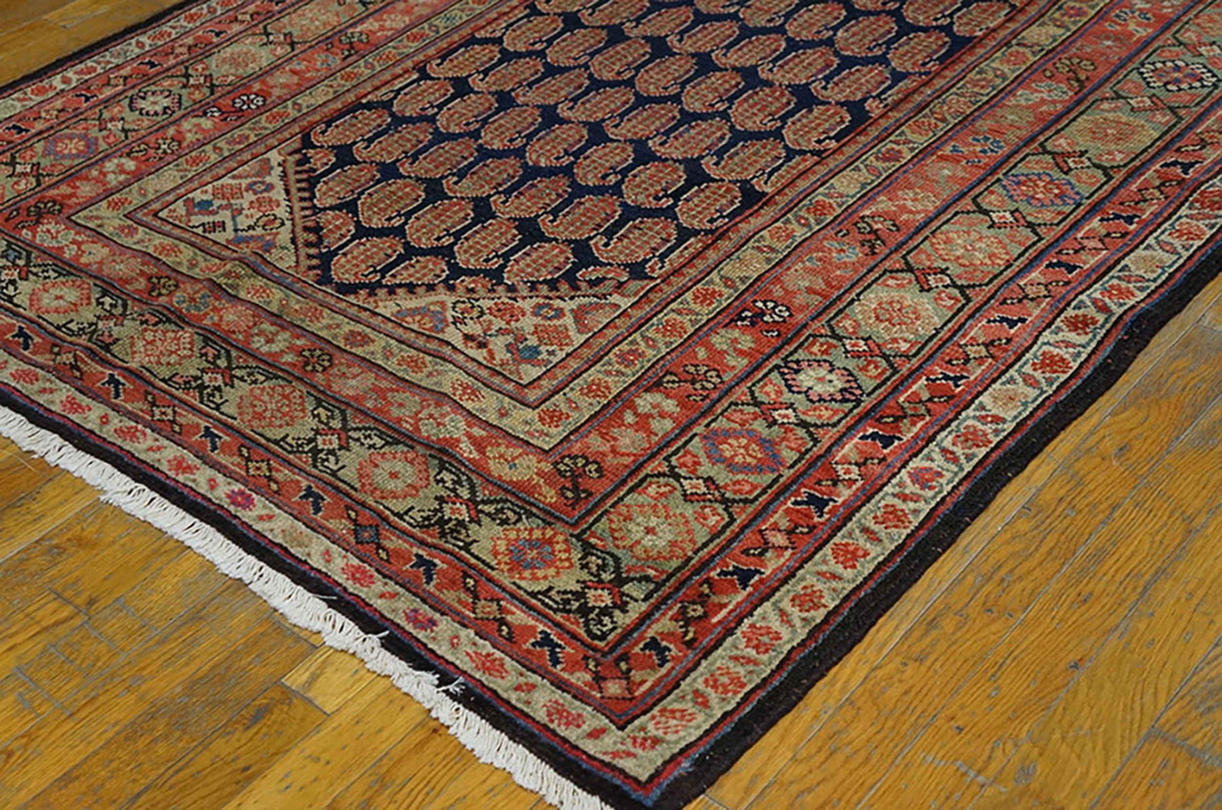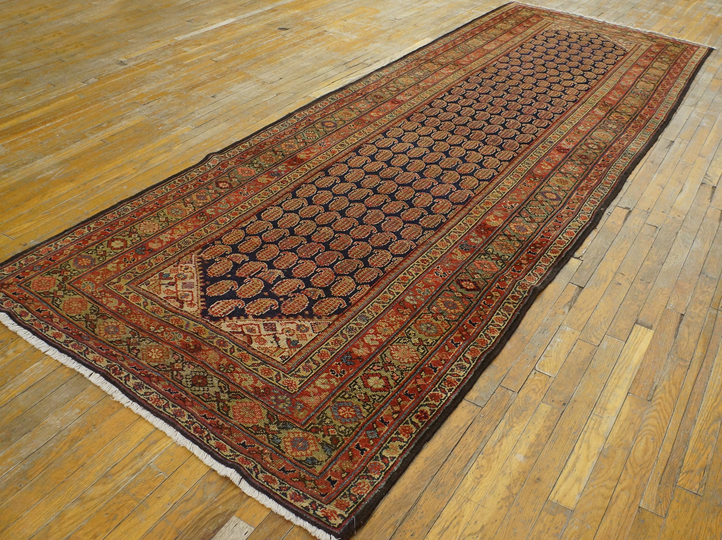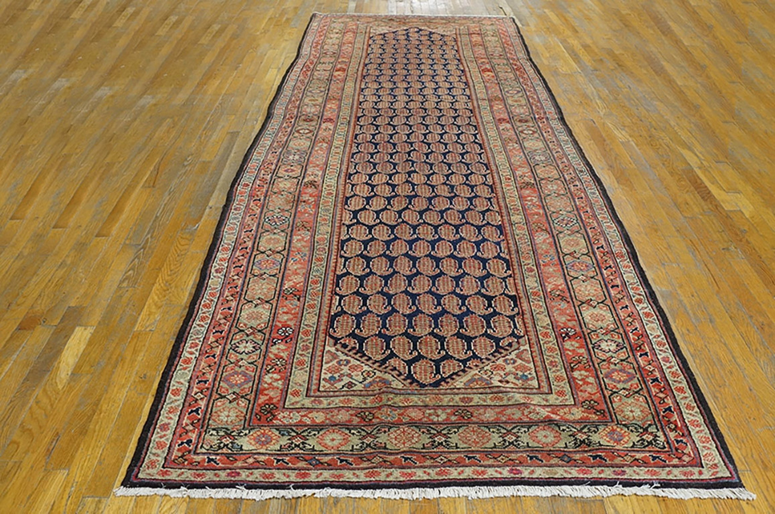 Antique Malayer Hallway Runner Wool Blue Rug, Country of Origin: Iran / Persia, Circa Date: 1890s. This exceptional piece is a testament to the enduring quality of Iranian / Persian rugs. Woven in the Malayer region, known for its finely knotted textiles, this runner represents a superb example of antique rugs from the Qajar era, showcasing remarkable preservation for a textile dating to the late 19th century.