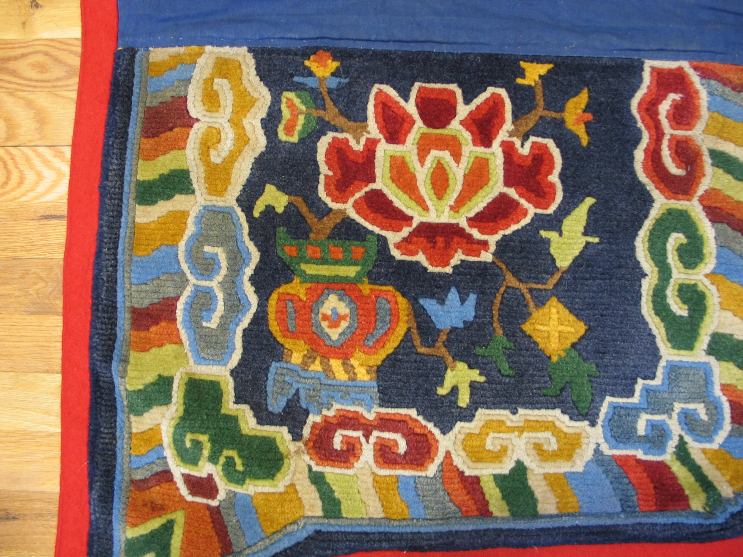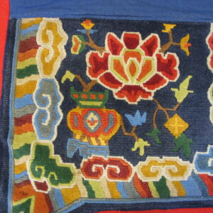 The palette is anchored by a magnificent Indigo Blue foundation. In Chinese rugs and textile weaving tradition, blue is often associated with the element of wood and the coming of spring, but practically, indigo was prized for its depth and its ability to age into a soft, shimmering “abrash.” The clouds and borders are likely rendered in contrasting tones of bone ivory, warm apricot, and soft gold. Because this is an antique set, the colors have developed a sophisticated matte patina, where the indigo shifts between midnight and cerulean depending on the pile’s direction and the play of light.