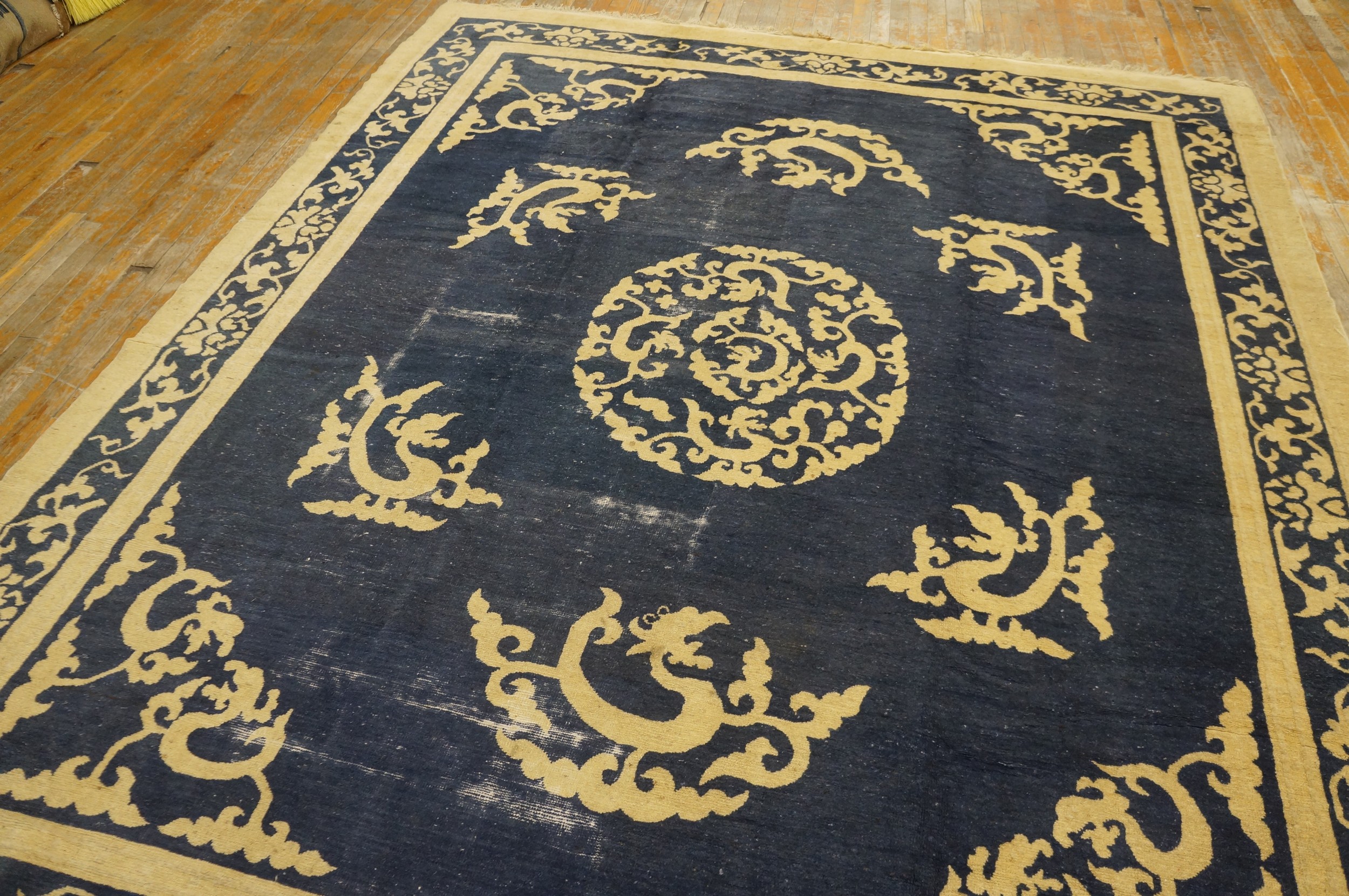 Traditional Chinese iconography is subtly integrated throughout the composition, featuring stylized mythological creatures—perhaps dragons or chi-lin—emerging from cloud bands in the corners and flanking the central element. This piece represents a high point in the production of antique rugs from the Peking region, combining traditional symbolism with a modern, uncluttered sensibility favored by Western markets.