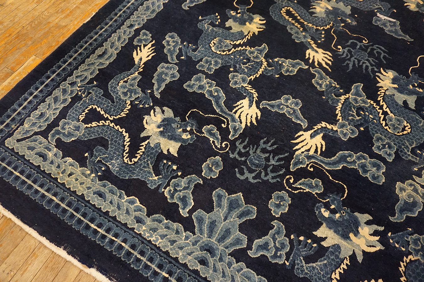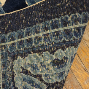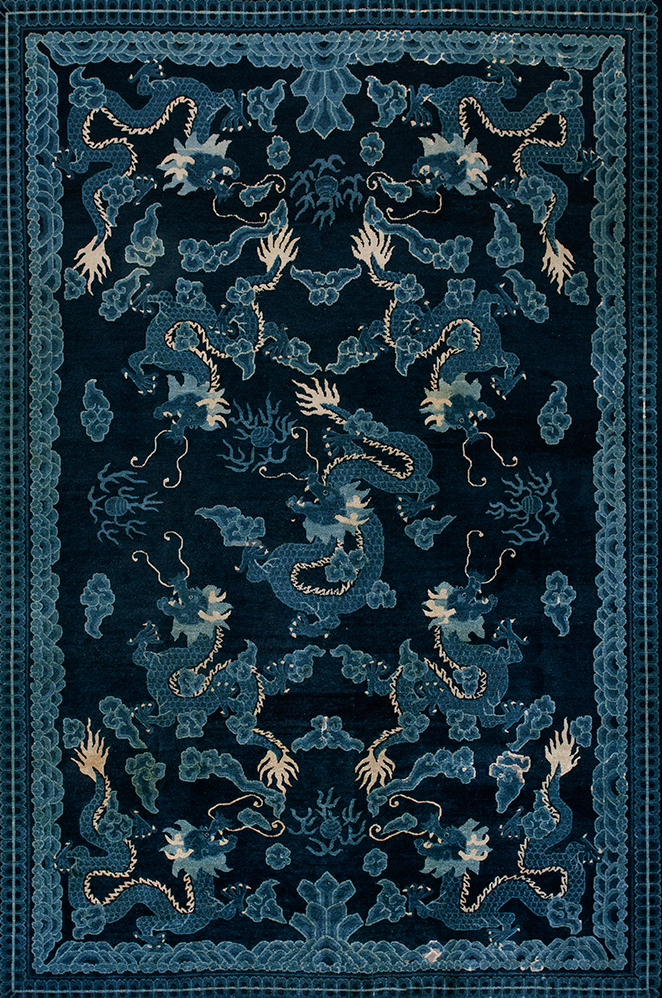 The borders act as a continuation of the celestial theme, typically featuring a “waves and mountain” (lishui) pattern or a sophisticated “Meander” (Fret) border that symbolizes longevity and the infinite. This structural frame grounds the kinetic energy of the central dragon, providing a sense of classical permanence. To possess an antique blue Peking dragon rug is to hold a monument to Chinese cultural history—a work that transforms the floor into a sprawling, hand-wrought myth, capturing the timeless elegance and mystical power of the East.