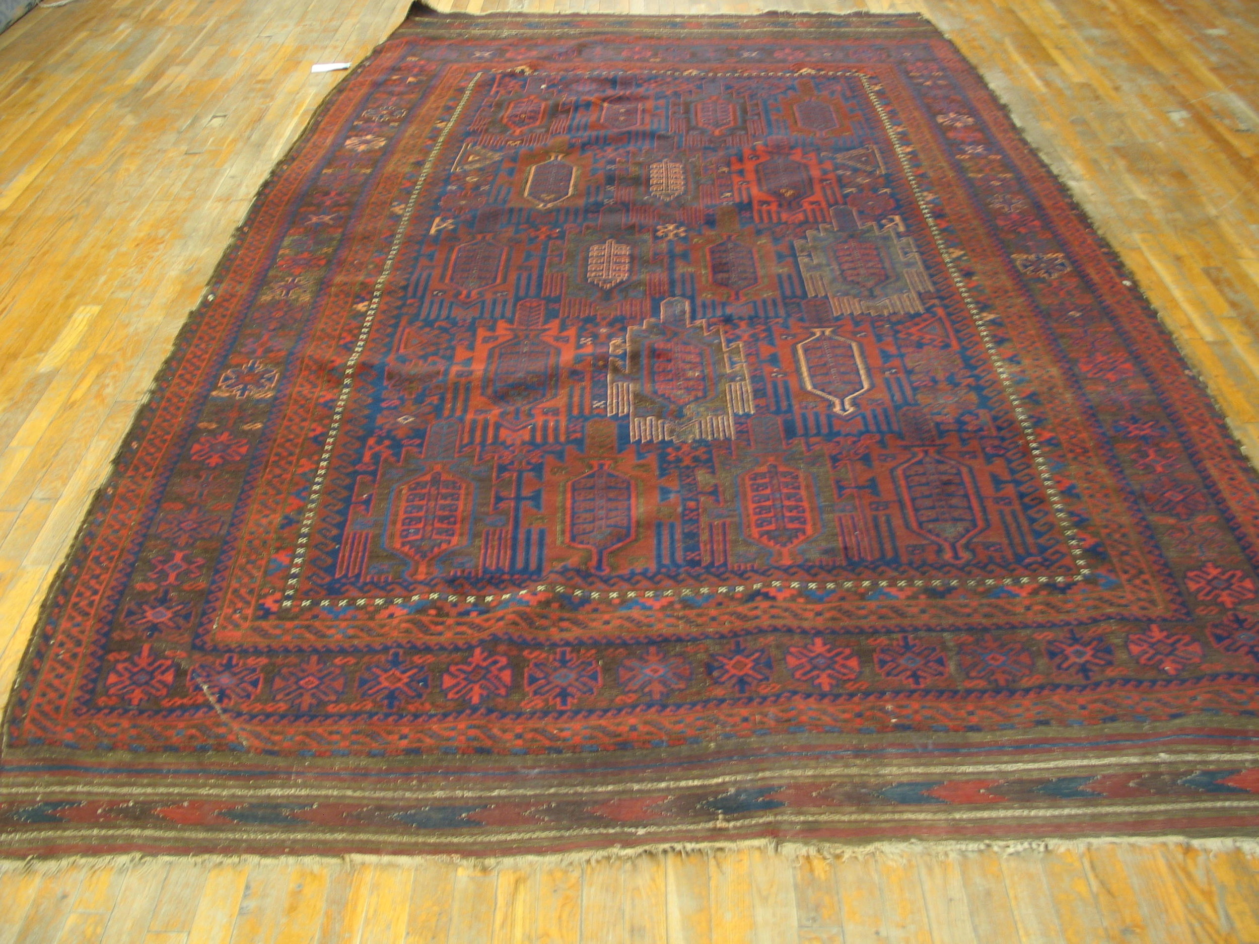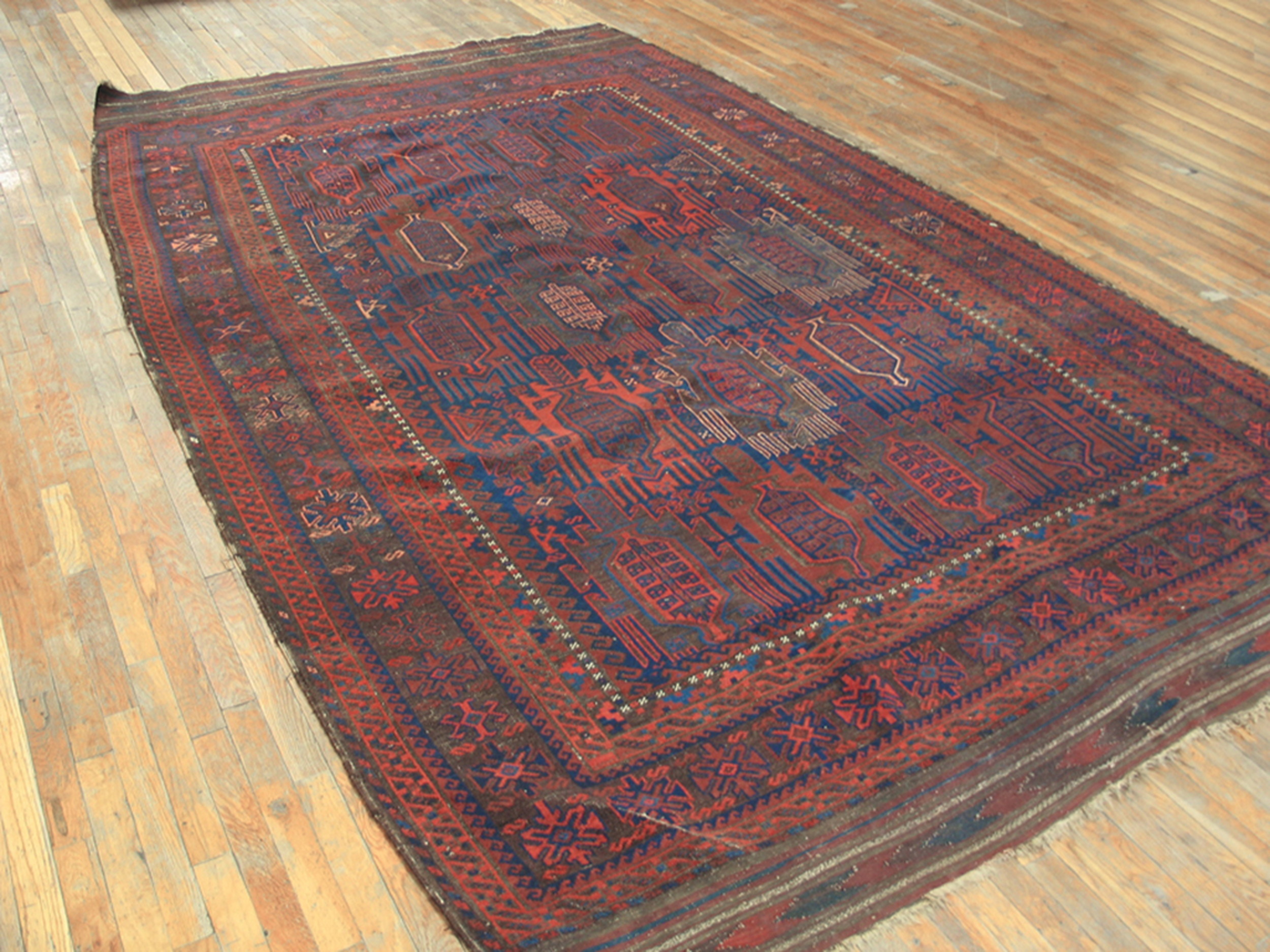 Antique Baluch Afghanistan Blue 1870s Rug, Country of Origin: Afghanistan, Circa Date: 1870s. This exceptional example of nomadic weaving belongs to the corpus of highly collectible antique rugs produced by the Baluch tribes of Central Asia. The dense knotting and deep saturation immediately confirm its authenticity as a piece dating from the late 19th century.