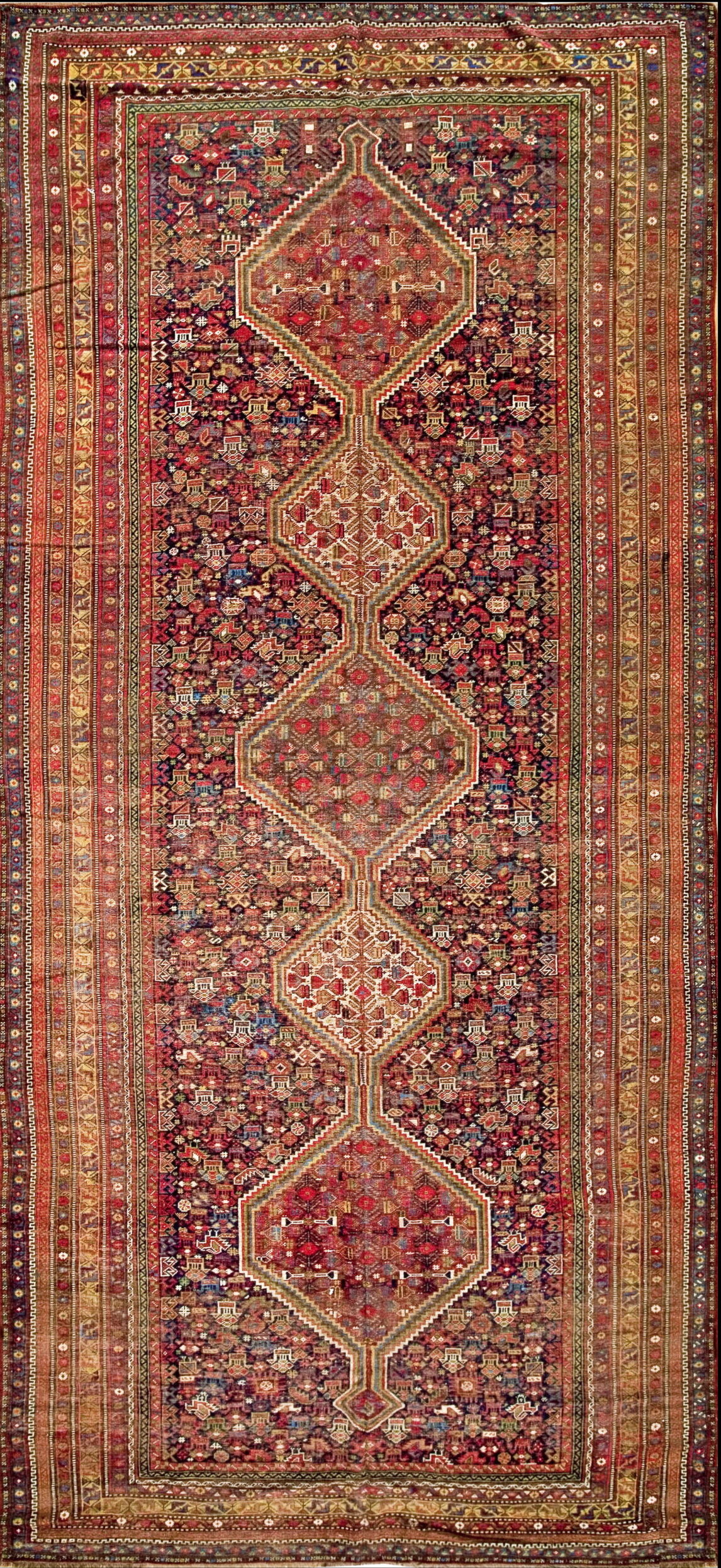 The central design features a powerful vertical axis composed of three linked, stepped diamond medallions, a characteristic tribal arrangement that draws the eye along the length of the carpet. Despite its narrow proportion, the official designation as a room size rugs suggests its intended use as a central, grounding element in a traditional space, offering both visual weight and historical context.