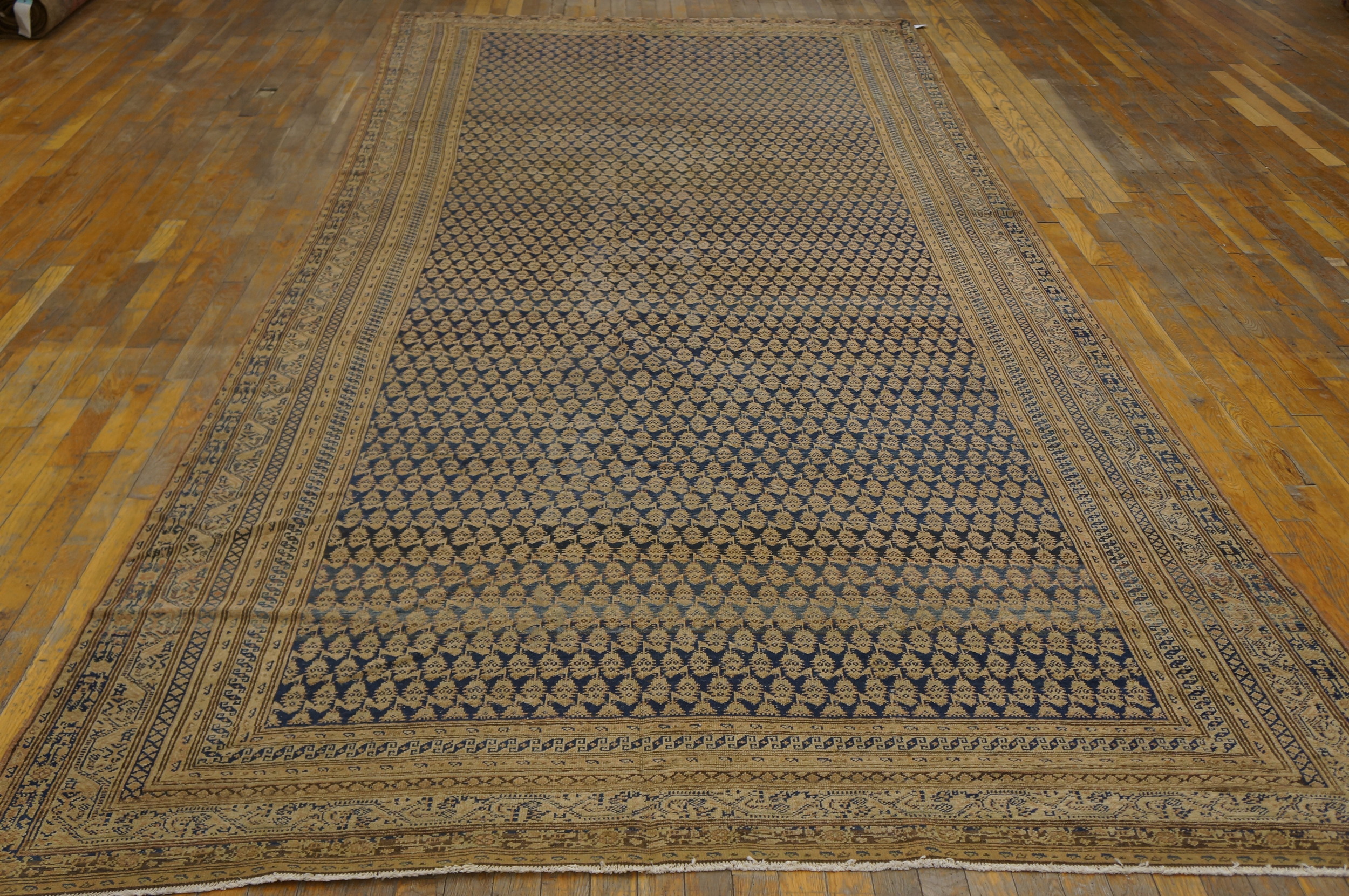 Measuring generously, this Malayer is ideally suited for grand spaces, offering the scale and presence expected of room size rugs. The natural patina acquired over a century of careful use softens the contrast between the blue and beige, resulting in a refined, sophisticated floor covering perfect for anchoring a traditional or transitional setting.