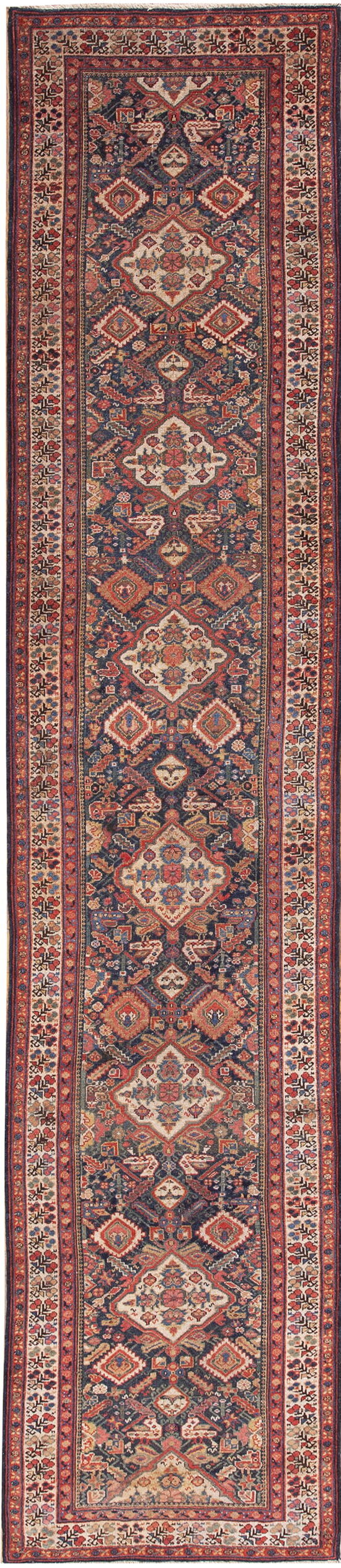 Serab, located in the Azerbaijan province of Northwest Persia, is a key center in the history of Iranian / Persian rugs. This specific runner showcases the regional preference for earth tones combined with powerful, saturated blues, reflecting the traditional aesthetic of the region. Its age and pristine condition make it a valuable acquisition for collectors seeking authentic, high-quality nomadic textiles.