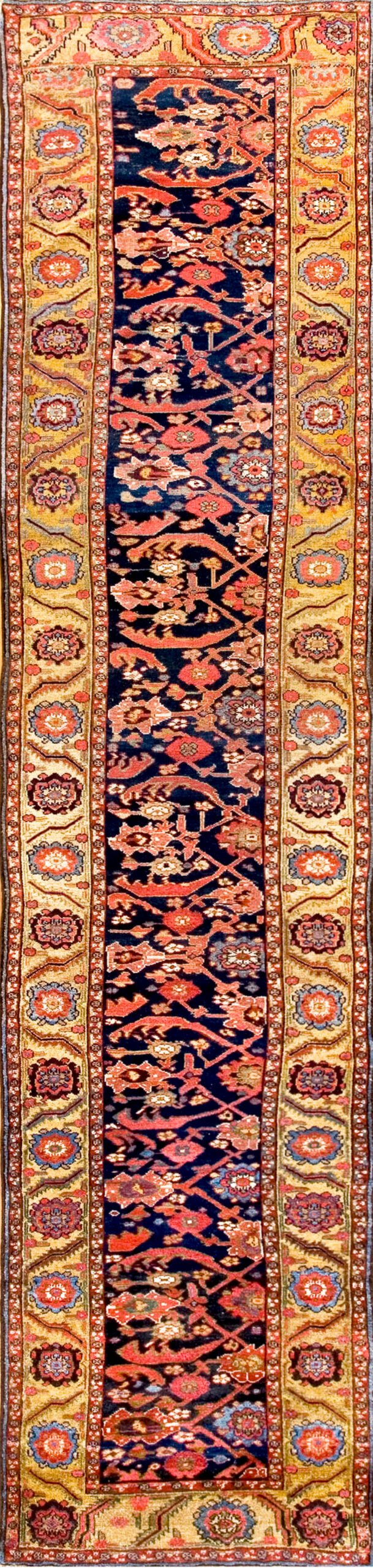 This blue tribal mid-19th century antique Northwest Persian hallway runner rug is a striking testament to the bold graphic language and enduring craftsmanship of mid-1800s Persian rugs. Originating from the Northwest Persian tradition, this runner embodies a powerful combination of tribal design energy and timeless decorative appeal — making it an exceptional choice for both collectors of antique area rugs and modern interiors alike.